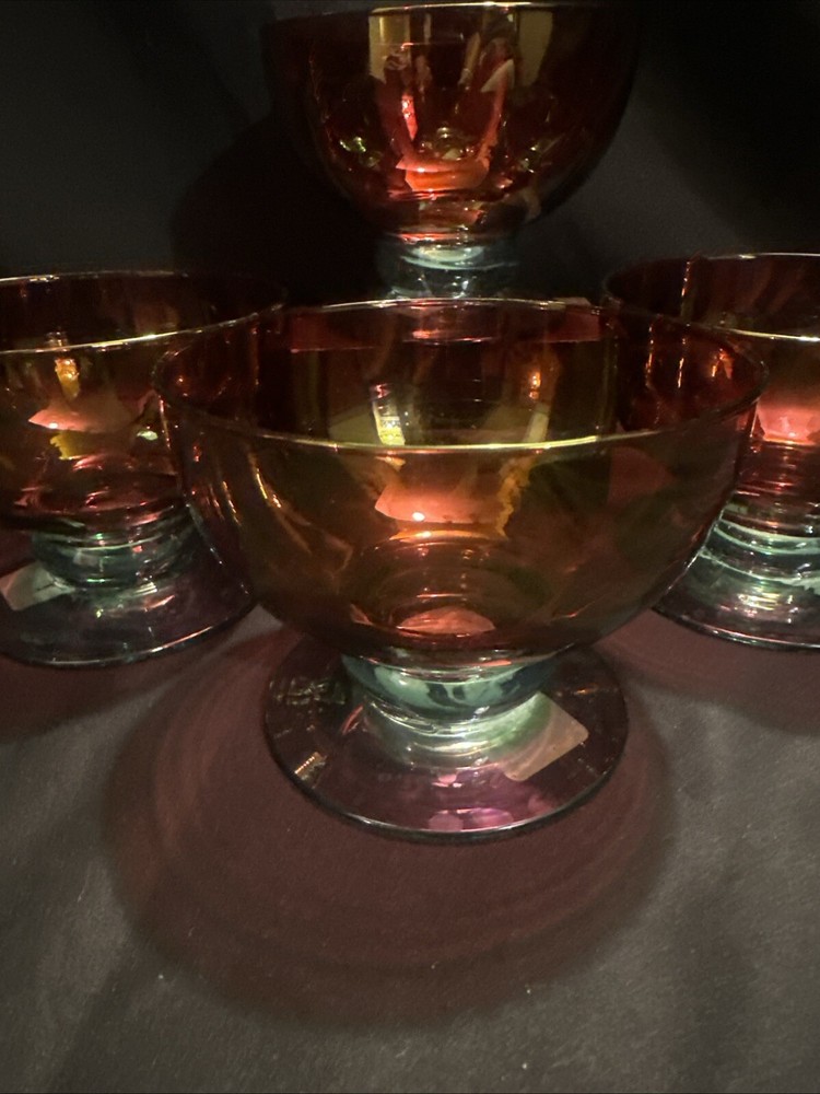 Elevate your dessert experience with this vintage Dillards iridescent 20 oz ice cream dish. Handcrafted with hand-blown glass production techniques, this dish showcases an eclectic style with a multicolor opalescent glass production style that adds a touch of uniqueness to your table setting. Perfect for serving your favorite desserts, this round dish has a capacity of 20 oz and is made of glass, making it durable and long-lasting. Originating from Mexico, this unmarked dish is perfect for those who love vintage glassware. The dish is not antique and is ideal for those who appreciate the beauty of vintage dishes. Whether you are hosting a dinner party or enjoying a quiet evening at home, this ice cream dish is perfect for adding a touch of sophistication to your table setting.