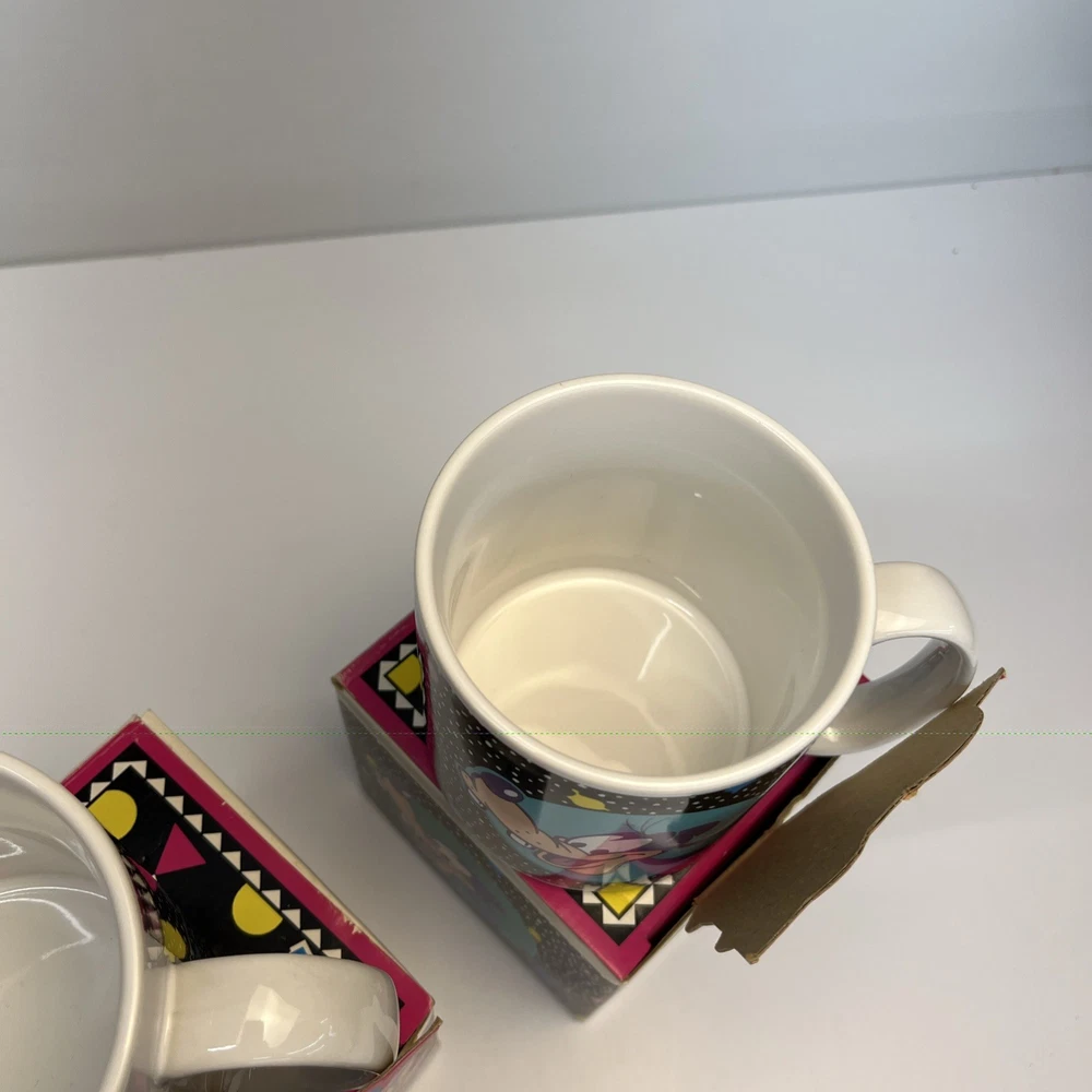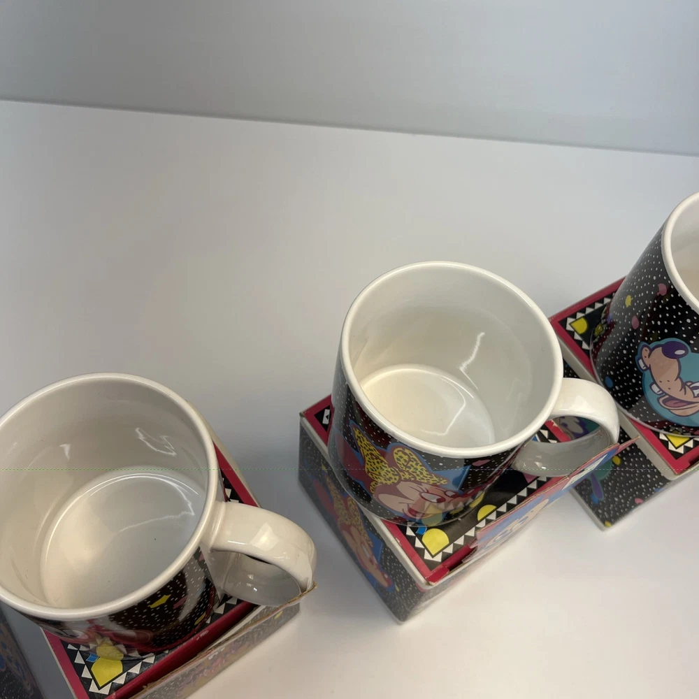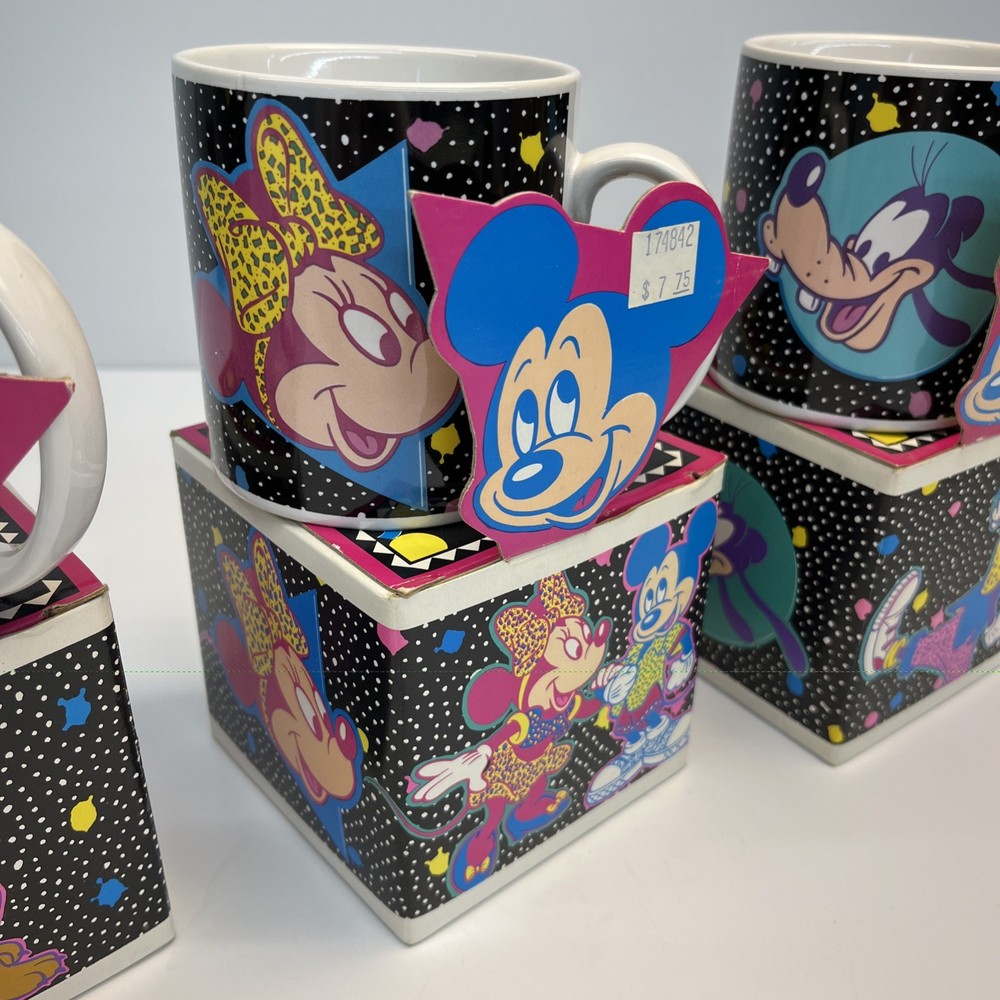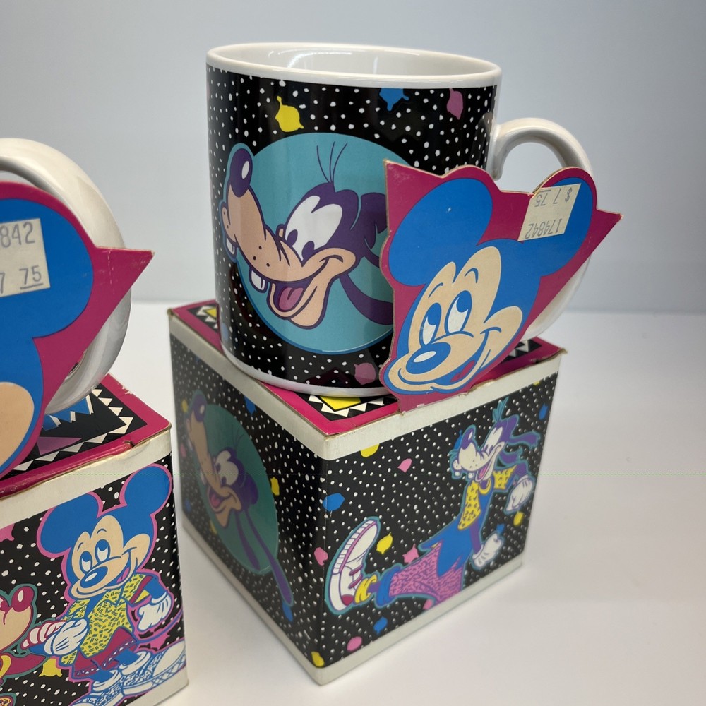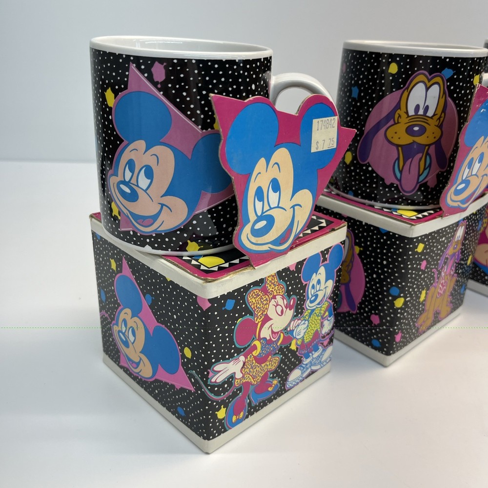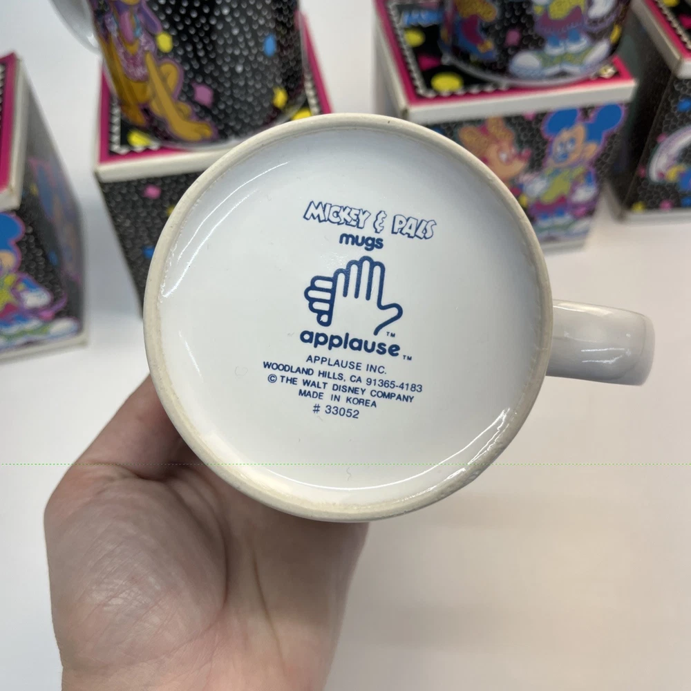 Vintage Disney ceramic mug set by Applause Inc. Includes 4 mugs featuring Mickey Mouse, Minnie Mouse, Pluto, and Goofy. Marked “Mickey & Pals Mugs” on the base. Applause Inc., Woodland Hills, CA. © The Walt Disney Company. Made in Korea. Each mug includes its original decorative cube box with character artwork. All items appear complete as shown. Condition Vintage pre-owned condition. Mugs show light surface wear consistent with age and normal handling. No visible cracks or chips noted. Boxes show edge wear, scuffing, and storage wear.