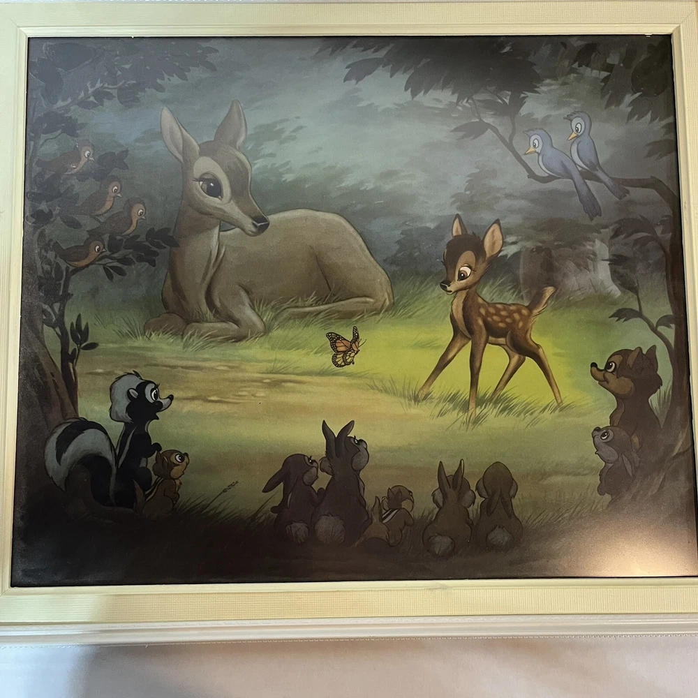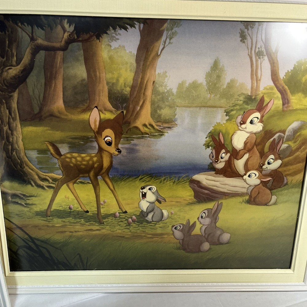 Few marks on the frames see pics These 2 beautiful framed art features Disney's Bambi meeting his friends in the forest. The vintage design is perfect for any Disneyana collector or fan of the beloved character. The piece measures 20 x 24 inches and is in great shape, ready to be displayed in your home or office. The art captures the essence of Disney's magic, showcasing the beauty of the forest and the joy of Bambi's adventure. The piece is a must-have for any fan of the franchise and is sure to be a conversation starter in any room. Add this amazing piece to your collection today!
