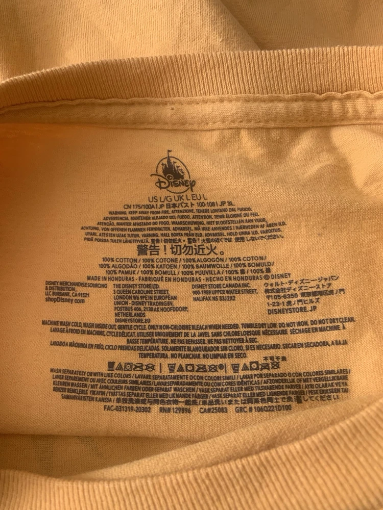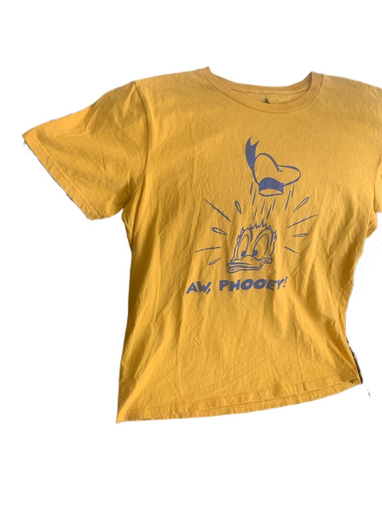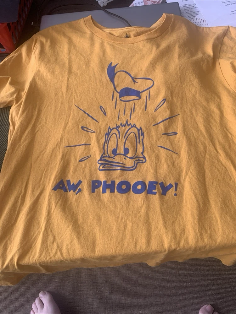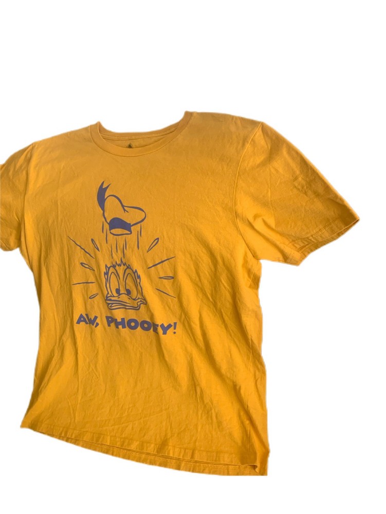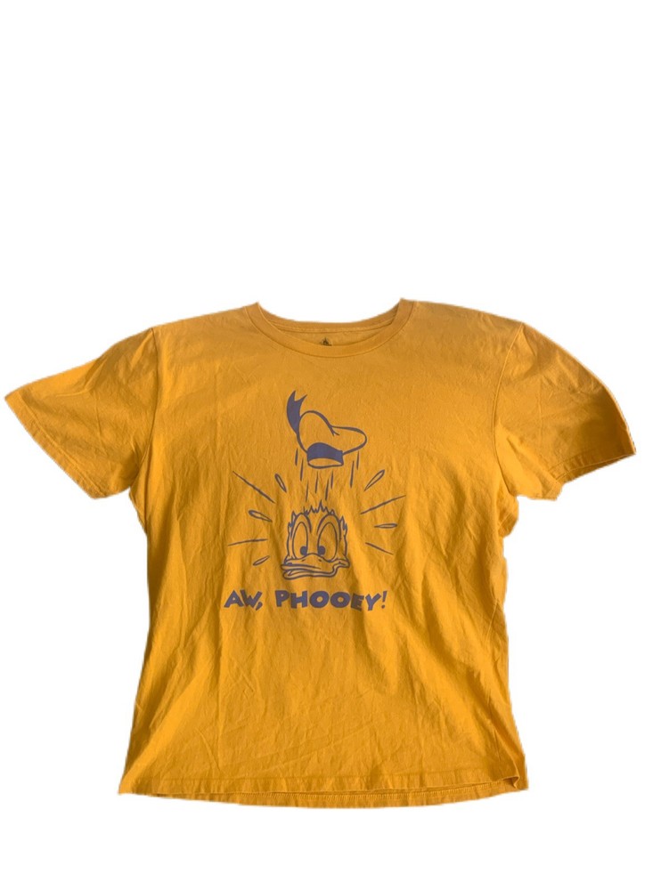 This is a pre-owned men's Disney World Donald Duck "Aw Phooey" graphic t-shirt in size large. The shirt features a multicolor graphic print of Donald Duck on a crew neck tee with short sleeves. It is machine washable and part of the Disney character family theme. The shirt is branded by Disney and has a regular fit, suitable for all seasons. All measurements are approximate with item resting. Back Collar Bottom 27” Pit to Pit 21” Shoulder to Cuff 8” The item is thoroughly washed/cleaned as per the manufacturer's guidelines before shipment. See my other listings for more stuff you didn’t know you needed.
