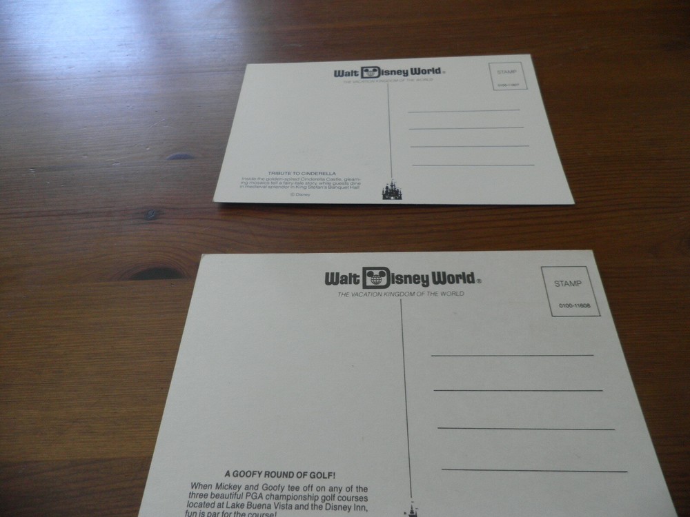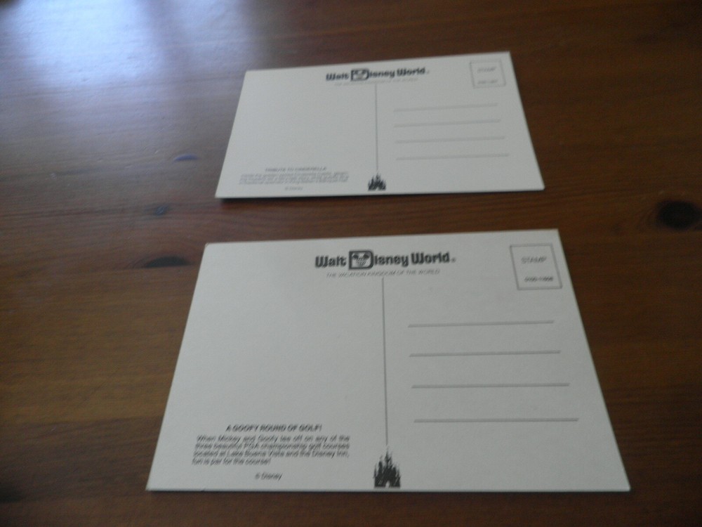 2 VINTAGE WALT DISNEY WORLD POSTCARDS A GOOFY ROUND OF GOLF TRIBUTE TO CINDERELLA I LISTED THEM AS NEW AS THEY WERE NEVER USED PLEASE ZOOM OVER PICTURES SOLD AS IS $12.00 SHIPPING $6.00