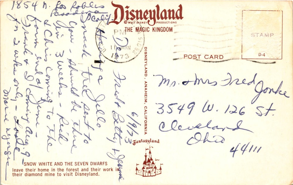 MAKE AN OFFER. THE MORE YOU BUY THE BETTER DEAL I WILL ACCEPT The postcard features Snow White and her friends visiting Disneyland in Anaheim, California. The postcard is addressed to Mr. Fred Jonke in Cleveland, Ohio. The postcard is dated June 9, 1973, and mentions Fantasyland and The Magic Kingdom at Disneyland.