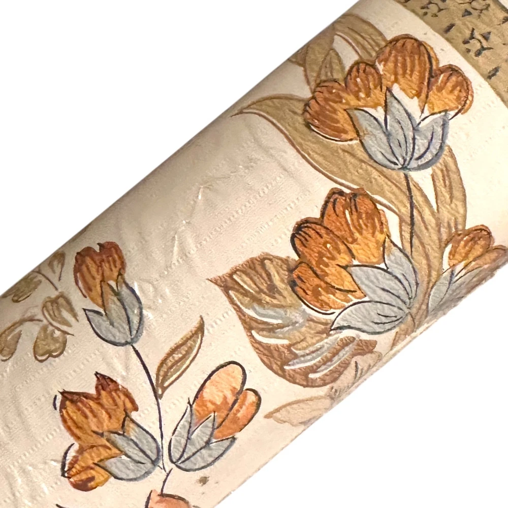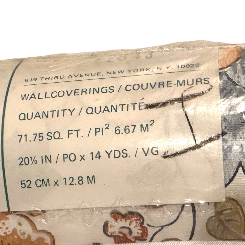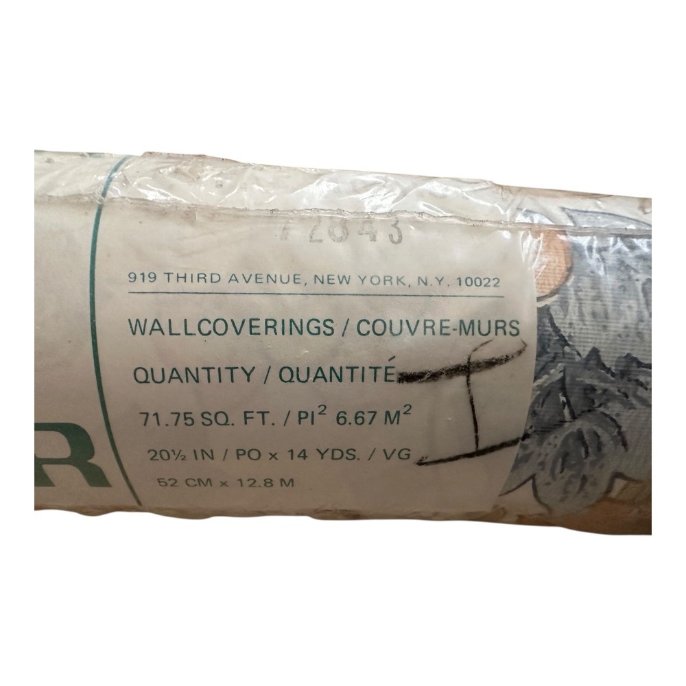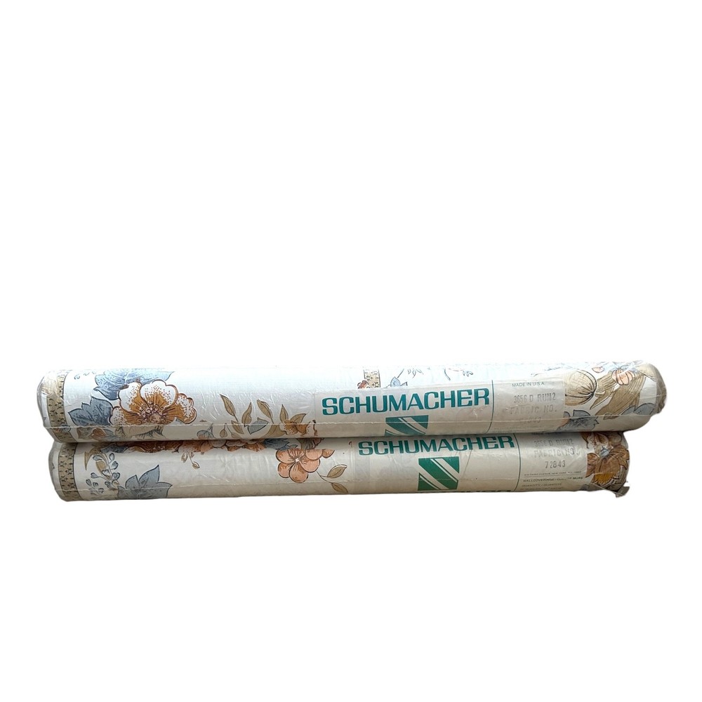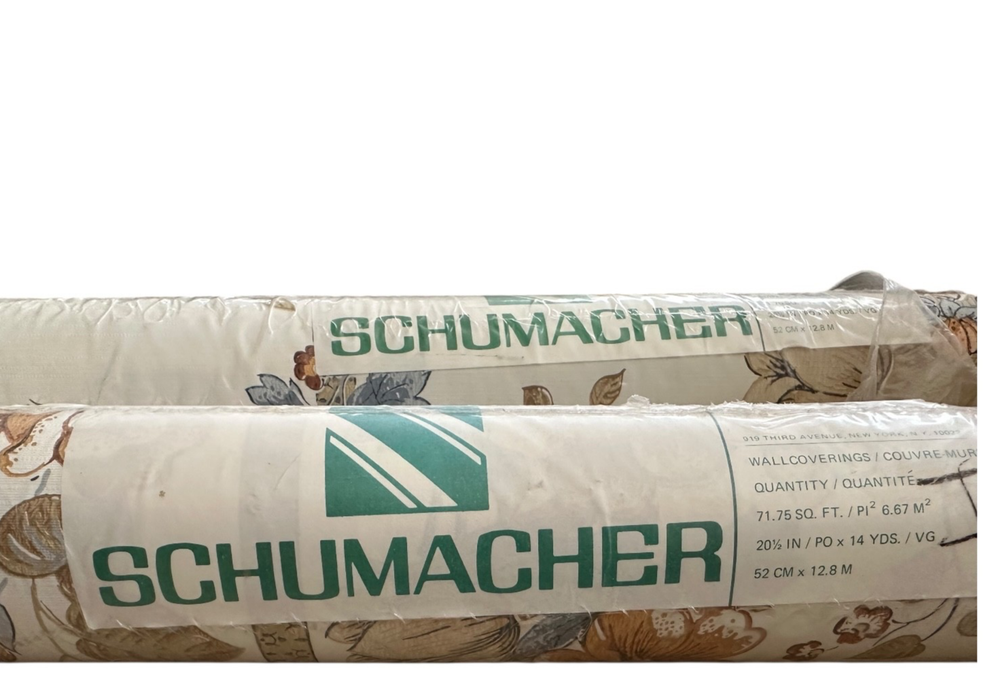 1970s era Vintage Schumacher Wall Covering Fabric No. 72843 Run: 3656D | Made in USA double roll. Classic 1970s Schumacher floral print in soft tones of taupe, ivory, tan, blue-gray, and rust. Pattern features a stylized botanical trail with painterly florals – ideal for traditional, cottagecore, or grandmillennial interiors. This is a beautiful, rare vintage wallpaper ideal for accent walls, framed art, furniture lining, or period restoration. packaging uses both imperial and metric units and bilingual labeling (“Wallcoverings / Couvre-murs”), it likely dates to the late 1970s when Schumacher distributed in North America and Canada. It has since become part of Schumacher’s heritage archive – essentially a collector’s item . 2 Double rolls available. Schumacher is a premier American design house known for its high-end wallpapers and fabrics since 1889. This wall covering is part of their now-discontinued archival collection, manufactured at their 919 Third Avenue location in New York. Dimensions: 71.75 square feet (6.67 m²) 20½ inches wide × 14 yards long (52 cm × 12.8 m) 1 unopened/sealed double roll Condition: New old stock (NOS) Factory sealed in original packaging Stored in climate-controlled environment – clean, no odors, no fading Please refer to photos for close-up of pattern and label Schumacher is a premier American design house known for its high-end wallpapers and fabrics since 1889. This wall covering is part of their now-discontinued archival collection, manufactured at their 919 Third Avenue location in New York.