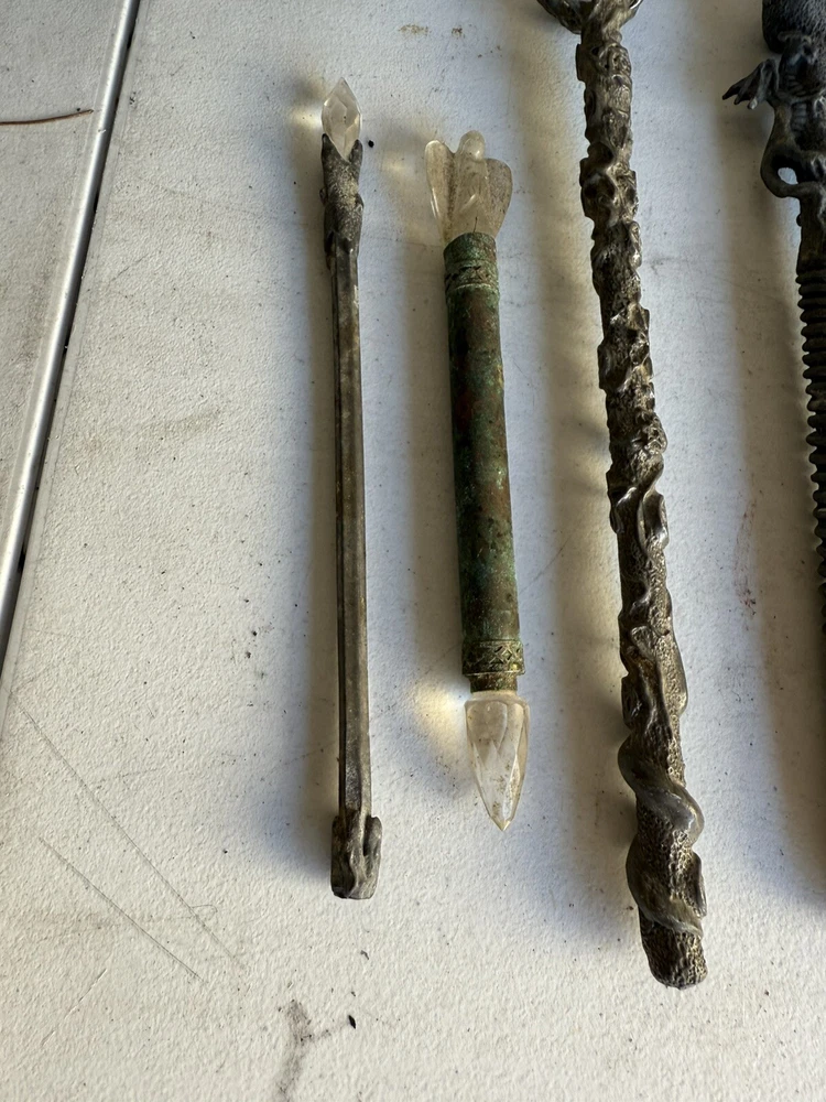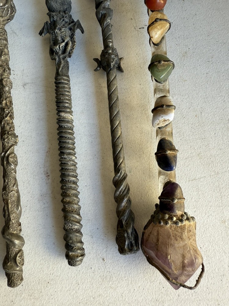 This lot comes as you see it. These are beautiful pieces with very detailed artwork on some of them, including the dragons and the stars on the stick. These are solid pieces. They are not hollow so the wands do have some weight to them Please look at all photos and ask any questions prior to purchase as all sales are final. There is no returns accepted. I am unsure exact age of these items, but as you can tell, they are definitely from an older timeframe, possibly 80s if not older.. iPhone in photo not included only used for size reference.