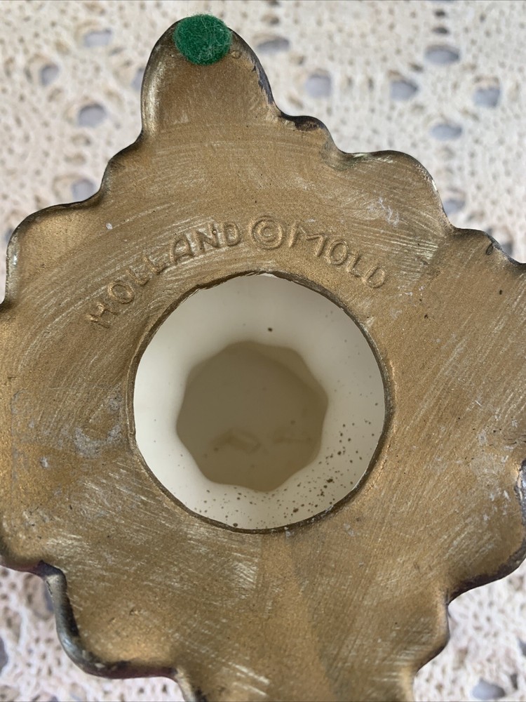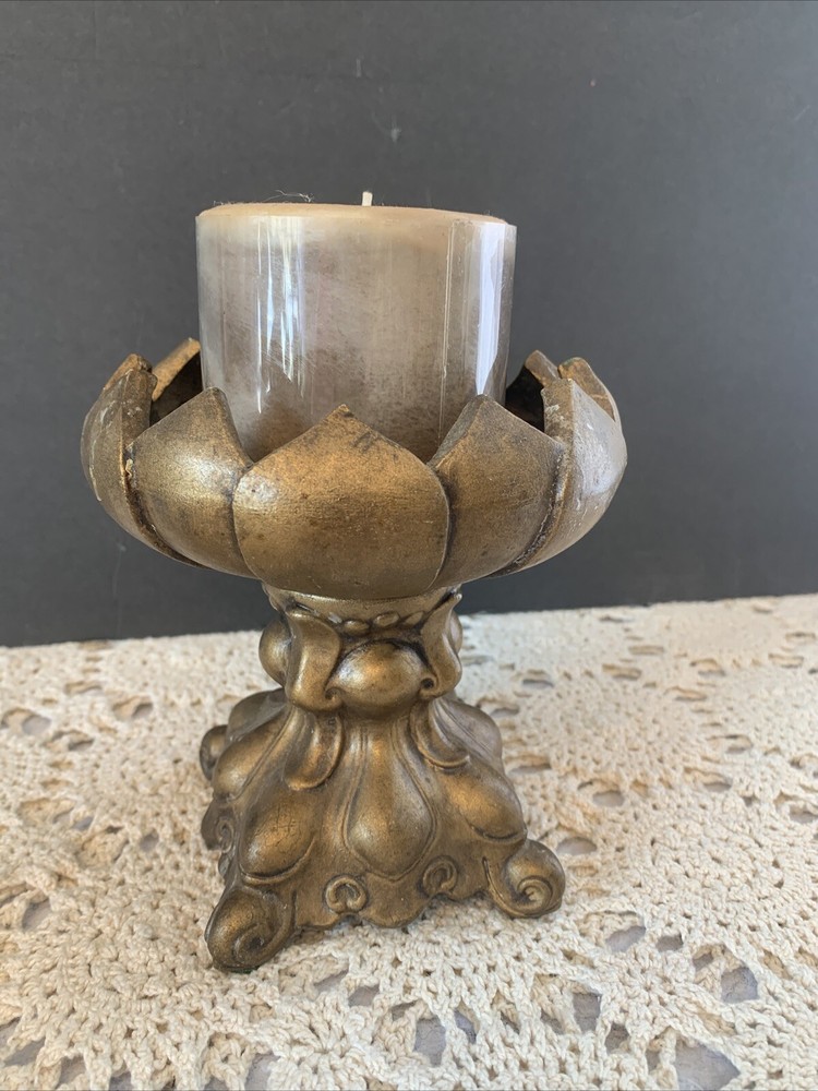Lotus flower design. 6 “ tall 6” diameter. Has a gold antiqued matte finish. Typical vintage signs of wear and use. No chips or cracks. Candle not included.