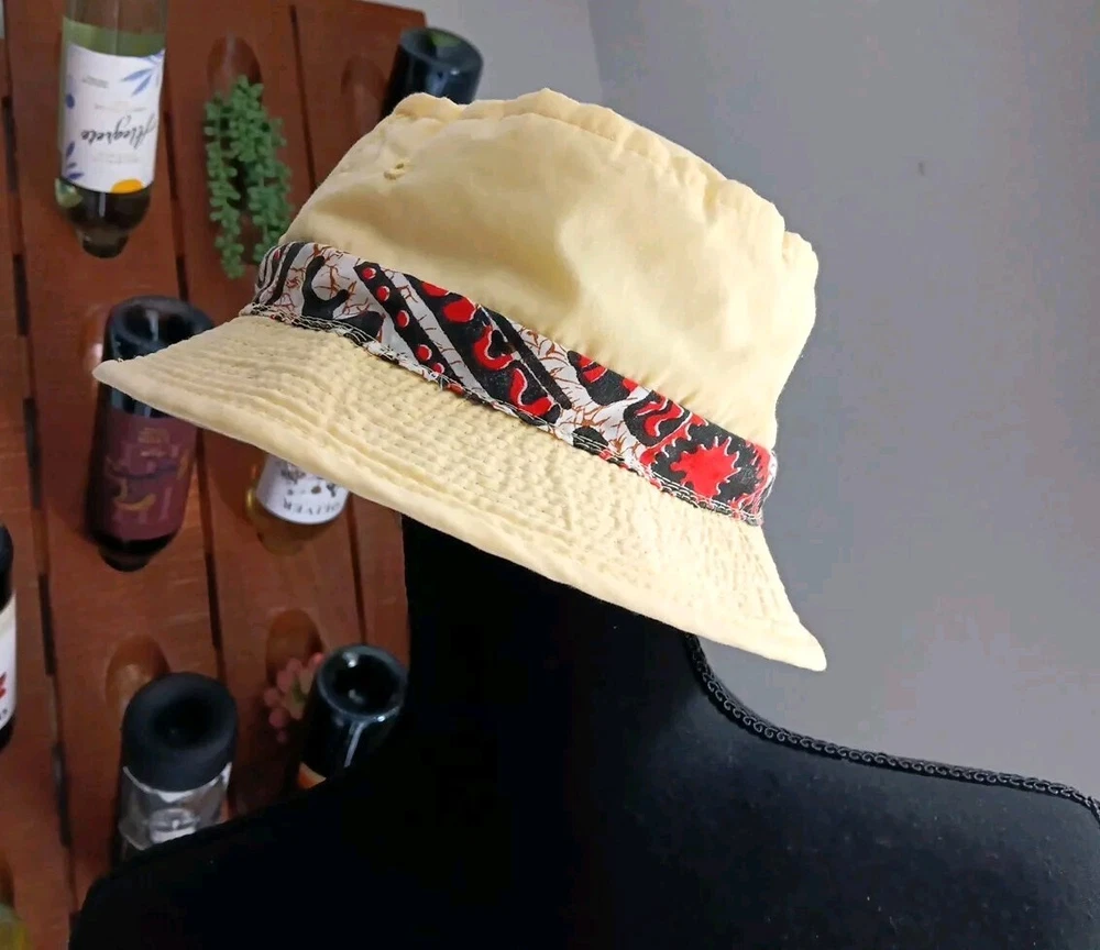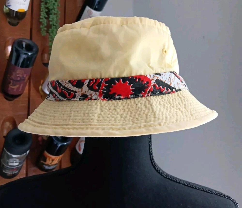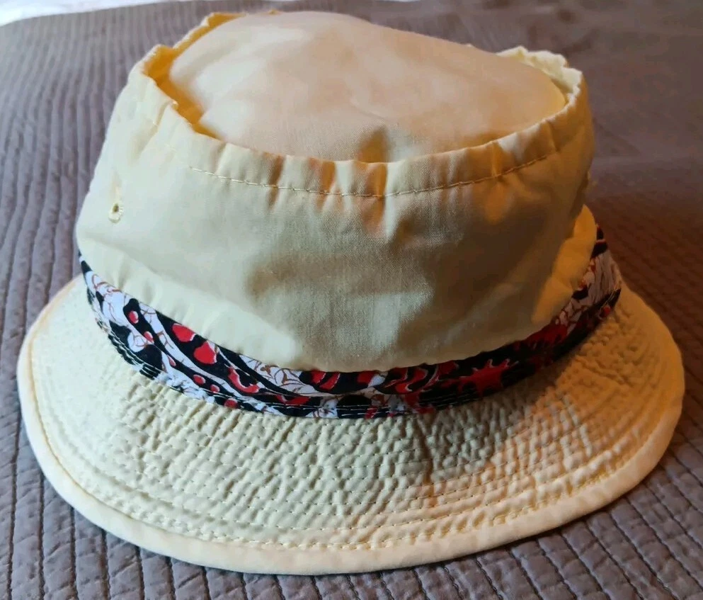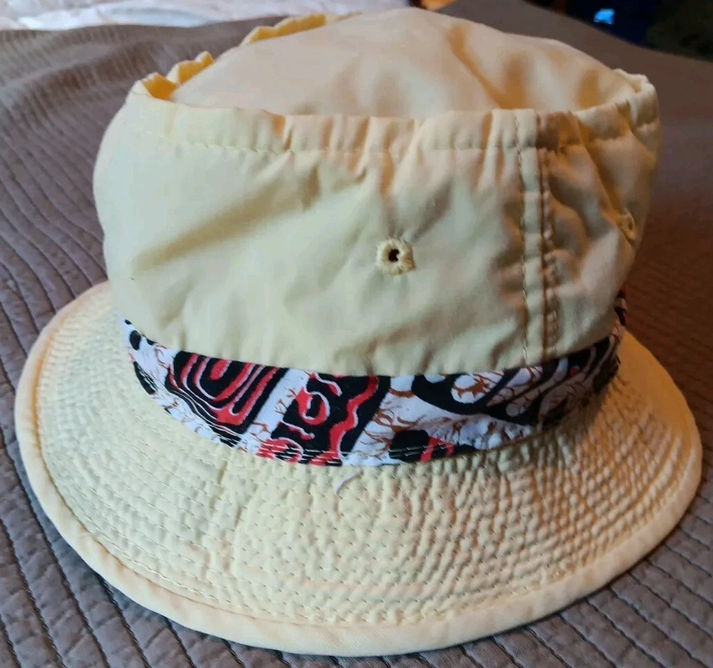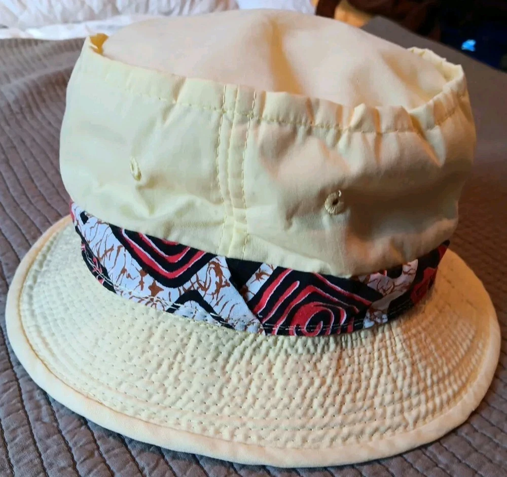 Great looking vintage yellow bucket hat with a geometric band. The inside says easy-to-roll, crushable & shape retaining. I found this to be true. After laundering, it came out great and retained its shape beautifully. There is very light staining on the inner band. Please see photos. The size is seven