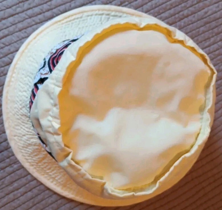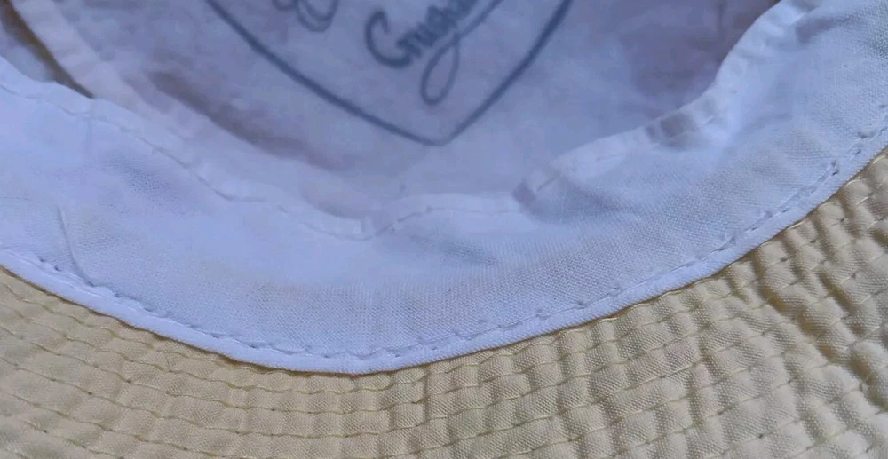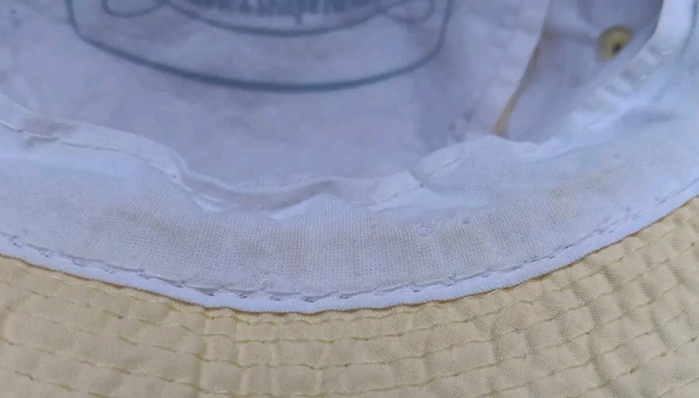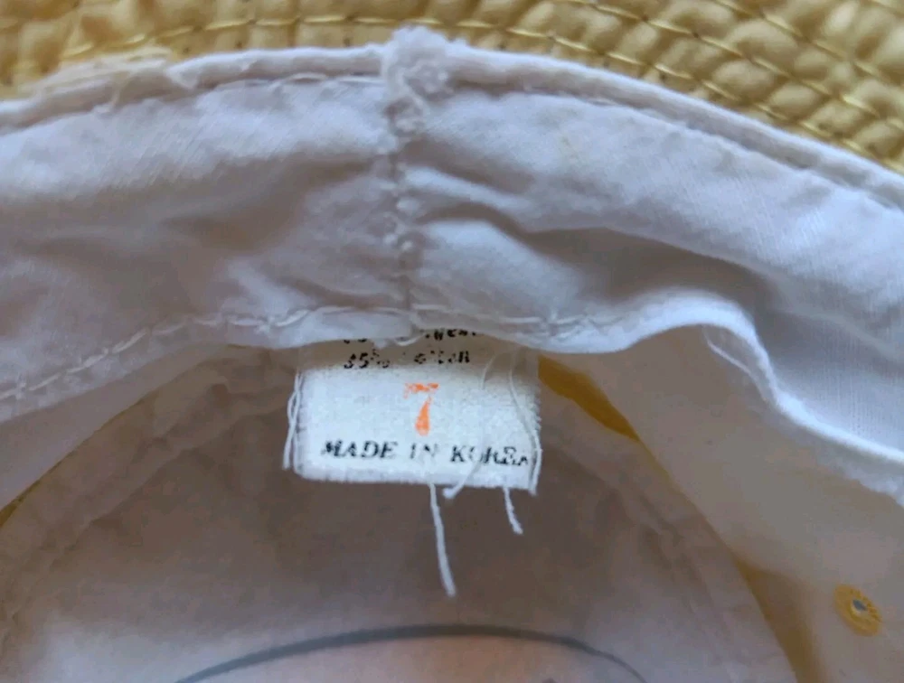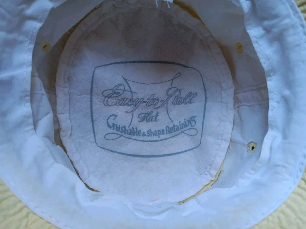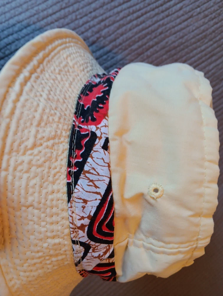 Great looking vintage yellow bucket hat with a geometric band. The inside says easy-to-roll, crushable & shape retaining. I found this to be true. After laundering, it came out great and retained its shape beautifully. There is very light staining on the inner band. Please see photos. The size is seven