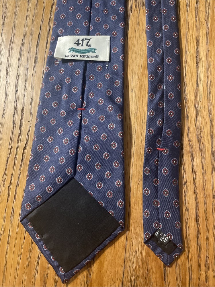 This Vintage EUC 417 By Van Heusen Silk Foulard Tie is a high-quality men's necktie crafted from 100% silk. The classic narrow width and designer preppy style make it a timeless accessory for any formal occasion. The multicolor foulard pattern adds a touch of sophistication to any outfit, making it a versatile piece that can be worn for years to come. Perfect for adding a vintage touch to your wardrobe, this tie embodies classic elegance and style.