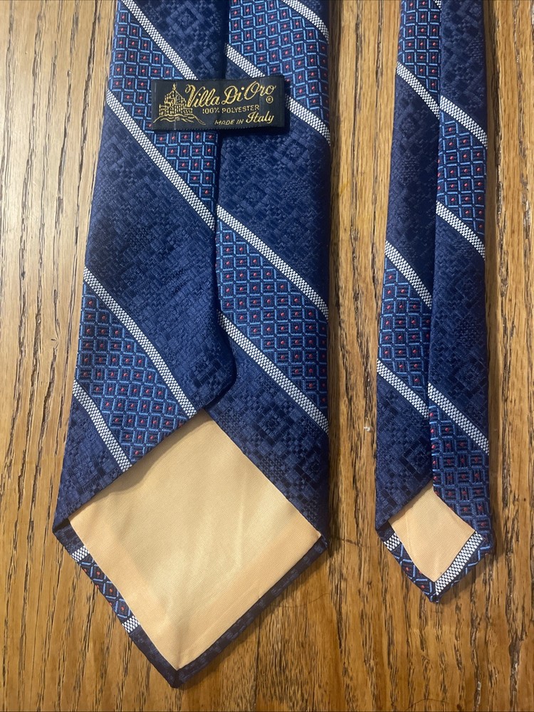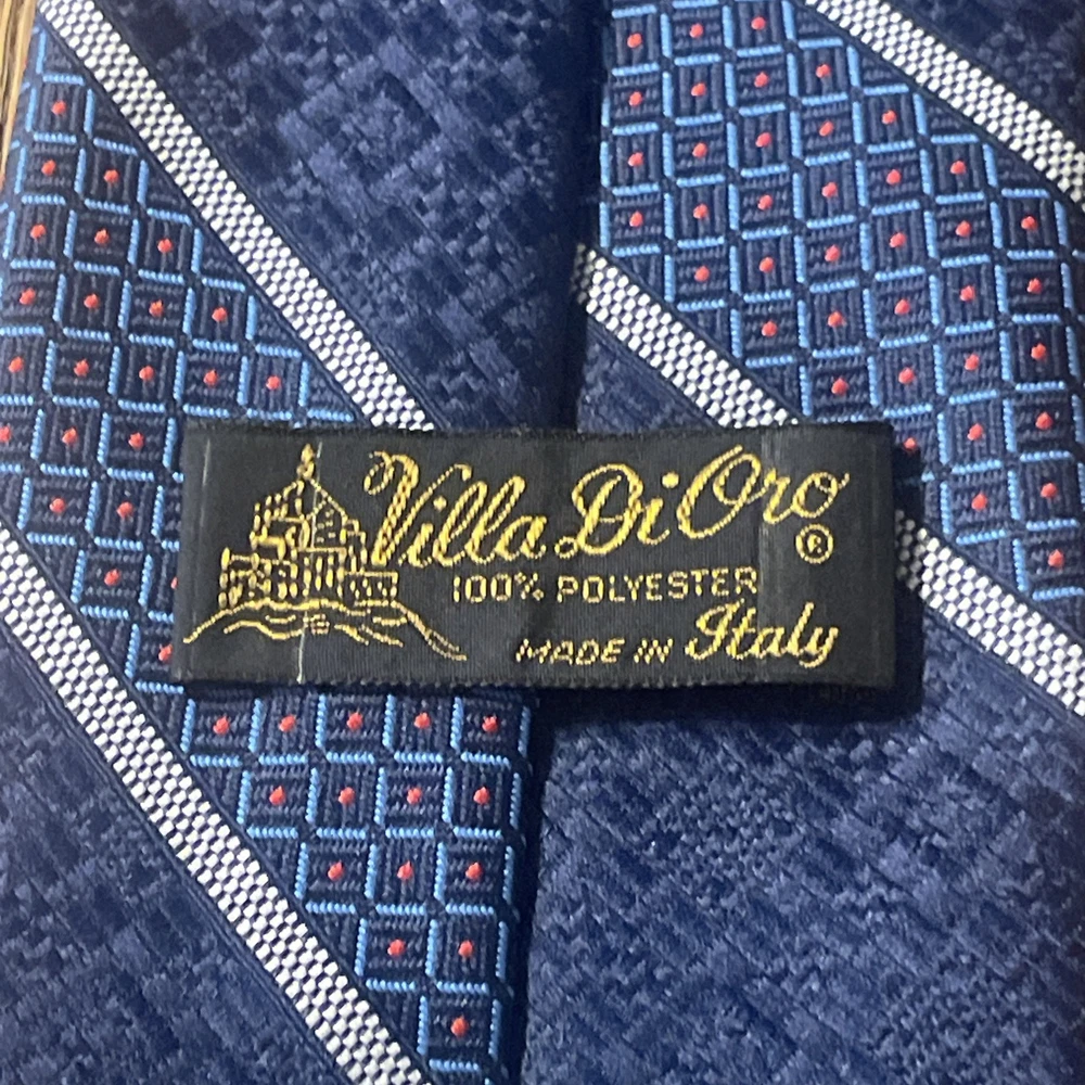The Vintage EUC 60s 70s Villa Di Oro Woven Polyester Wide Tie is a retro men's accessory made in Italy. Featuring a geometric multicolor pattern, this wide tie adds a touch of vintage flair to any outfit. Made from polyester fabric, this unique piece is a statement of style and nostalgia, perfect for those who appreciate classic 60s and 70s fashion.