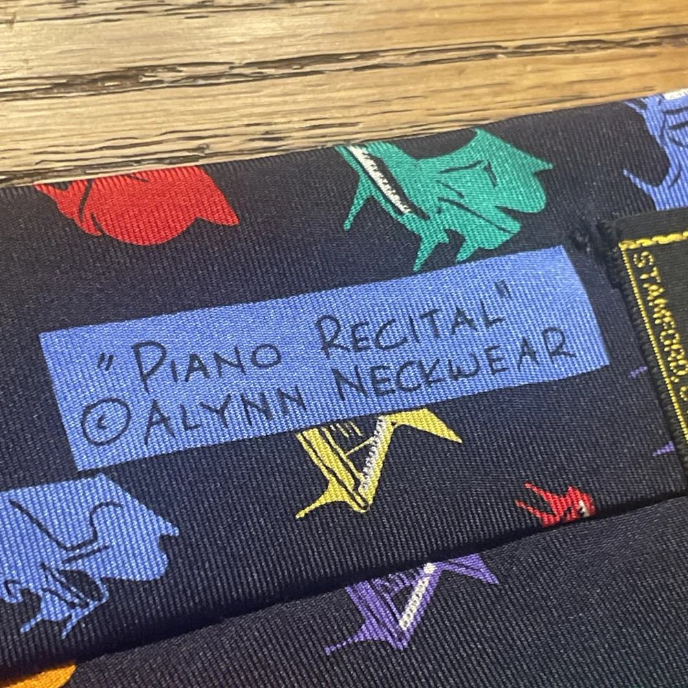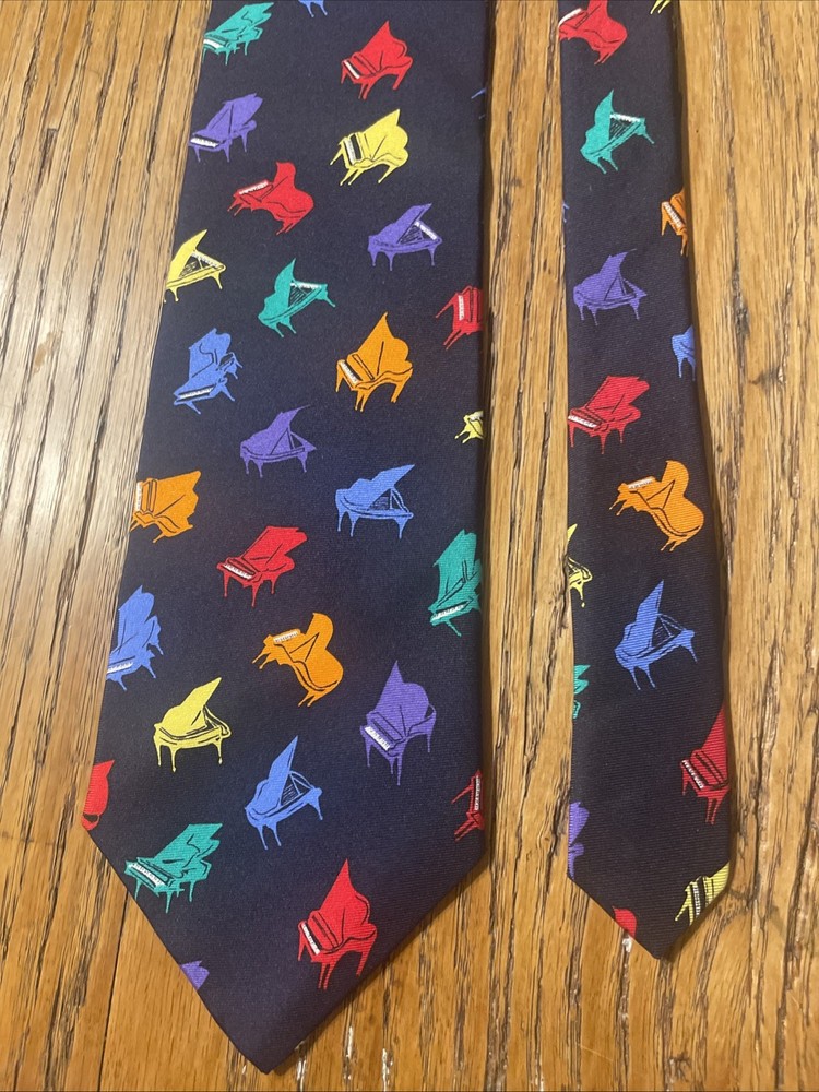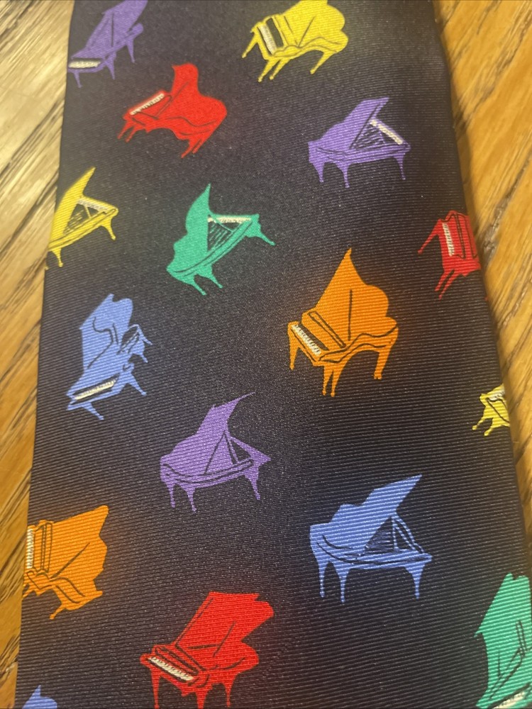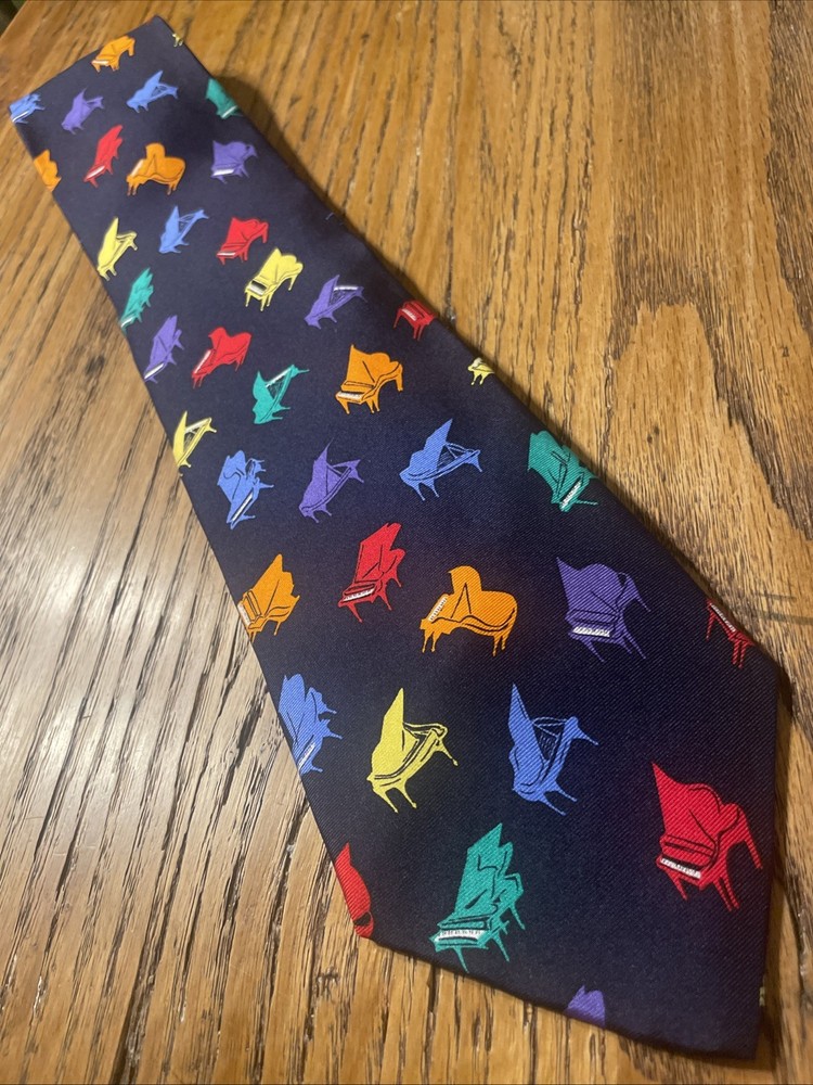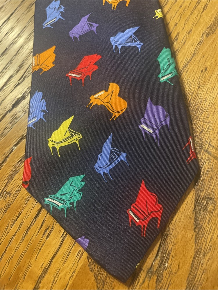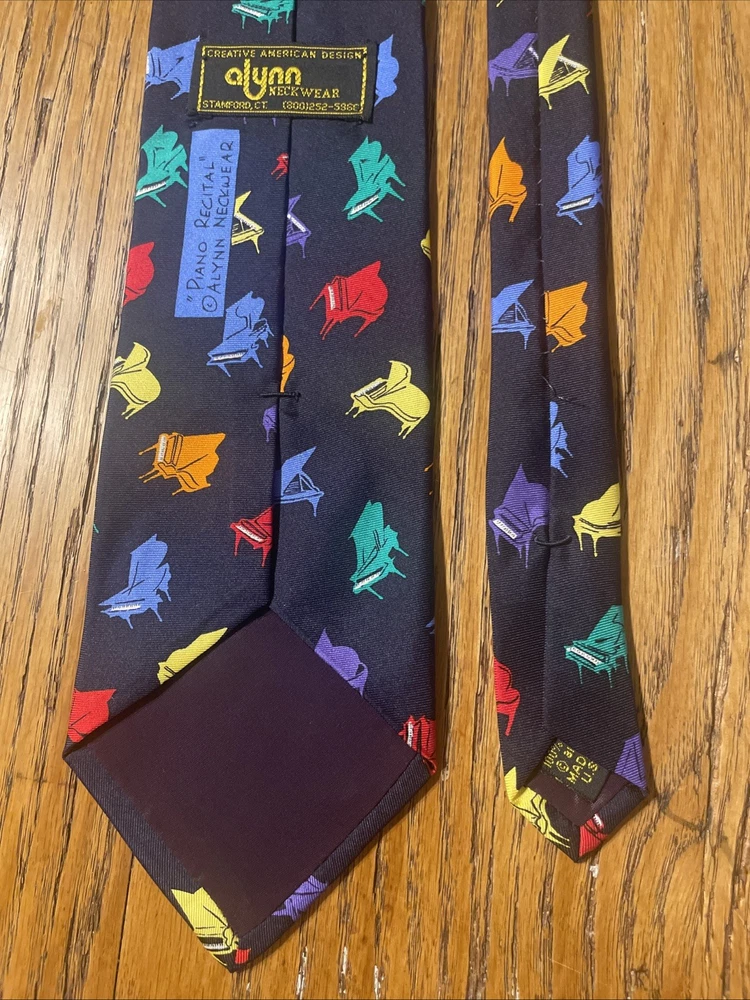 This vintage EUC Alynn Neckwear piano recital silk tie is a designer necktie made in the USA. The tie features a vibrant multicolor pattern of piano keys, perfect for a preppy and sophisticated look. Made from 100% satin silk, this classic width tie exudes quality and style, making it a standout accessory for any man's wardrobe. Ideal for formal occasions or adding a pop of color to a professional attire, this tie embodies timeless elegance and craftsmanship.