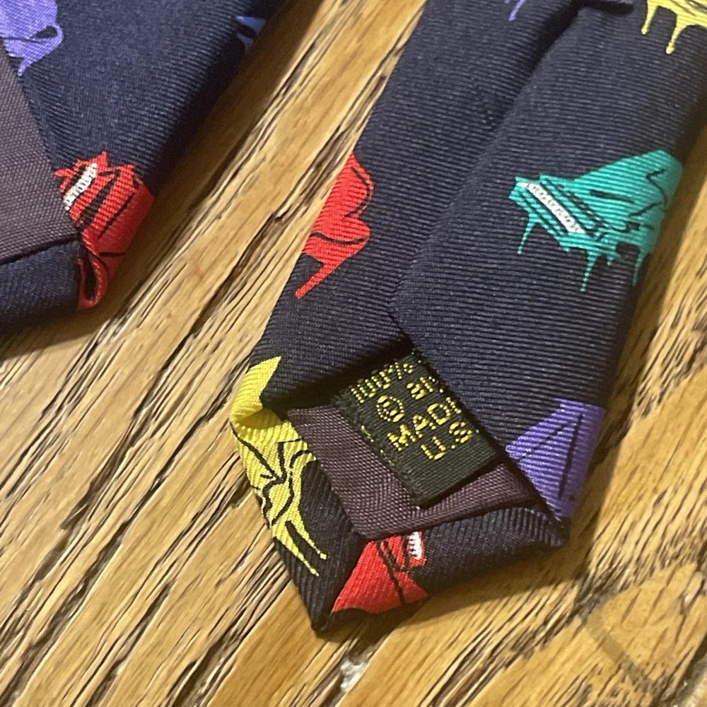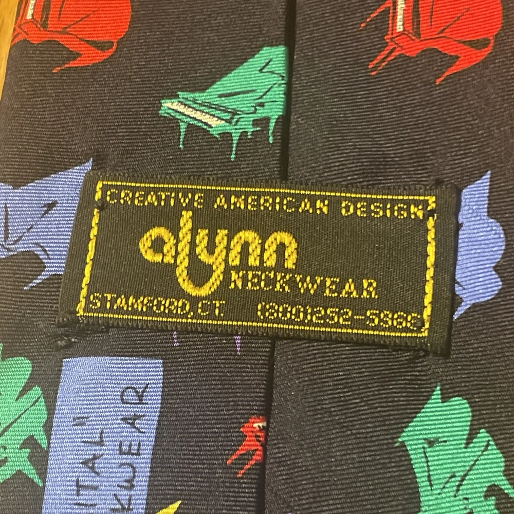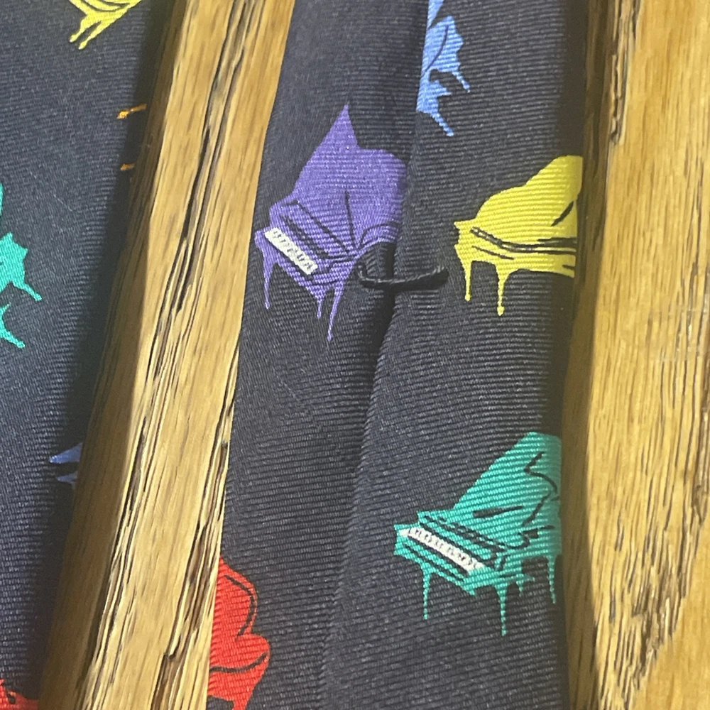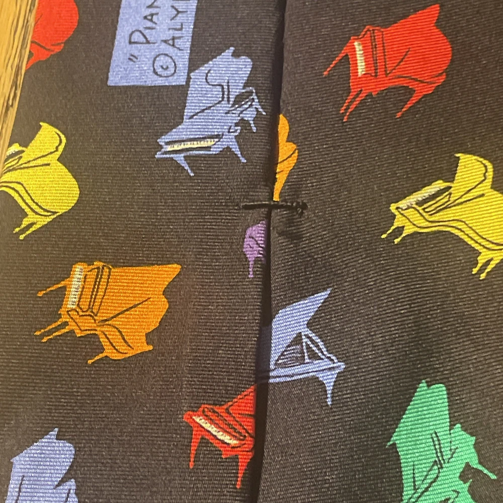 This vintage EUC Alynn Neckwear piano recital silk tie is a designer necktie made in the USA. The tie features a vibrant multicolor pattern of piano keys, perfect for a preppy and sophisticated look. Made from 100% satin silk, this classic width tie exudes quality and style, making it a standout accessory for any man's wardrobe. Ideal for formal occasions or adding a pop of color to a professional attire, this tie embodies timeless elegance and craftsmanship.