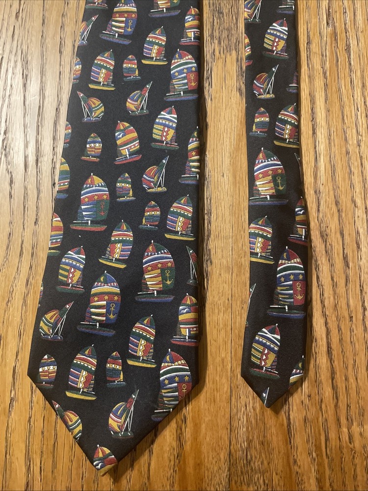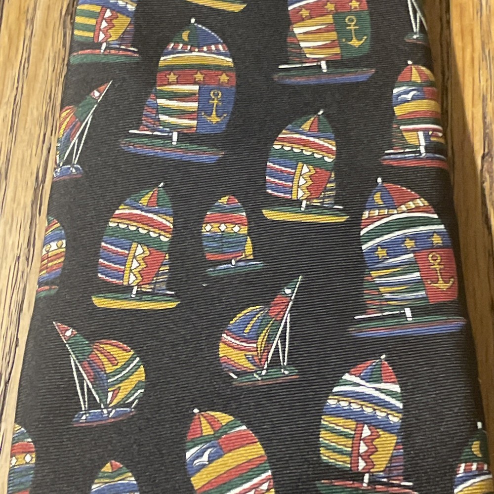 This Vintage Brooks Brothers Silk Tie features a classic sailboats theme, perfect for the preppy man. Made in the USA with 100% silk fabric, this designer tie adds a touch of sophistication to any outfit. The multicolor pattern and classic width make it a timeless accessory for men who appreciate quality and style.
