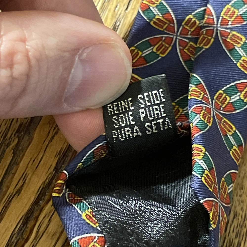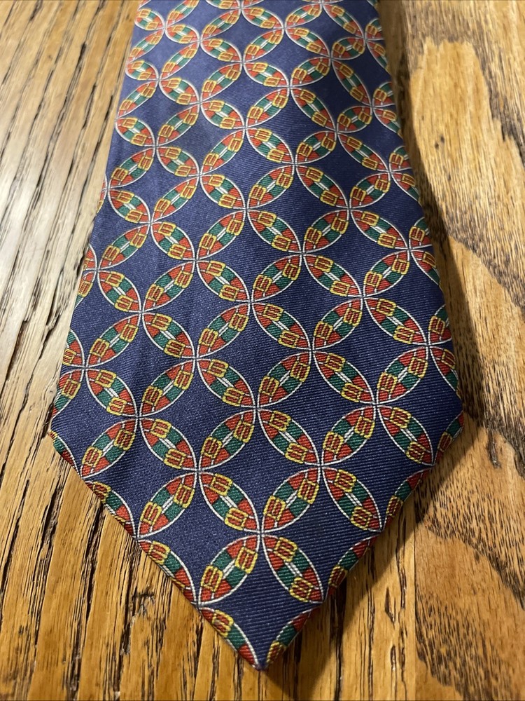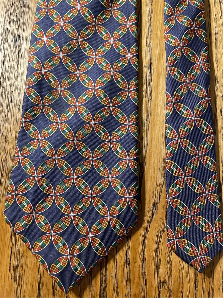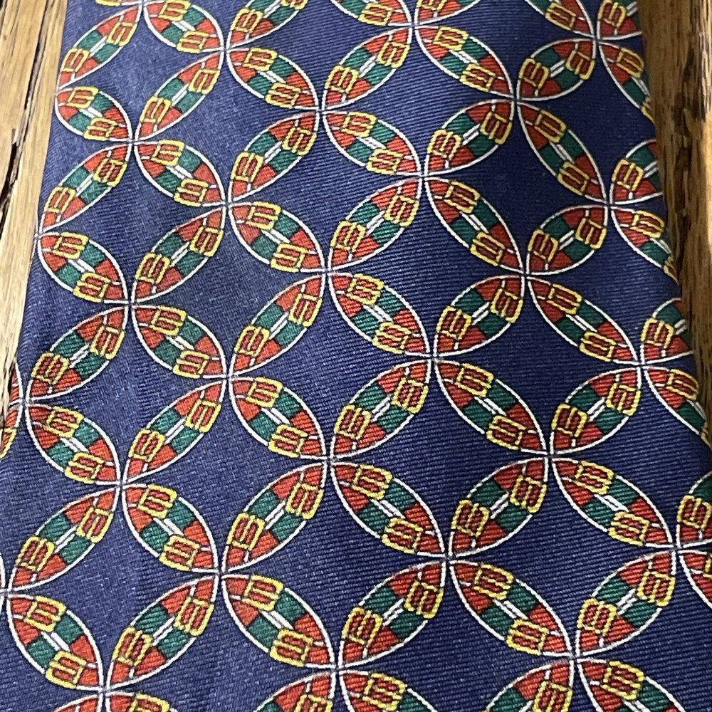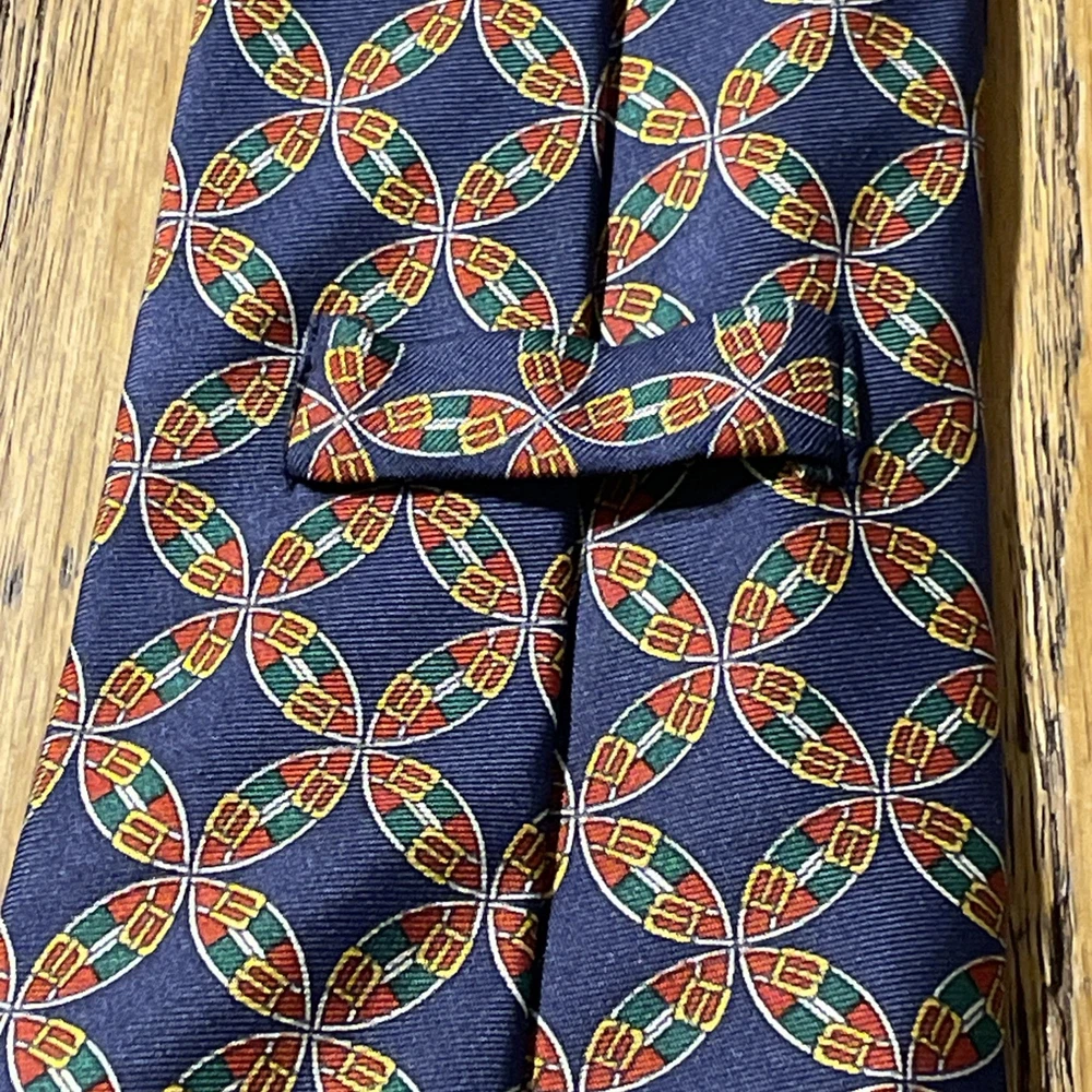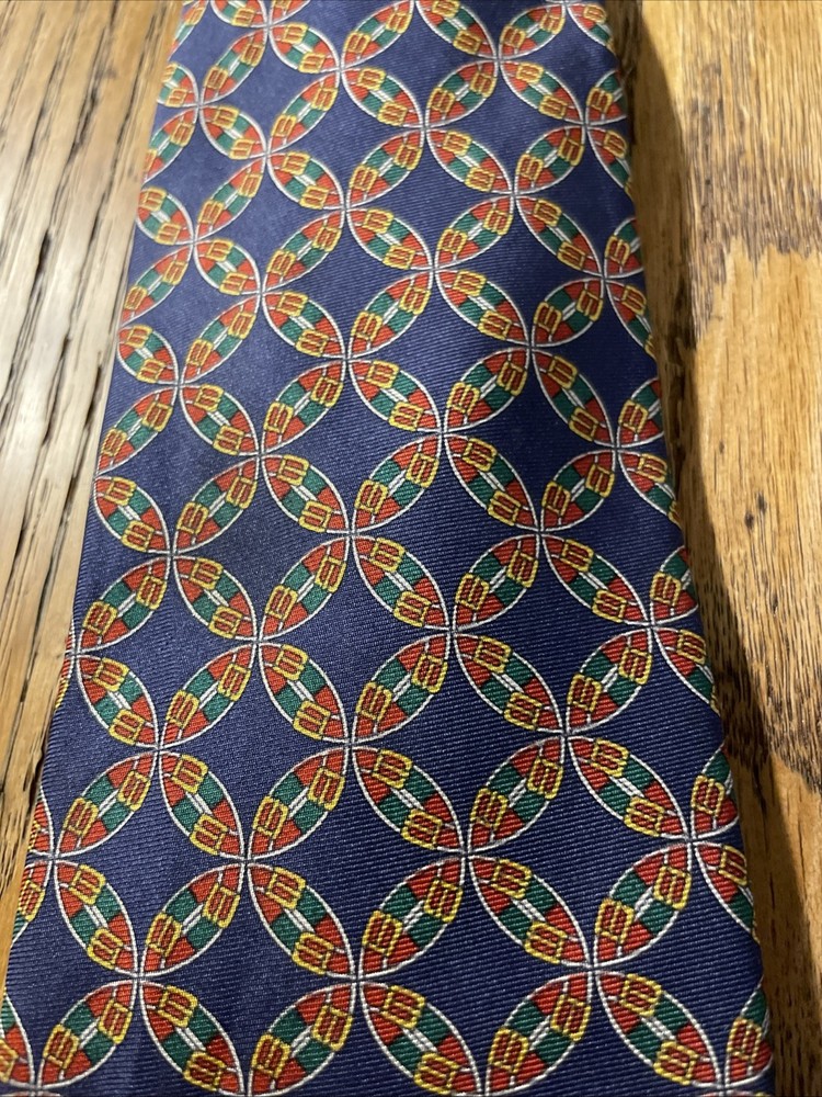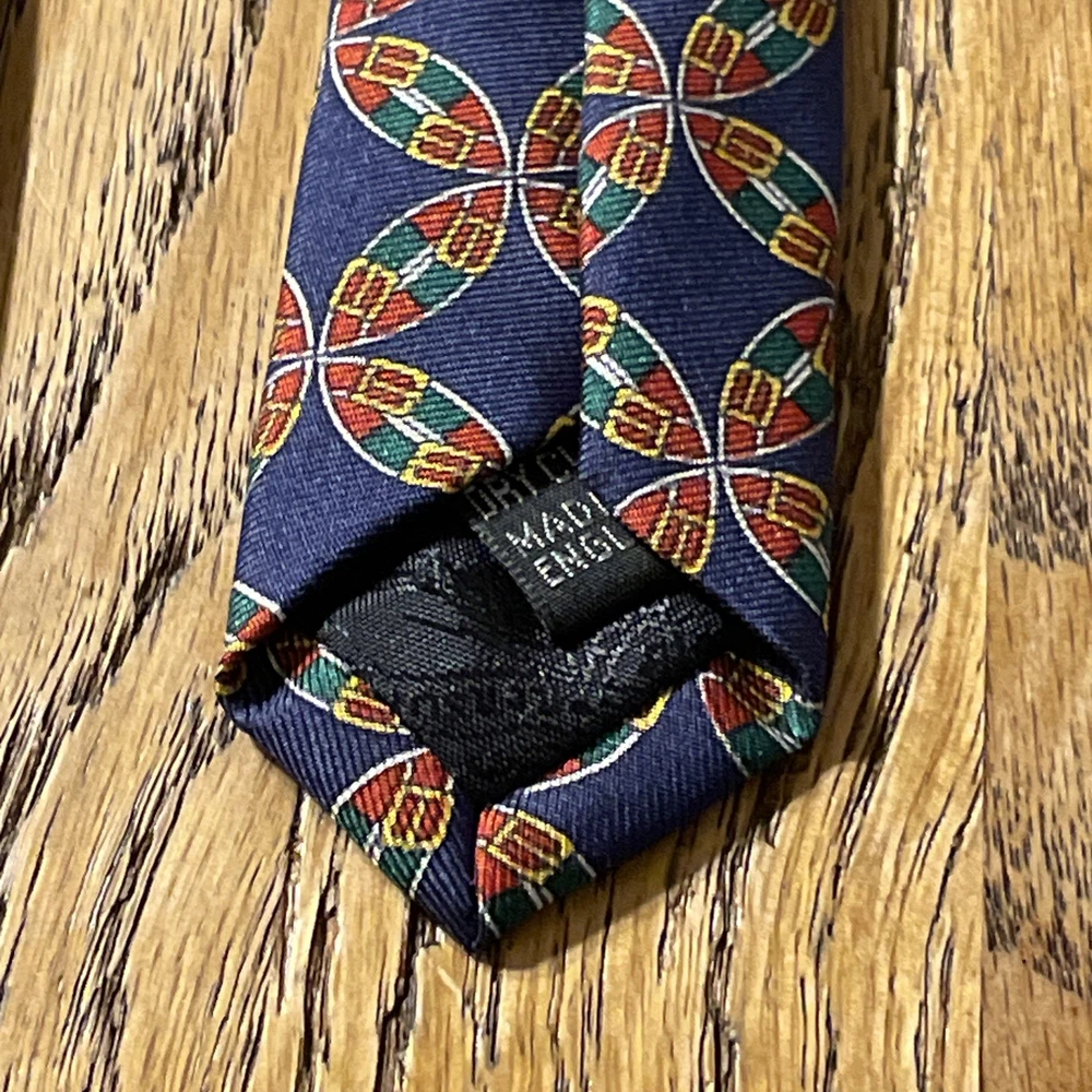 The vintage Burberry silk tie buckles are a luxurious designer accessory for men. Made in England from 100% silk satin, these geometric patterned neckties are a classic addition to any formal or stylish outfit. The multicolor design adds a pop of sophistication, perfect for those looking to make a designer statement. With its timeless charm and high-quality craftsmanship, these Burberry ties are a must-have for any fashion-conscious gentleman.