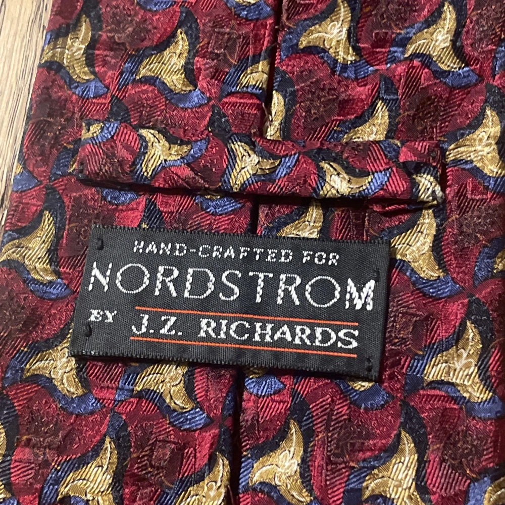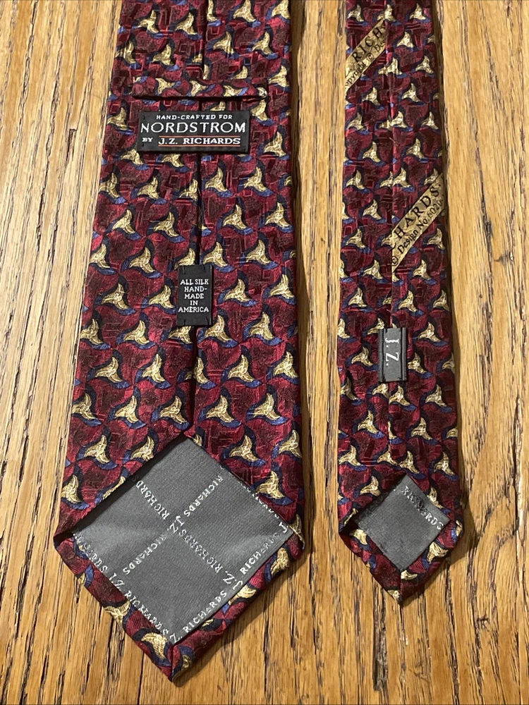 This vintage J.Z. Richards for Nordstrom USA hand-made silk tie necktie features a classic geometric pattern in a multicolor design, perfect for a preppy and designer style. Made from 100% satin silk fabric, this tie is a timeless accessory for men who appreciate high-quality and unique pieces. Proudly crafted in the United States, this necktie exudes a sense of sophistication and heritage, making it a standout addition to any formal or professional outfit.
