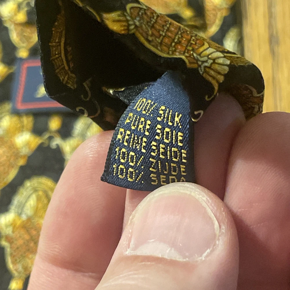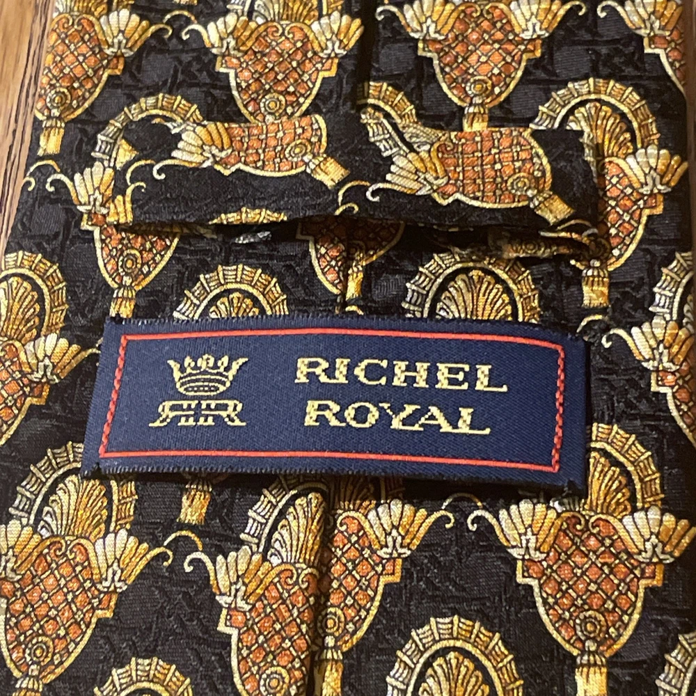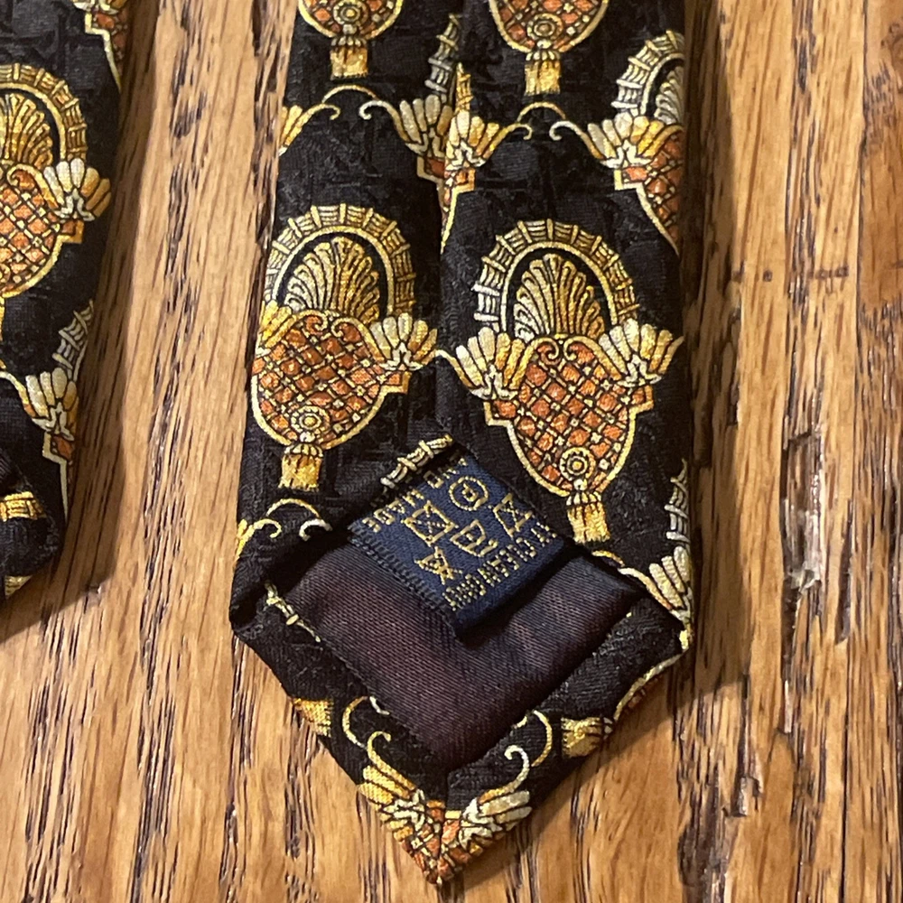This Vintage EUC Michel Royal Baroque Geometric Silk Tie Necktie is a designer accessory for men, hand-made in Spain by the Richel Royal brand. The multicolor Baroque pattern on 100% silk satin fabric exudes a preppy and sophisticated style. With a classic width, this tie is perfect for adding a touch of vintage elegance to any formal ensemble. Made with quality and attention to detail, this necktie is sure to elevate any outfit with its timeless and intricate design.
