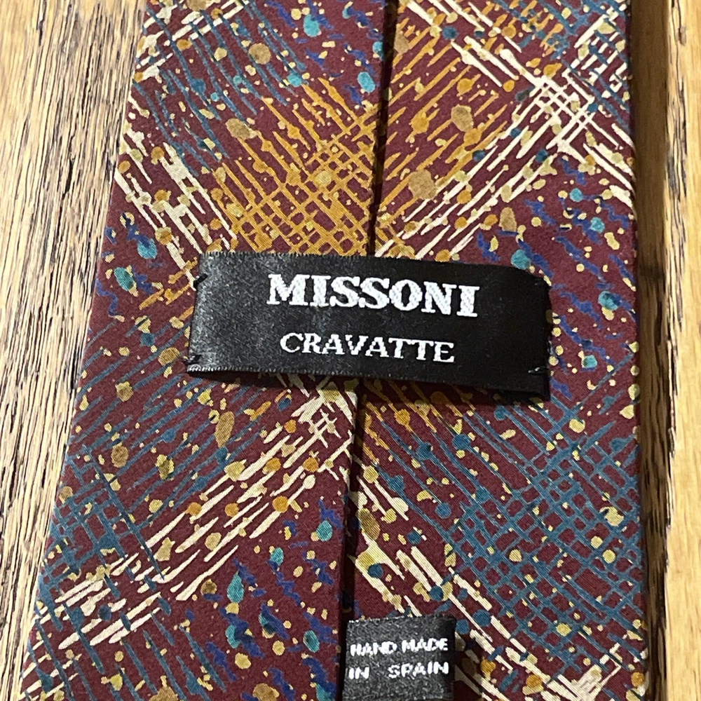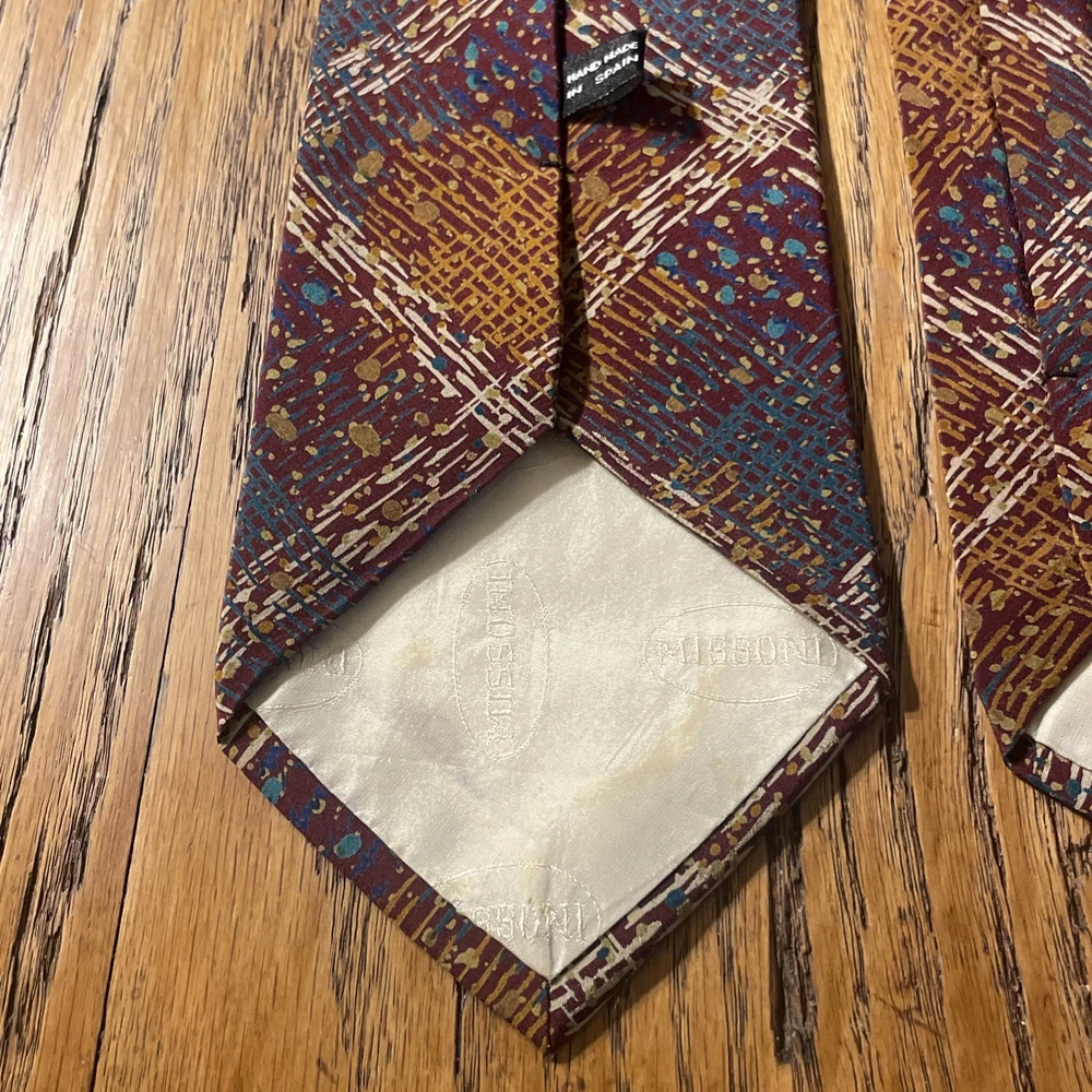This vintage Missoni abstract splatter silk tie is a stylish men's accessory with a classic and preppy appeal. Made in Spain, the multicolor design features a unique abstract splatter argyle pattern, perfect for adding a touch of designer flair to any outfit. Crafted from 100% silk satin, this classic width tie is a timeless piece that will elevate any formal ensemble.