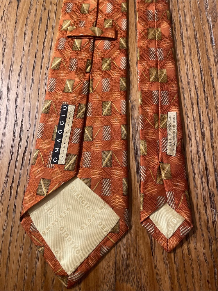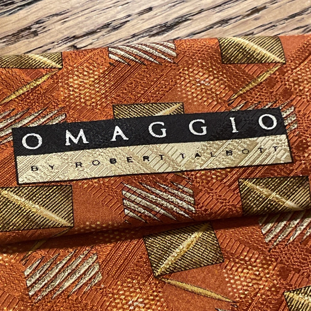 The Vintage EUC Omaggio By Robert Talbott Silk Geometric Tie is a high-quality designer accessory hand-sewn in Italy. Made from 100% silk satin, this classic multicolor tie features a geometric pattern suitable for a preppy style. With its timeless design and impeccable craftsmanship, this tie is a sophisticated choice for any man looking to add a touch of vintage elegance to their outfit.