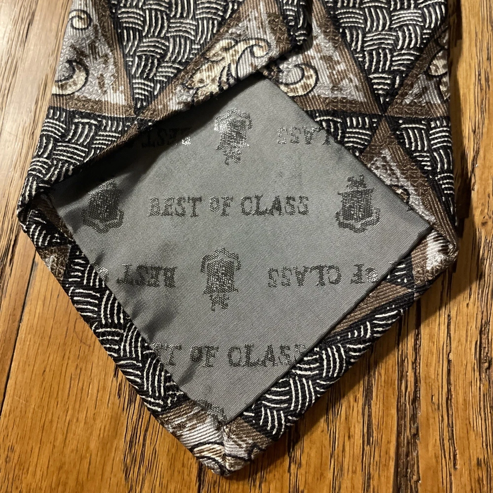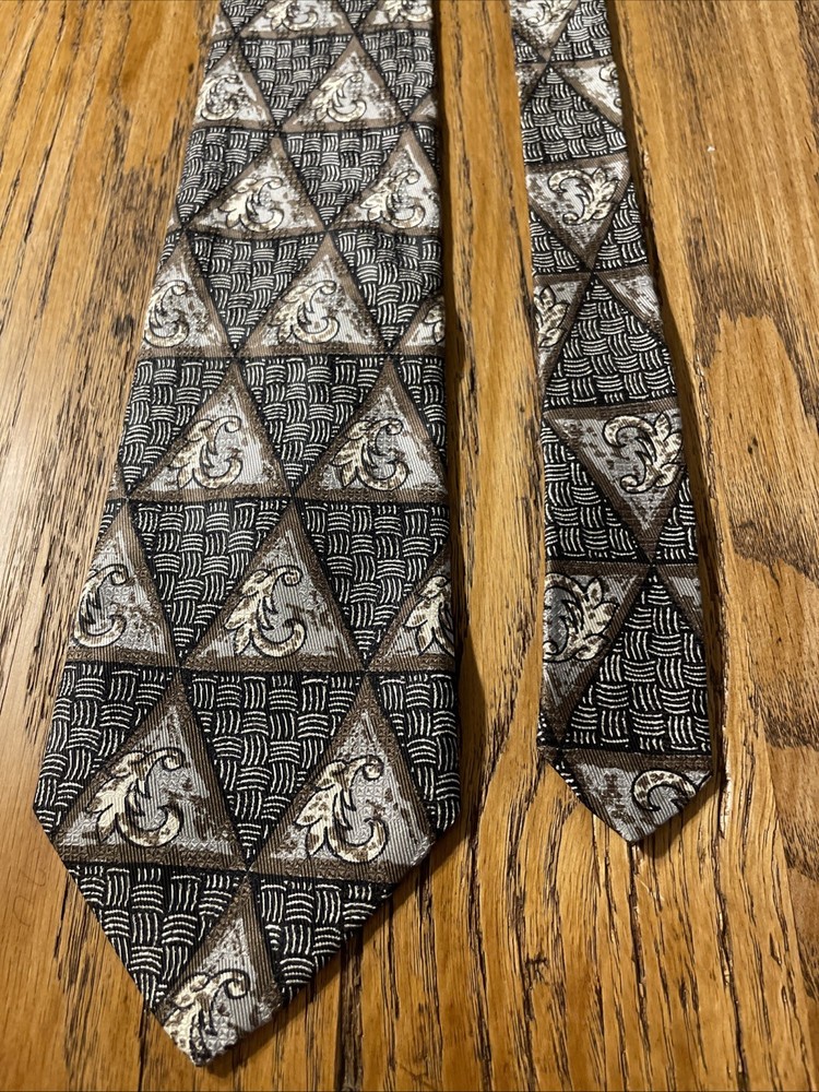 Elevate your wardrobe with the sophisticated charm of a vintage Robert Talbott Best Of Class silk tie. Featuring a bold geometric pattern, this multicolor designer tie is a testament to classic style with a preppy twist. Hand-sewn in the United States, it's a remarkable piece that speaks to the craftsmanship and attention to detail synonymous with the brand. The tie is made from 100% silk, offering a luxurious feel and a quality that's evident in every knot. Its classic width ensures a timeless look that pairs seamlessly with a variety of suit styles. Whether you're dressing up for a special occasion or adding a touch of elegance to your everyday attire, this Robert Talbott tie is a versatile addition to any men's collection.