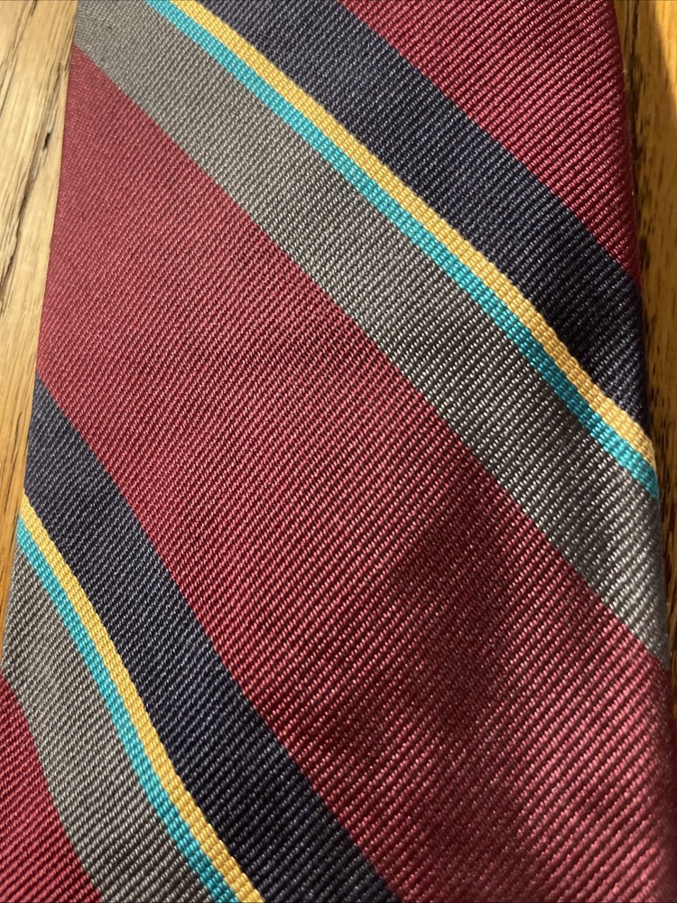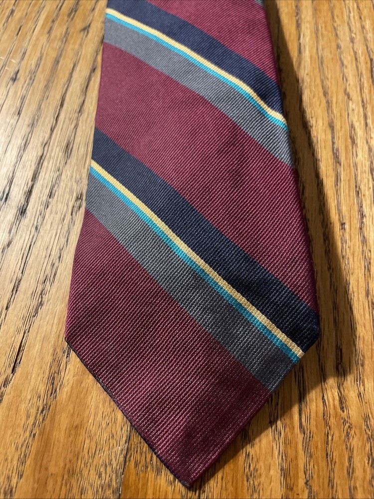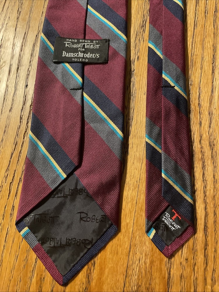 This vintage Robert Talbott Damschroder's Repp Silk Tie is a classic designer necktie made in the USA. Hand sewn from 100% silk fabric with a regimental stripe pattern, this multicolor tie exudes a sophisticated and timeless style. Perfect for adding a touch of luxury to any man's outfit, this necktie is a rare find for those who appreciate high-quality craftsmanship and heritage in their accessories.