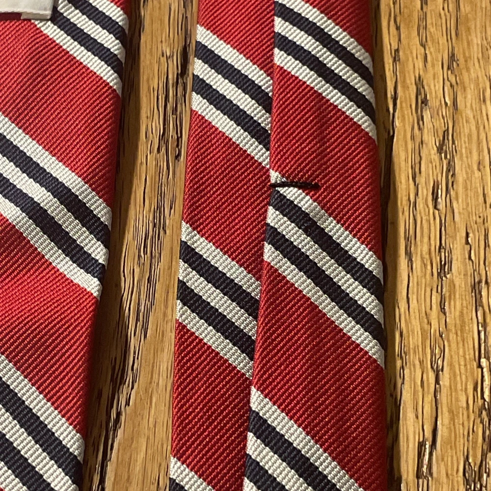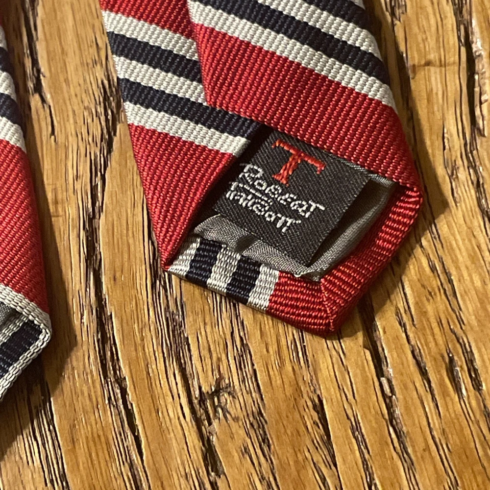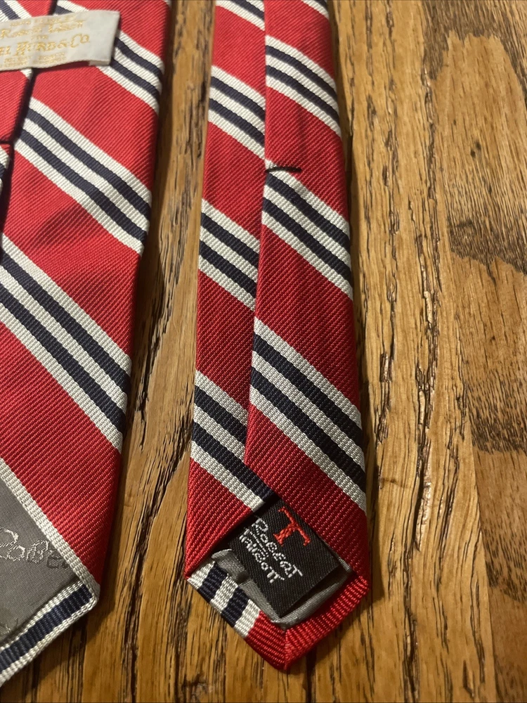 The product is a vintage Robert Talbott Repp Silk Striped Tie, hand-sewn in the USA. This designer tie features a classic multicolor striped pattern on 100% silk fabric, embodying a timeless and sophisticated style. Perfect for adding a touch of vintage charm to any man's wardrobe, this tie showcases the brand's commitment to quality craftsmanship and unique design.