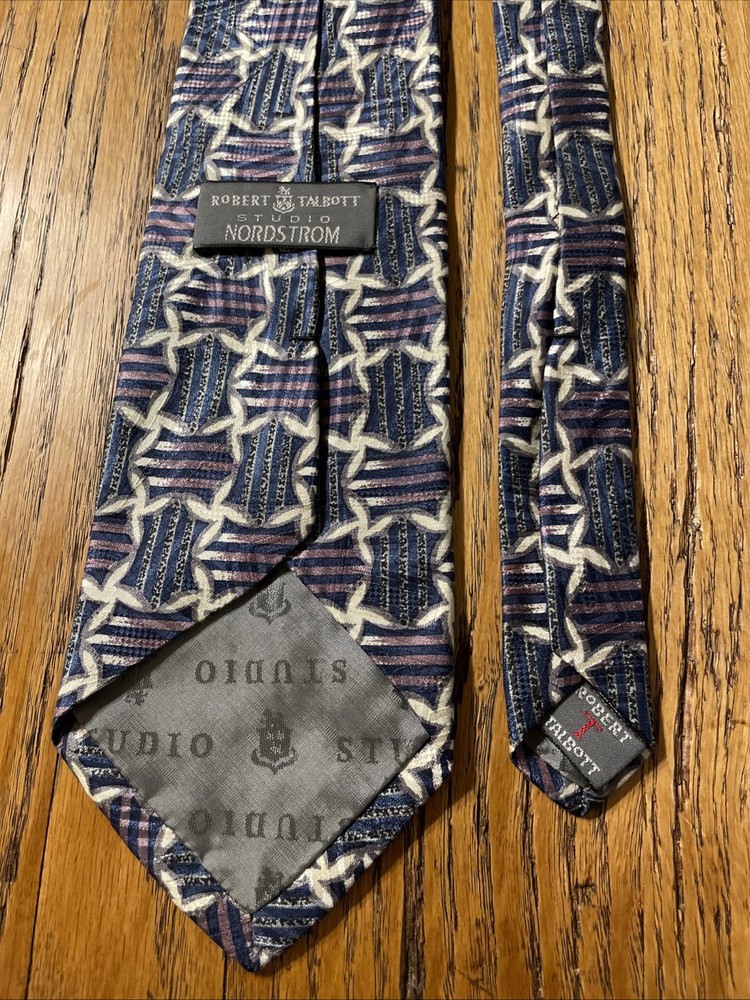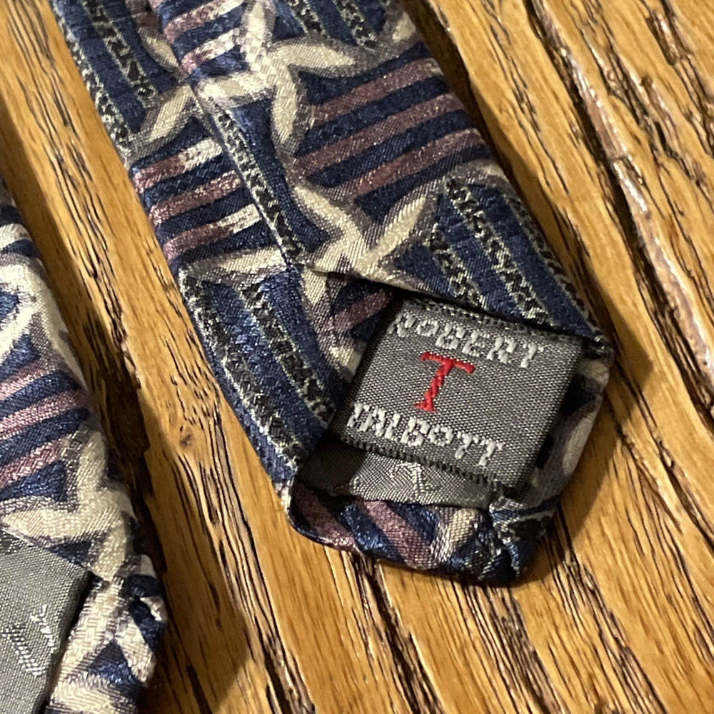 This vintage Robert Talbott Studio silk tie is a designer piece hand sewn in the USA. The geometric pattern in multicolor is perfect for a preppy style, making it a classic accessory for men. Made from 100% silk fabric, this tie exudes quality and sophistication, a luxurious addition to any man's wardrobe.