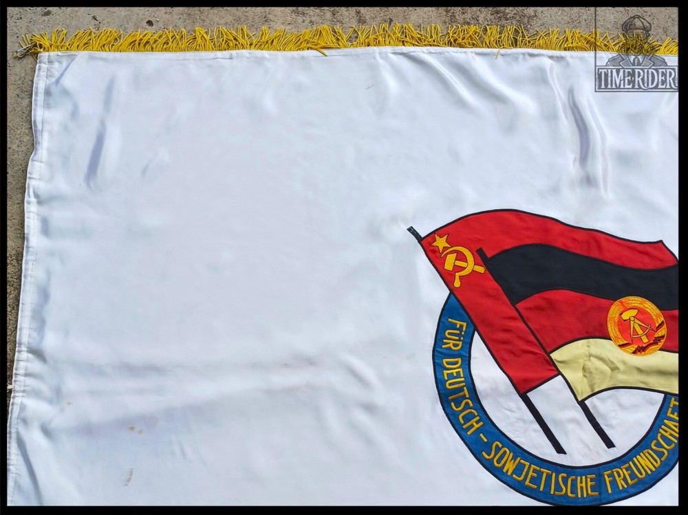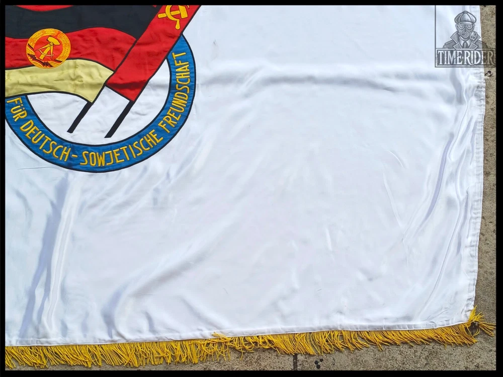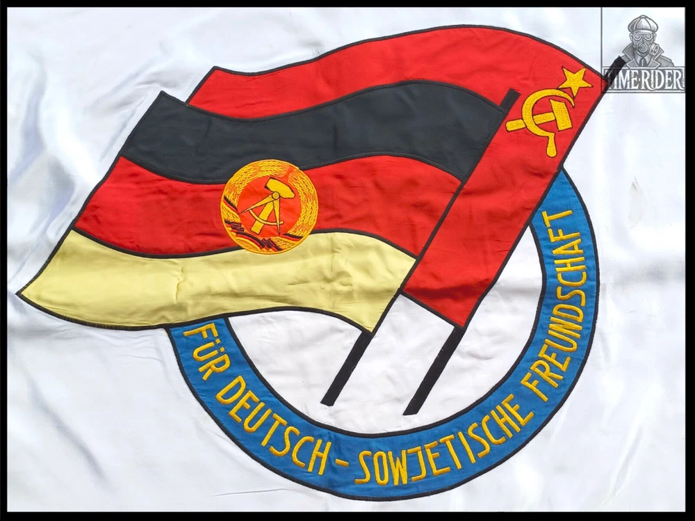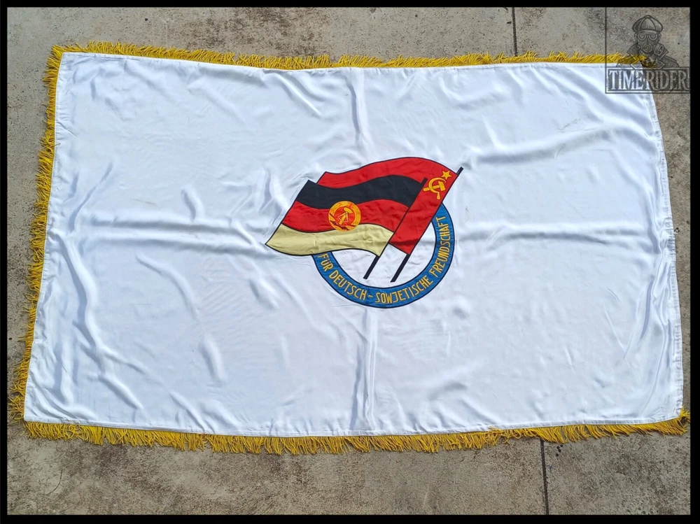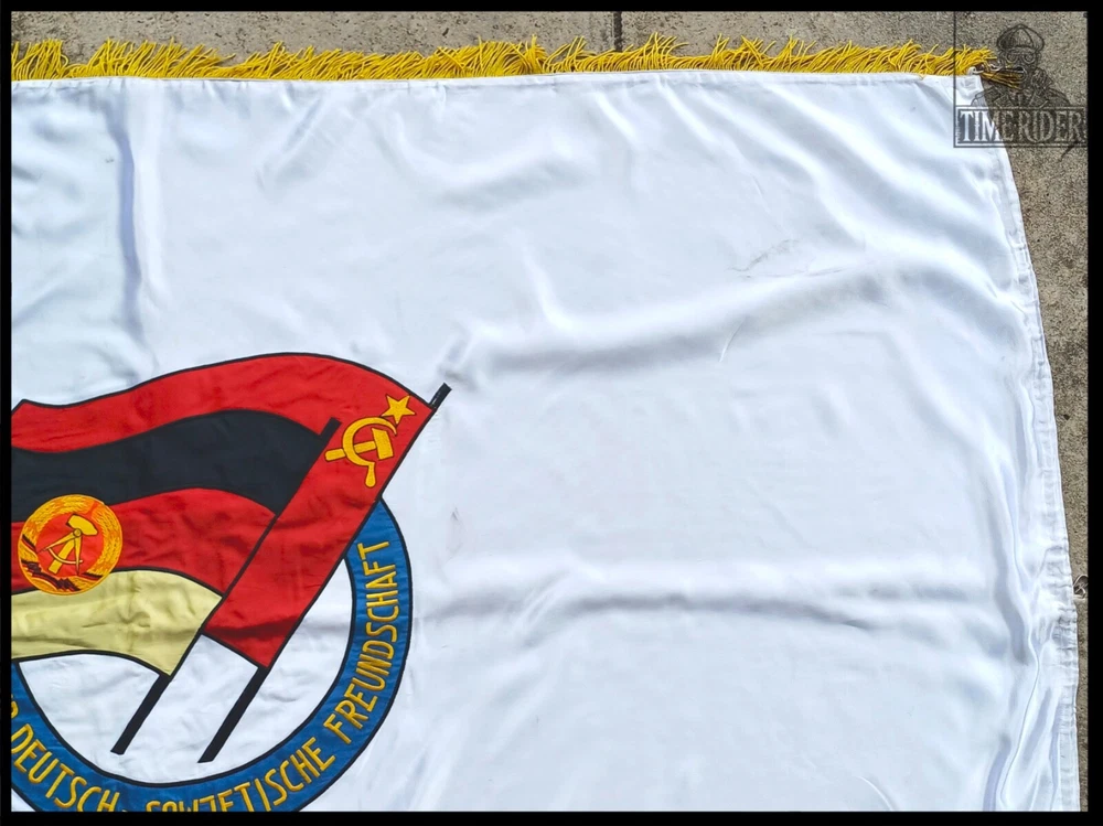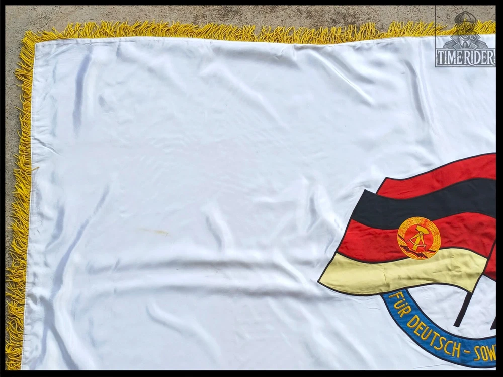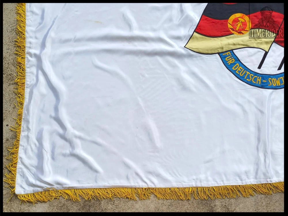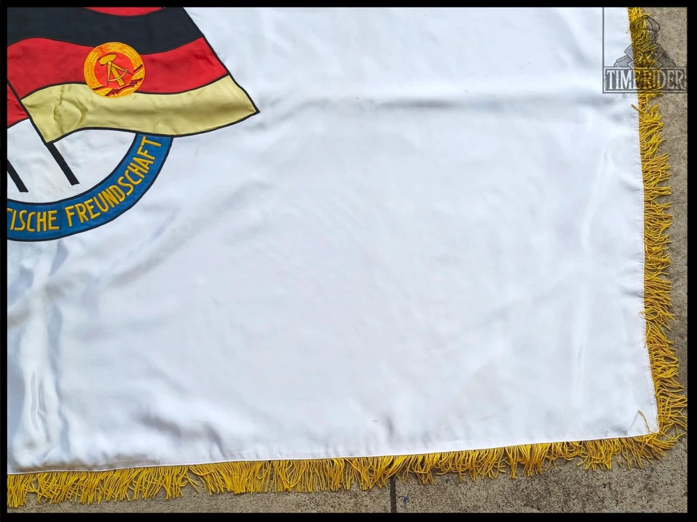 A striking piece of Cold War-era memorabilia. Crafted from silk or satin, it features a double-sided design with an embroidered emblem and elegant gold fringe—a symbol of solidarity between two historic nations. A rare and meaningful collectible for Cold War historians, political memorabilia collectors, or vintage textile enthusiasts. — Key Details — Condition : Excellent vintage condition with minor signs of age and faint stains (see photos) Era : Circa 1950s-1960s Origin : Germany Material : Silk or satin body, cotton header, hemp rope Features : Double-sided embroidery, gold fringe trim, ready for hanging Size : - Actual Size (Laid Flat Measurement) : W. 74” x H. 45” (188 x114 cm.) Weight : 1200 g. ----------------------------------------------------------------------------------------------------- SHOP POLICIES AND GENERAL INFO: All orders are final and sold as-is. Please check measurements and/or ask any questions BEFORE your purchase. Please check detailed description. All items have a history and Time Rider Vintage Shop strives to choose only items that are in very good used condition. Irregularities or slight signs of wear might be present. Color representation may vary depending on monitors. Please review fabric care under FAQ. Thank you for checking in and let us know if you have any questions! EB110FL-W1350-3500T300