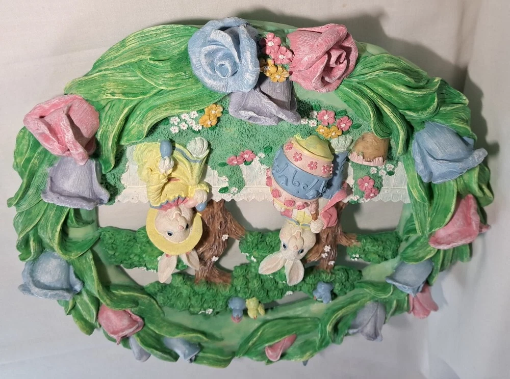 Easter Bunny Eggs Flowers Birds Vintage Easter Wreath Bunnies Resin Approx 12" tall see pictures for measurements I consider to be in VERY GOOD condition Please view all photos zooming in on them as they are part of the description for you to judge condition Will ship either USPS, Fedex or UPS depending on the location of where buyer lives. IMPORTANT - if ships via UPS or Fedex they require a home delivery address as they cannot deliver to post office boxes - NO POST OFFICE BOX