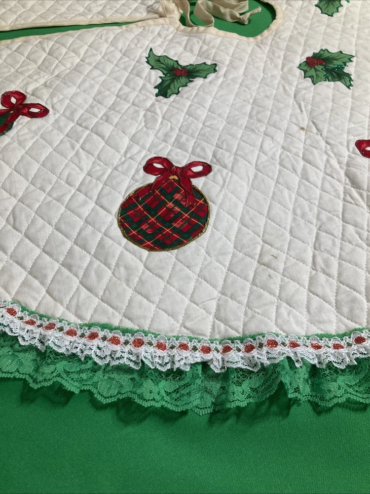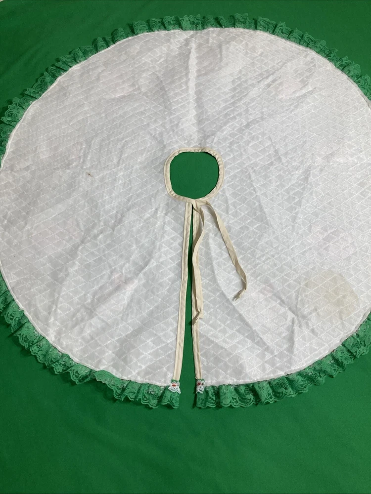 Has age related storage stains but doesn’t feel like it has ever been used. Feels crisp. Tinge of water stain on back but doesn’t seep onto front. I took pictures of all discolorations and I have not tried to clean. FREE SHIPPING Add a touch of vintage charm to your Christmas tree with this handmade quilted double lace ruffle trim tree skirt. The beige color and medium size make it a perfect fit for any tree stand, while the circle shape adds a unique touch to your holiday decor. Made with high-quality materials, this tree skirt is durable and perfect for multiple holiday seasons. Whether you're looking for a classic or eclectic Christmas tree skirt, this vintage piece is sure to impress. Item has not been laundered. Please use photos for better assessment of the item as well as measurements. Feel free to message me through eBay if you have any questions.