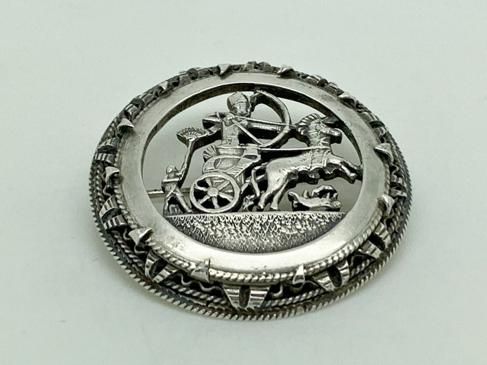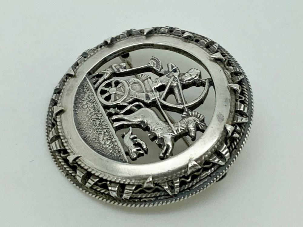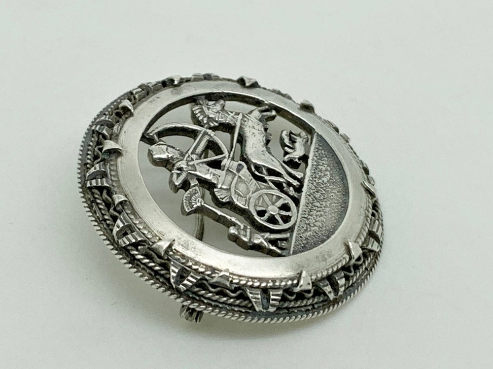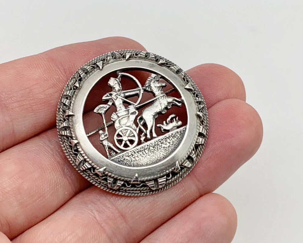 A lovely vintage egyptian sterling silver statement brooch in very detailed design of the pharaoh riding a chariot. Maker/Markings: Marked with several Egyptian hallmarks for Sterling Silver Condition: Very Good Used Condition, general patina - Please look at all photos Measurements & Weight: 1.5" wide ~ 37mm & 12.7g Combined Shipping on all items - Free in UK and £12 by registed airmail plus £1 per extra item overseas. SC5451-92 Vintage Egyptian Sterling Silver Pharaoh Chariot Detailed Statement Brooch