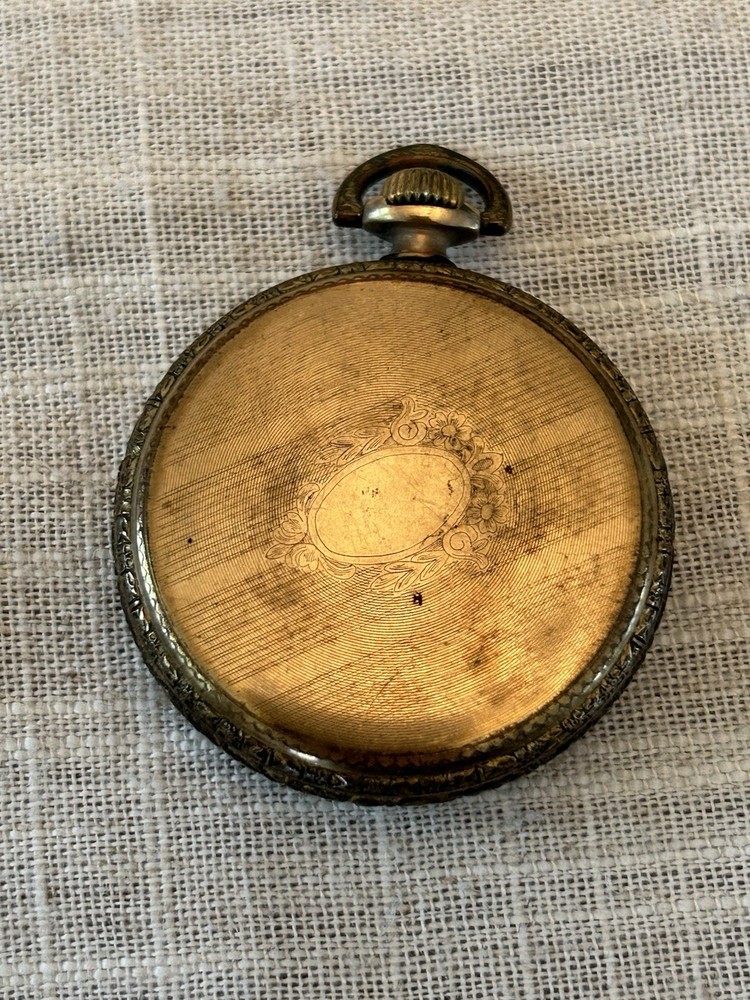 Elgin pocket watch I am unsure of the actual material. Gold, gold filled, bronze The back did not come off for me so I was unable to take a picture Arrives as is