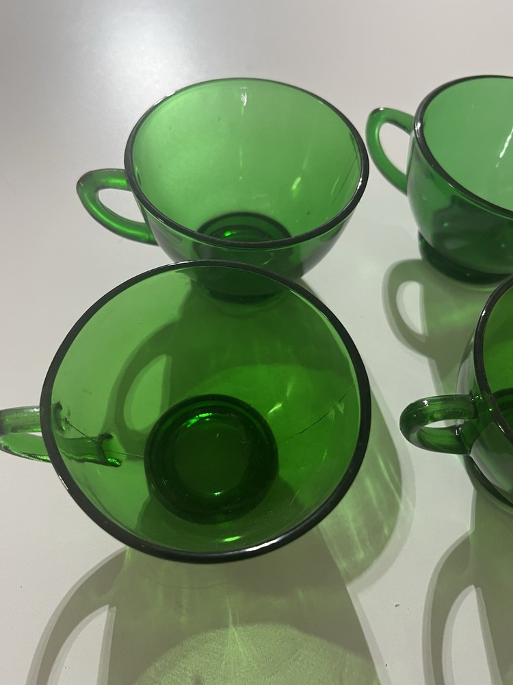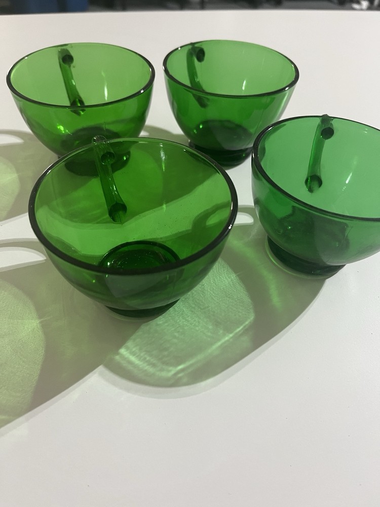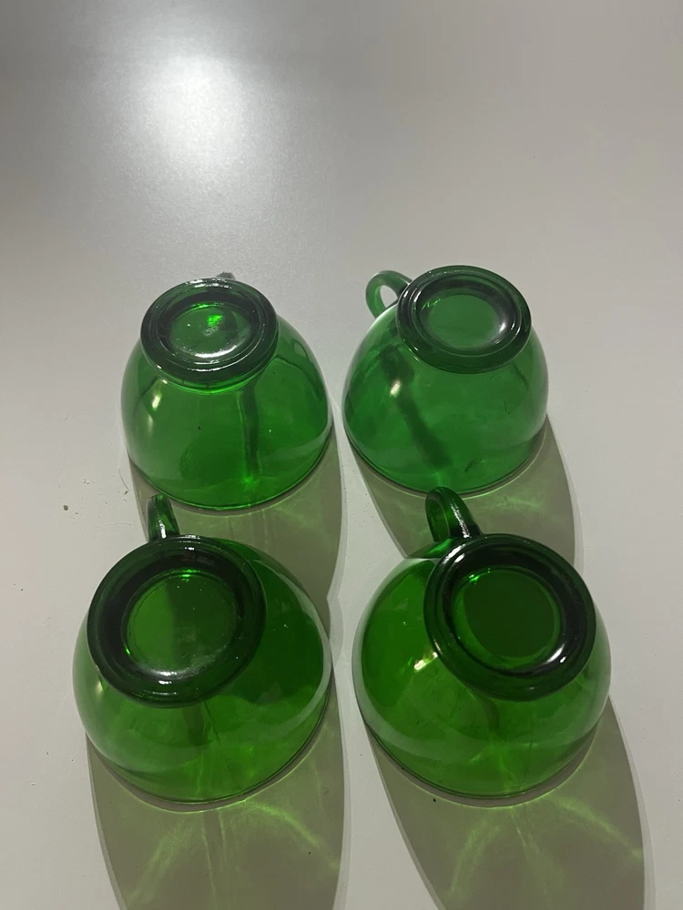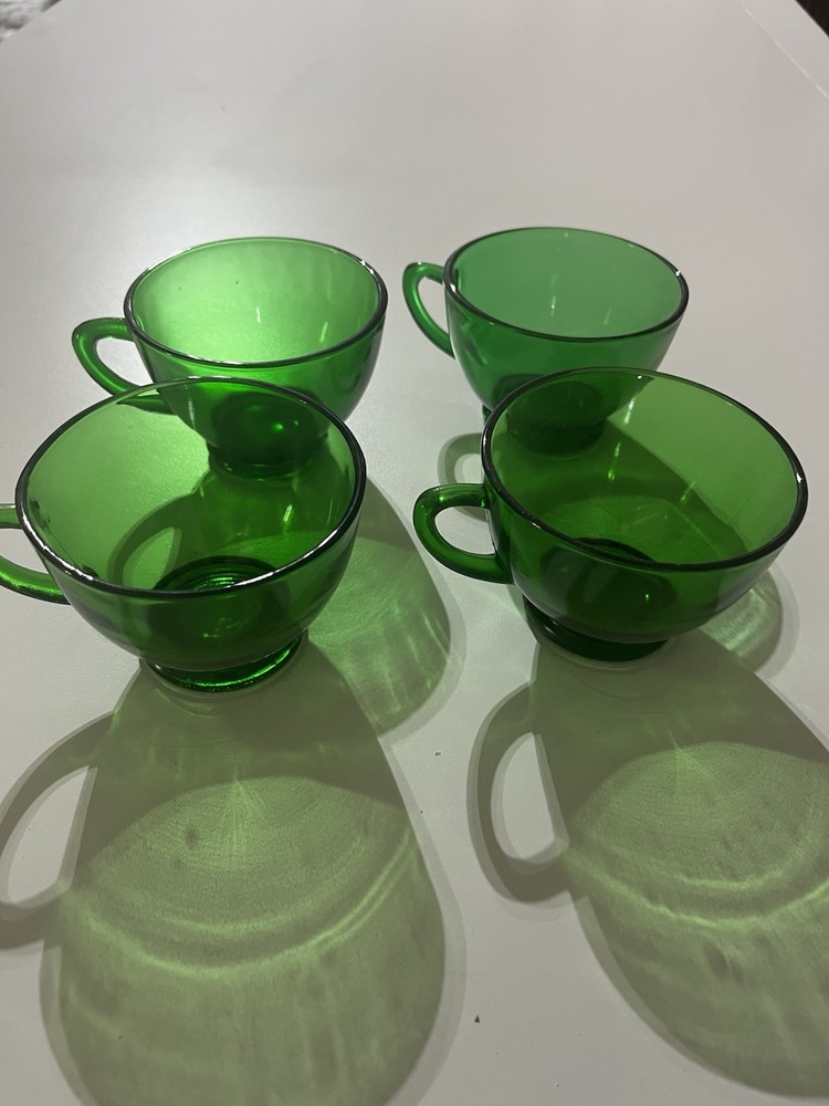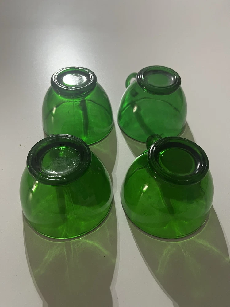 The product is a set of 4 vintage party mugs in an Emerald Green color. These glass punch cups are designed as drinking mugs and are perfect for serving beverages at parties or gatherings. Made of glass, each mug has a classic design that adds a touch of elegance to any occasion.