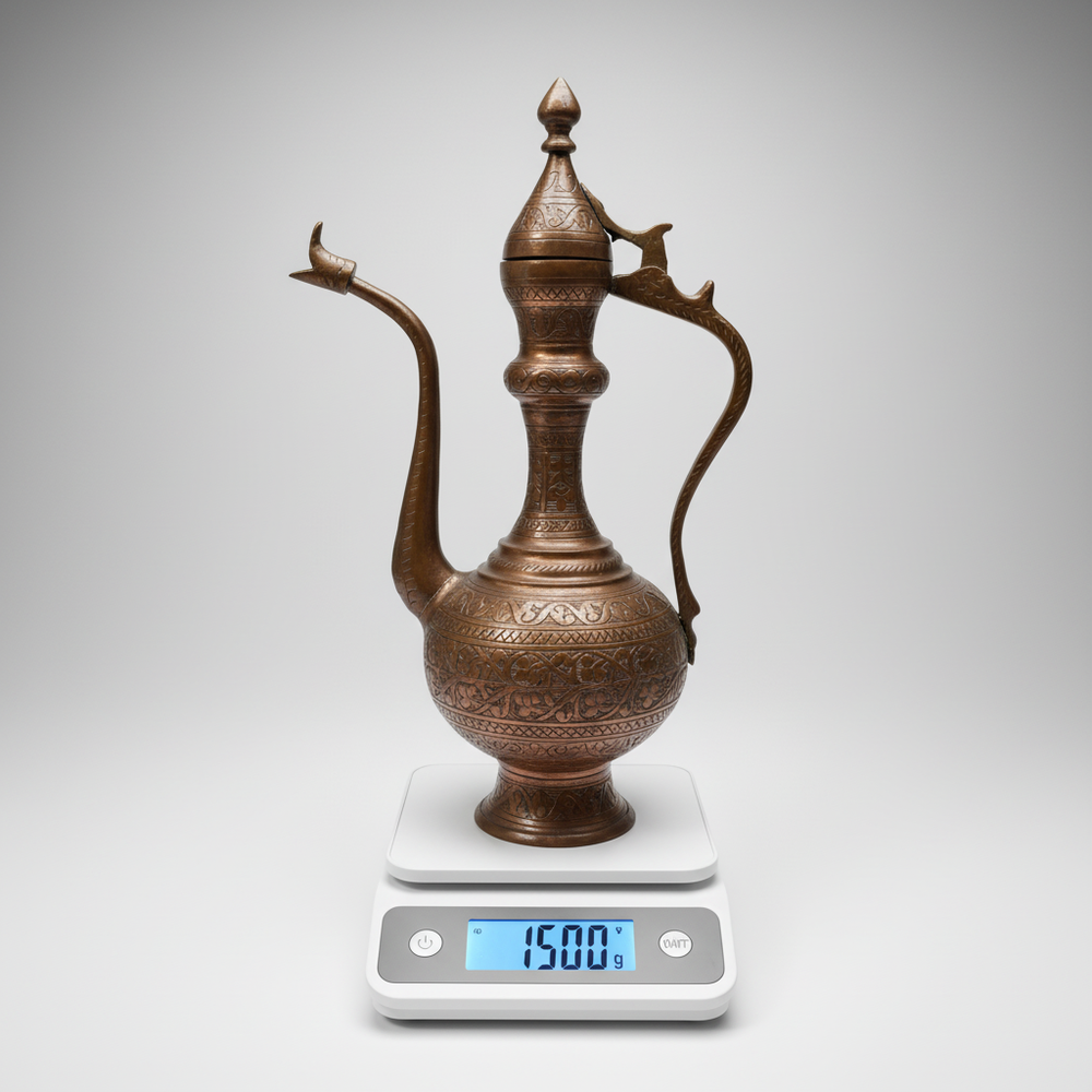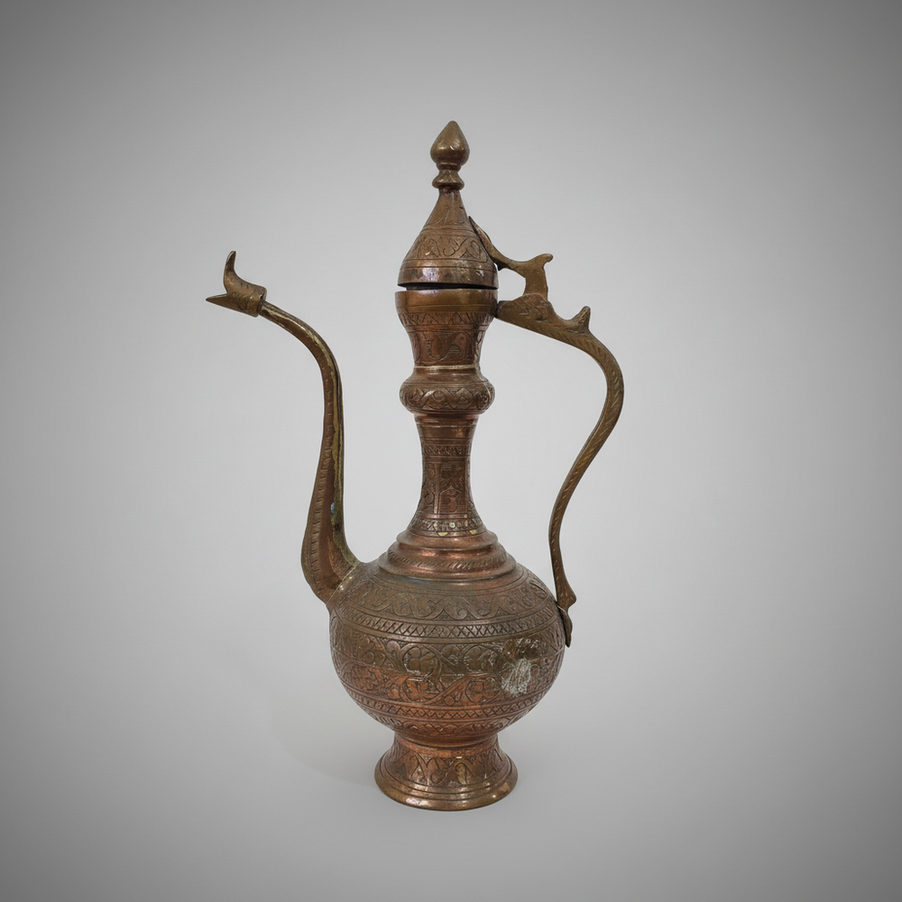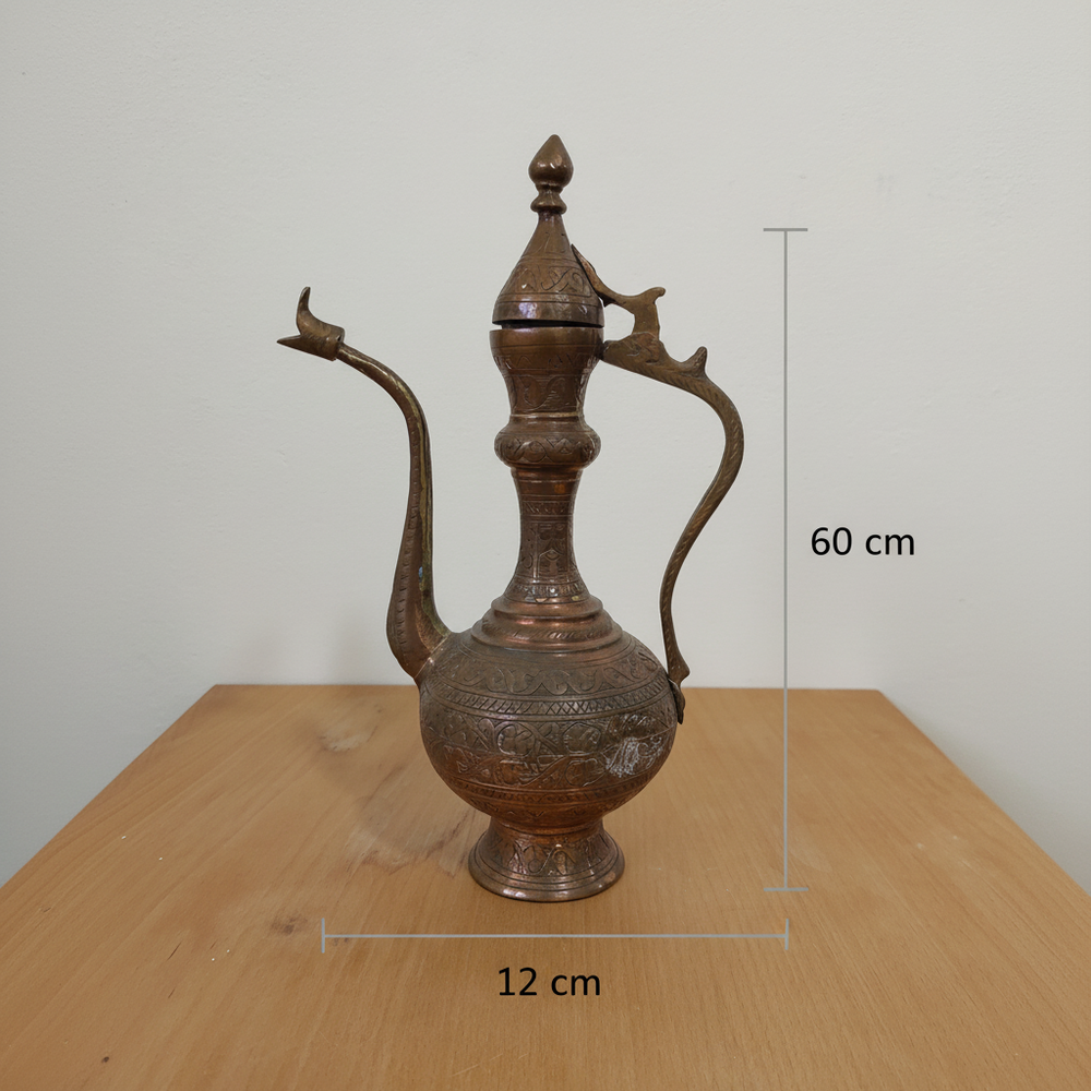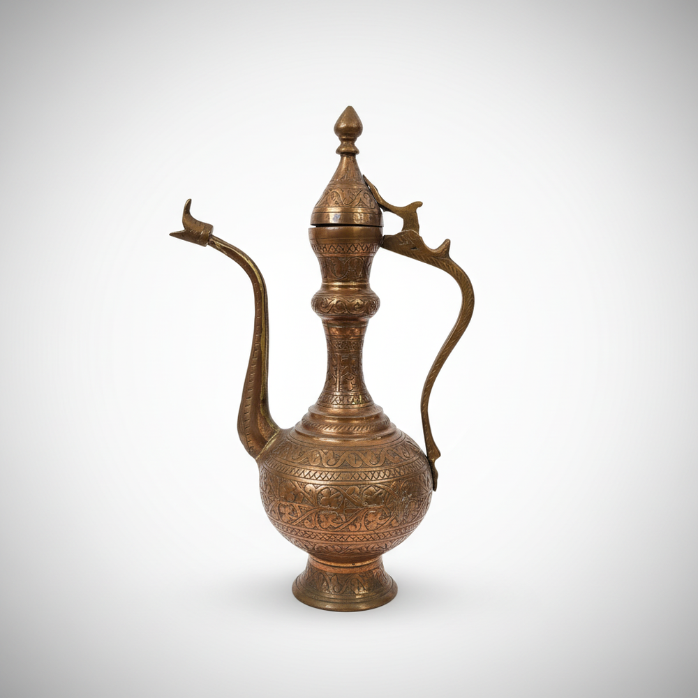 Vintage Engraved Brass Copper Ewer Pitcher Jug Antique Decor Art Collectible Vintage Engraved Brass Ewer — Intricate Hand-Etched Design | Vintage Condition Discover the beauty of this Vintage Engraved Brass Ewer , crafted from a brass or copper-tone metal alloy with exceptional handcrafted artistry and refined design. This elegant piece features intricate hand-engraved floral and geometric patterns across its body, handle, and spout, complemented by a distinctive animal-shaped finial on the hinged lid, making it perfect for enhancing your home decor or as a unique collectible item . Combining timeless charm with artistic elegance, it adds a sophisticated touch to any setting. Key Features: Made from high-quality brass or copper-tone metal for a lasting vintage appeal. Intricate hand-engraved patterns showcase skilled craftsmanship. Unique animal finial on a hinged lid adds distinctive character. Ideal for decorative display in various home settings. Collectible vintage piece with historical charm. Specifications: Material: Brass / Copper-tone metal alloy Karat / Hallmark: Null Weight: Null Dimensions / Size: Null Origin: Null Condition: Vintage