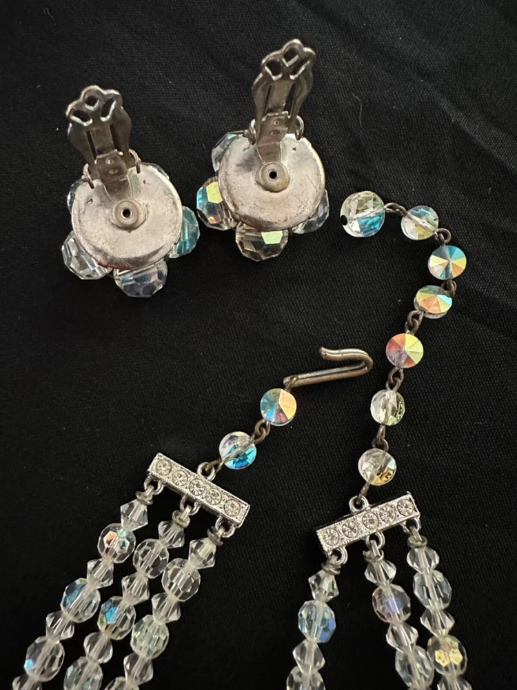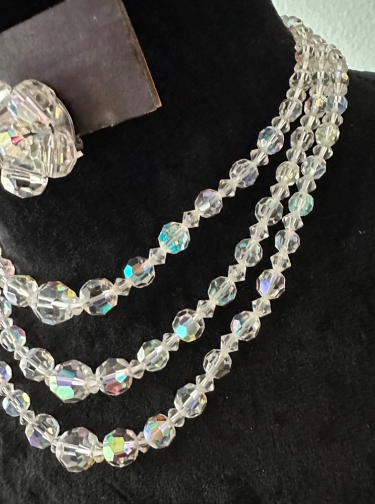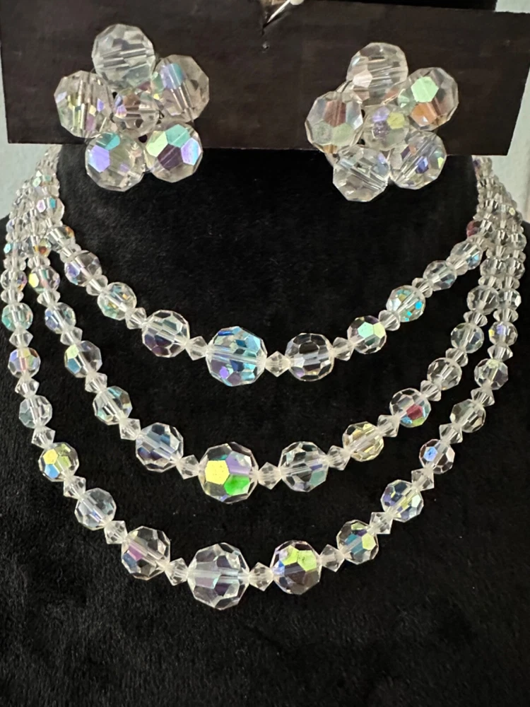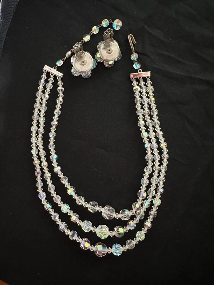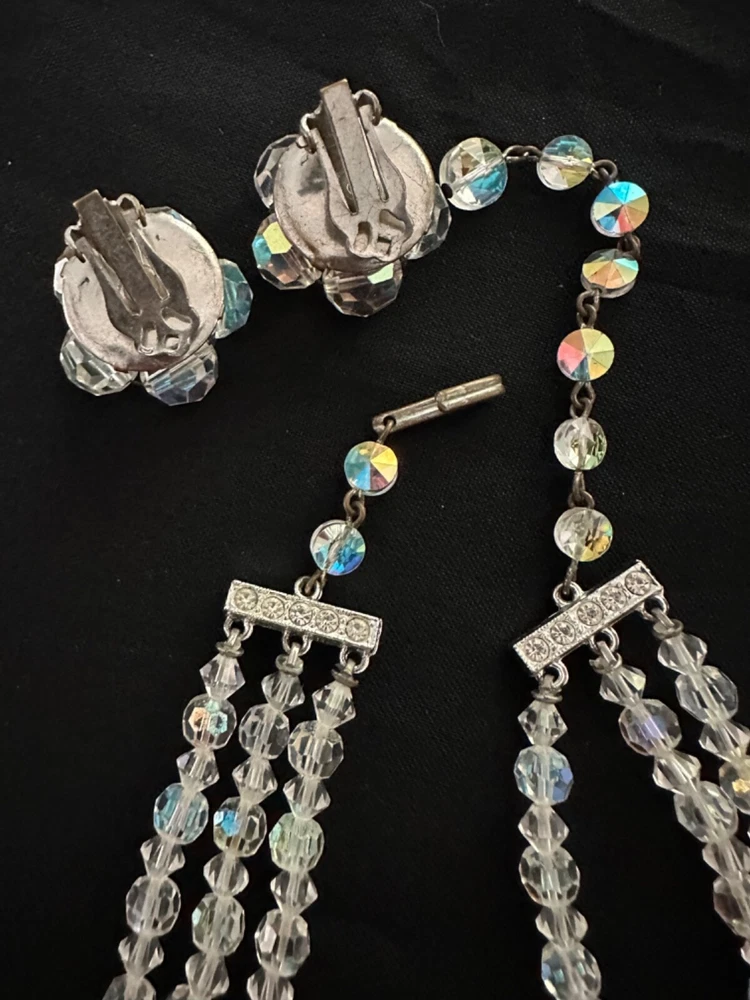 Stunning 1950s clear Aurora Borealis crystal 3 strand necklace and clip earrings set. The top necklace measures approximately 16” long with a 2-3 inch drop while the earrings are about 1” in diameter. See photos for measurements. Photos are accurate depiction of condition. If you have any questions, please ask. Thanks for looking!! Ships with USPS Ground Advantage. I do combine shipping on items purchased and/or won at auction at the same time. May not be possible with large or odd shaped items or glass. Please message me before paying. Thank you.