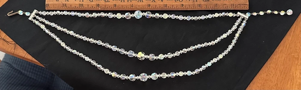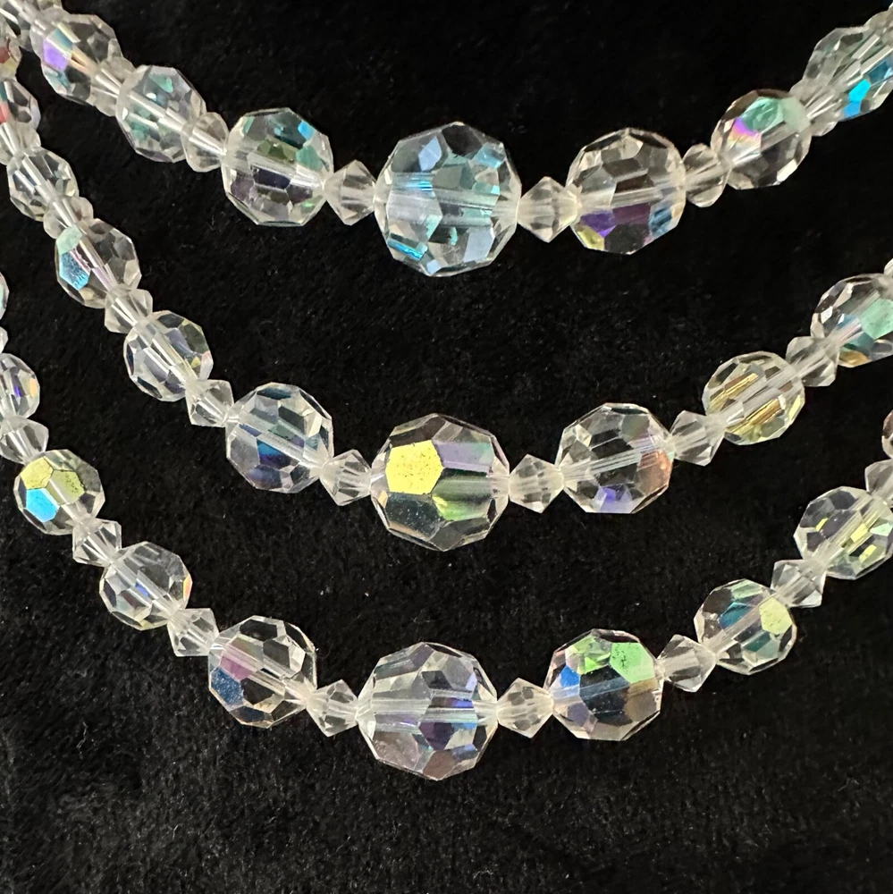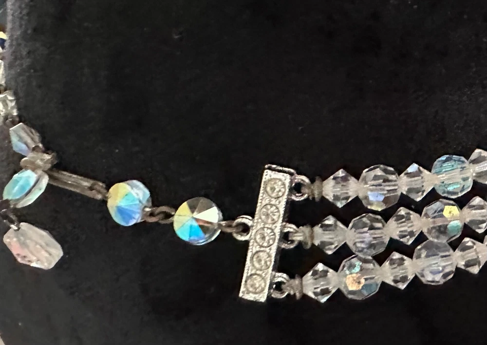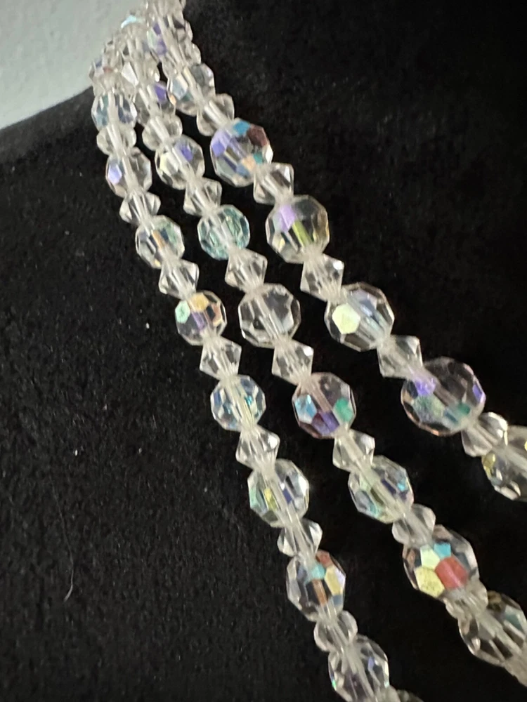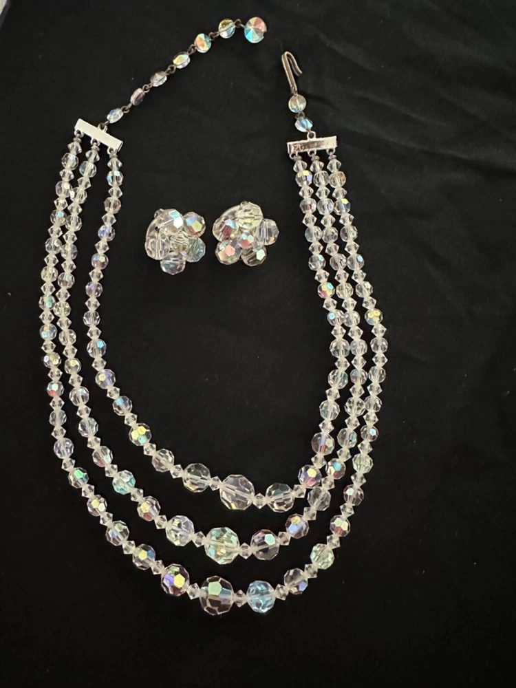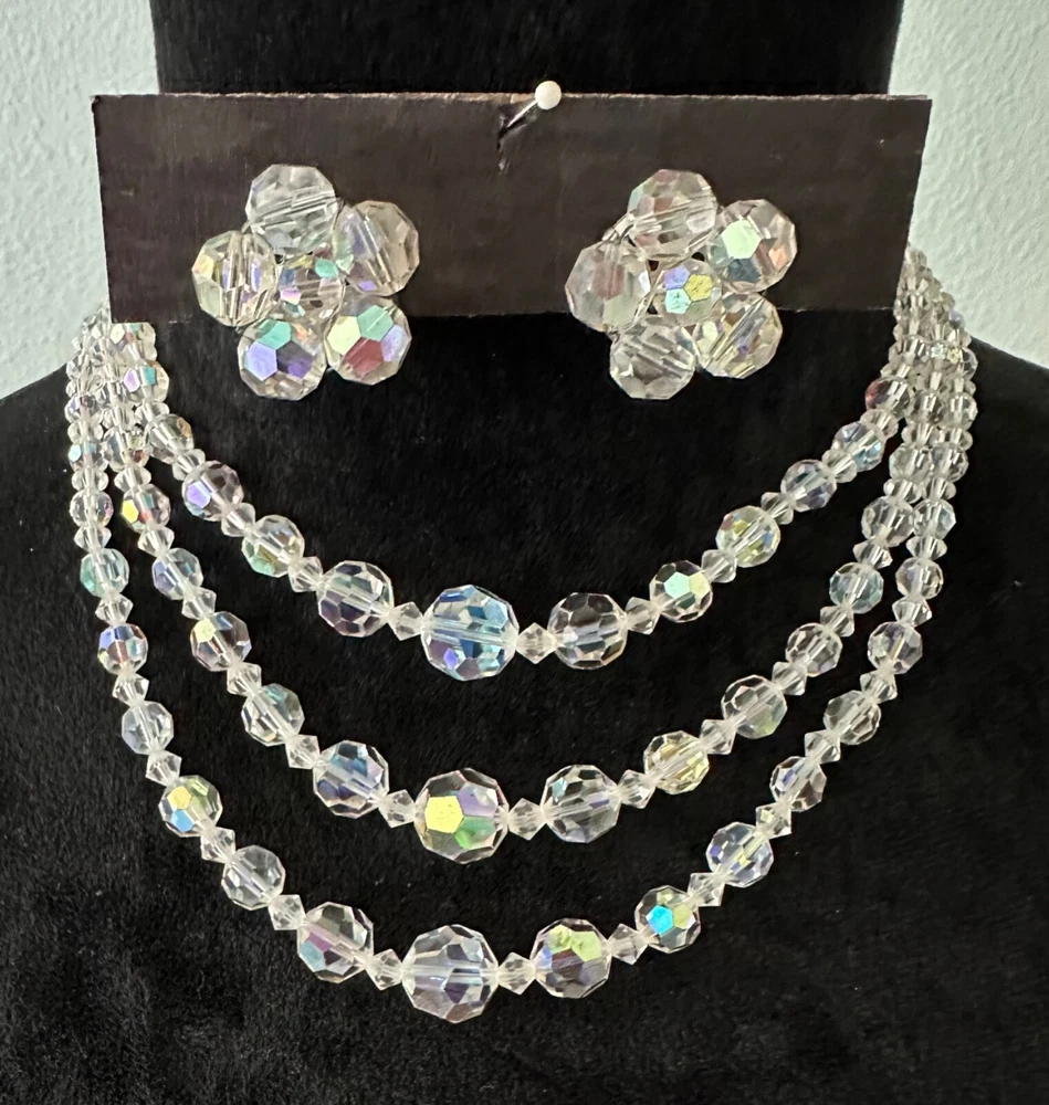 Stunning 1950s clear Aurora Borealis crystal 3 strand necklace and clip earrings set. The top necklace measures approximately 16” long with a 2-3 inch drop while the earrings are about 1” in diameter. See photos for measurements. Photos are accurate depiction of condition. If you have any questions, please ask. Thanks for looking!! Ships with USPS Ground Advantage. I do combine shipping on items purchased and/or won at auction at the same time. May not be possible with large or odd shaped items or glass. Please message me before paying. Thank you.