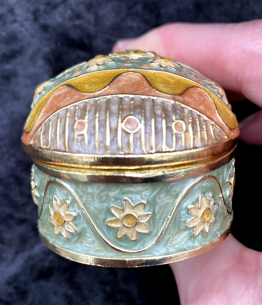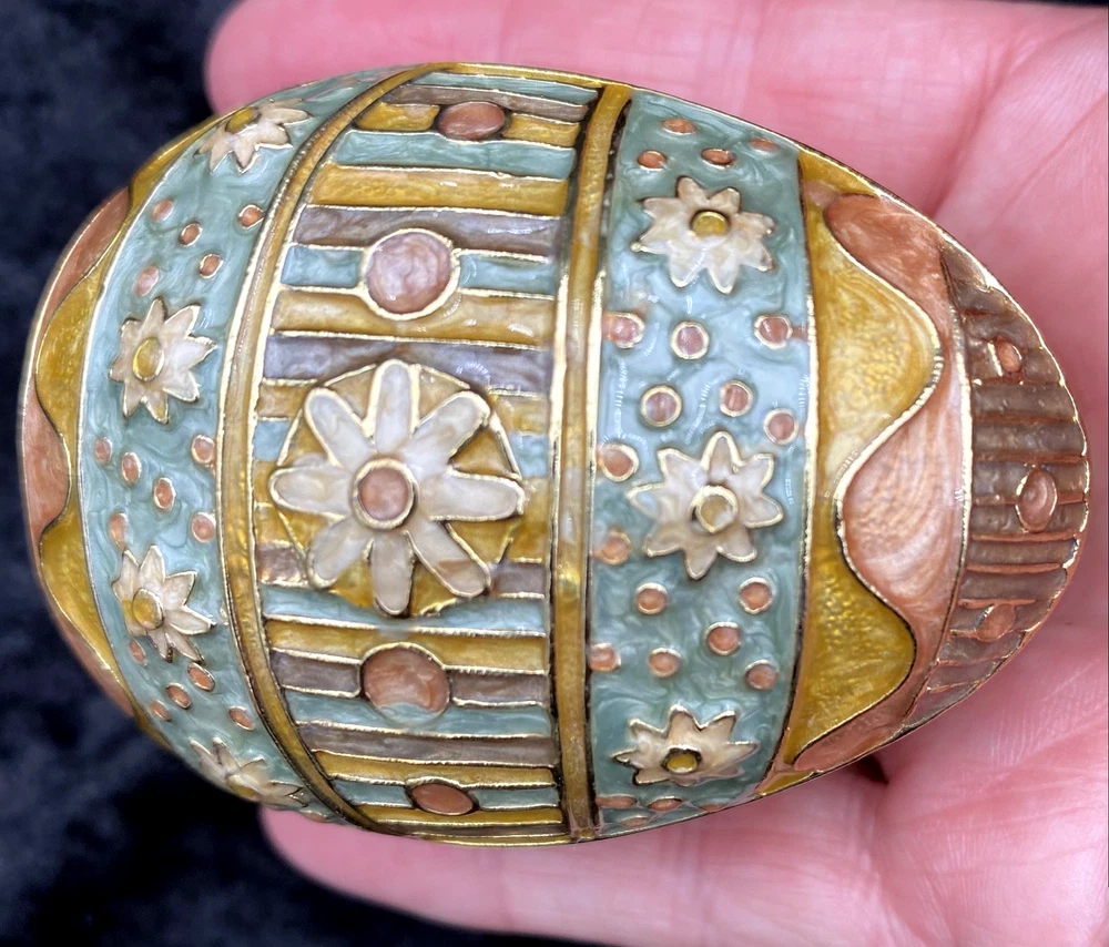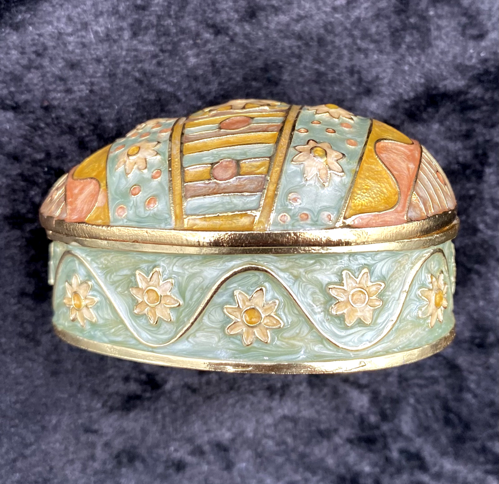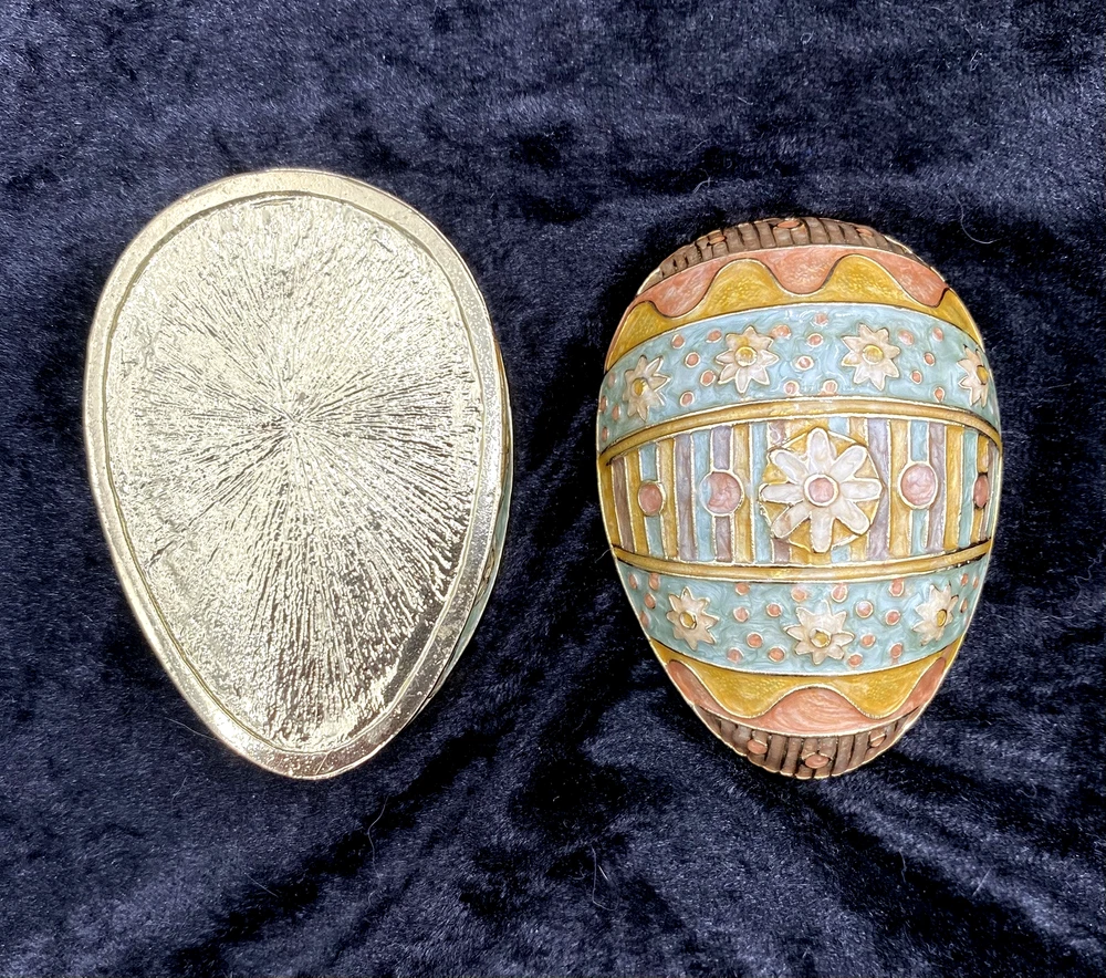 Discover a touch of elegance with this vintage gold enameled egg trinket box, reminiscent of the Fabergé style. Adorned with a delicate floral pattern, this small yet heavy keepsake box is a testament to craftsmanship, featuring a lustrous finish and a luxurious gold trim that exudes sophistication. The multicolored enamel details provide a captivating contrast, making it a versatile piece that complements any decor. Convenience and security are ensured with a double magnetic closure, keeping your treasures safely tucked away. Measuring 3 inches in length, 1.5 inches in height, and 2.2 inches in width, this trinket box is perfect for all occasions. The trinket box is in excellent used condition. There are no chips or cracks and very minimal wear (on the inner rim of the lid).