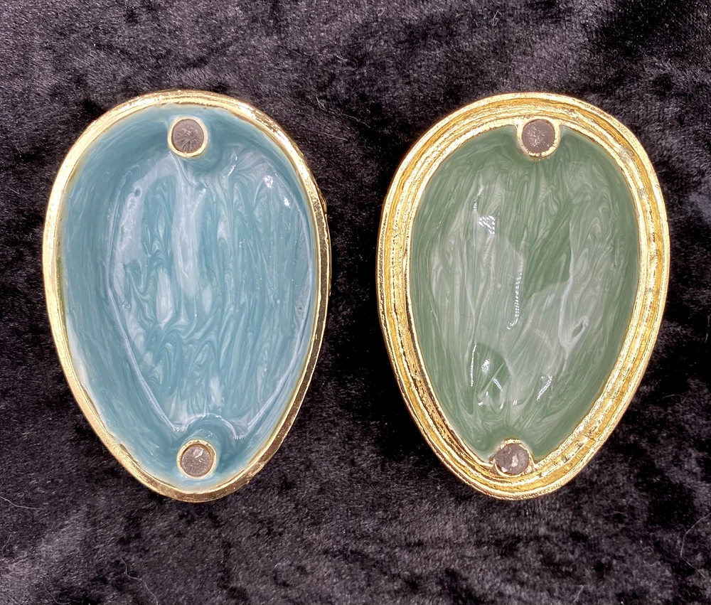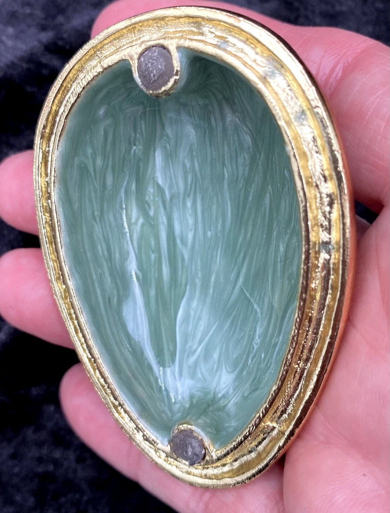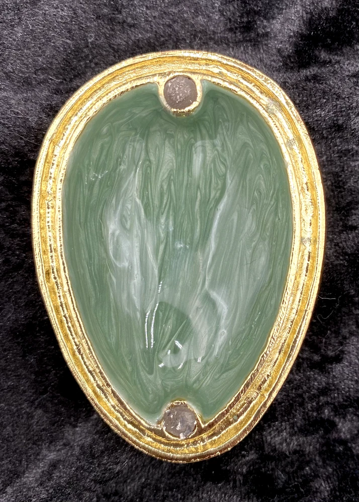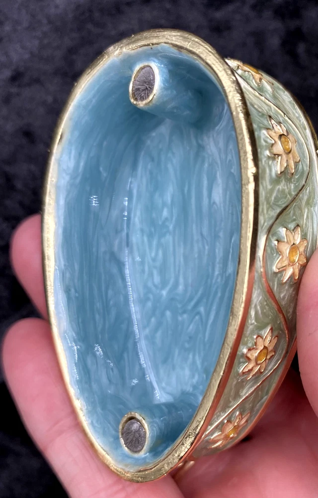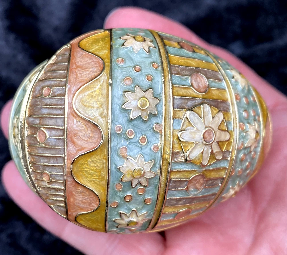 Discover a touch of elegance with this vintage gold enameled egg trinket box, reminiscent of the Fabergé style. Adorned with a delicate floral pattern, this small yet heavy keepsake box is a testament to craftsmanship, featuring a lustrous finish and a luxurious gold trim that exudes sophistication. The multicolored enamel details provide a captivating contrast, making it a versatile piece that complements any decor. Convenience and security are ensured with a double magnetic closure, keeping your treasures safely tucked away. Measuring 3 inches in length, 1.5 inches in height, and 2.2 inches in width, this trinket box is perfect for all occasions. The trinket box is in excellent used condition. There are no chips or cracks and very minimal wear (on the inner rim of the lid).