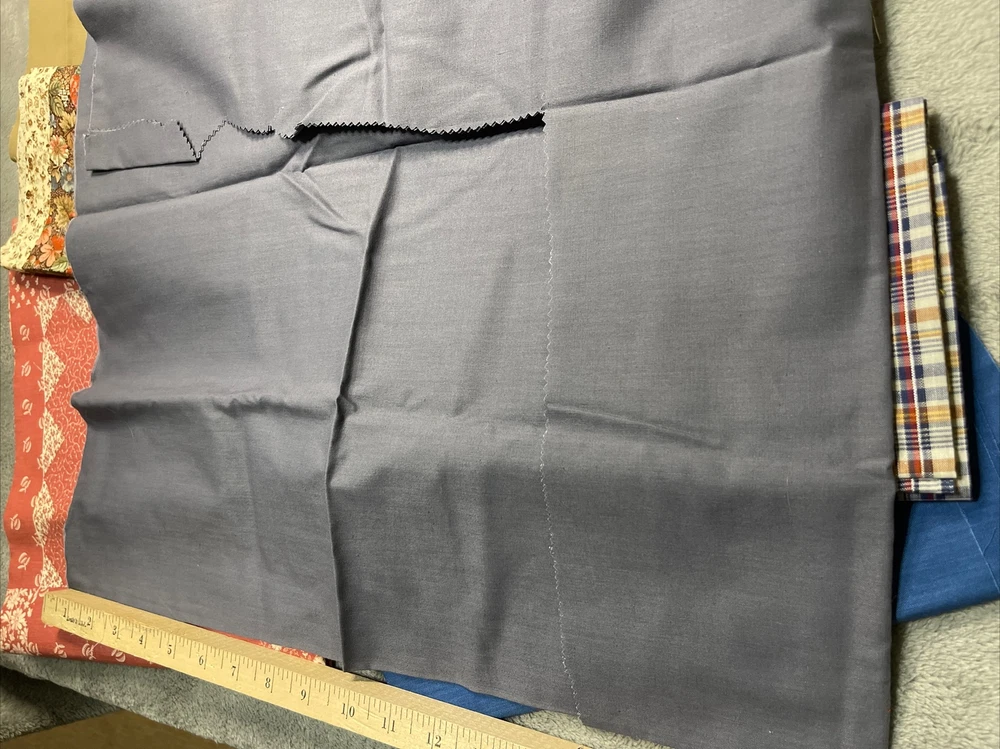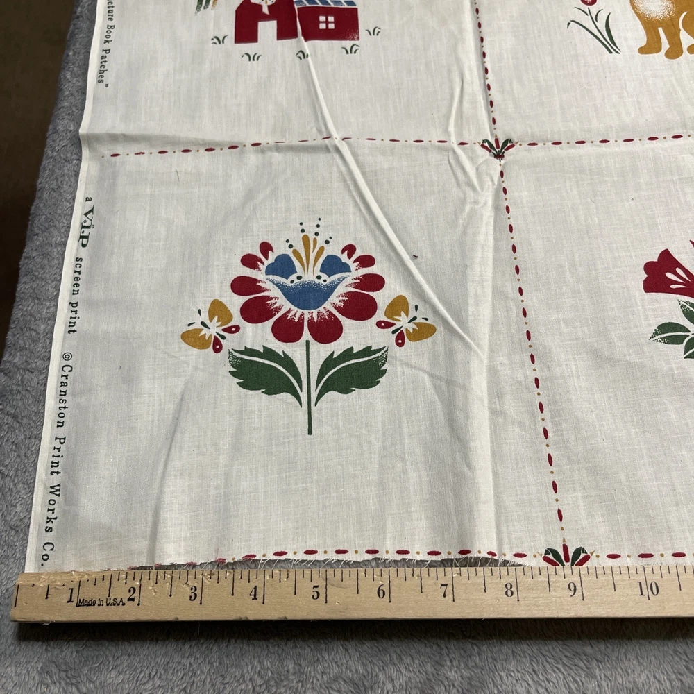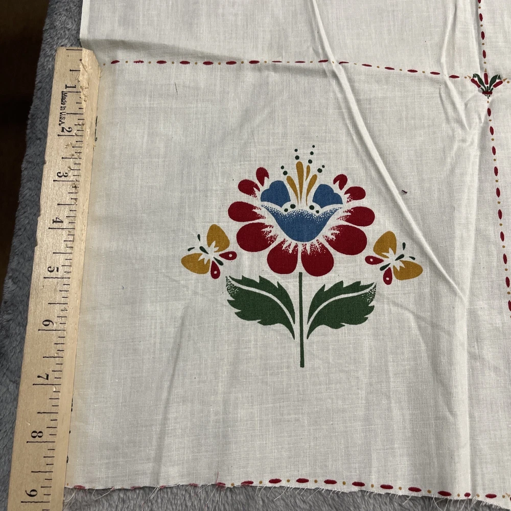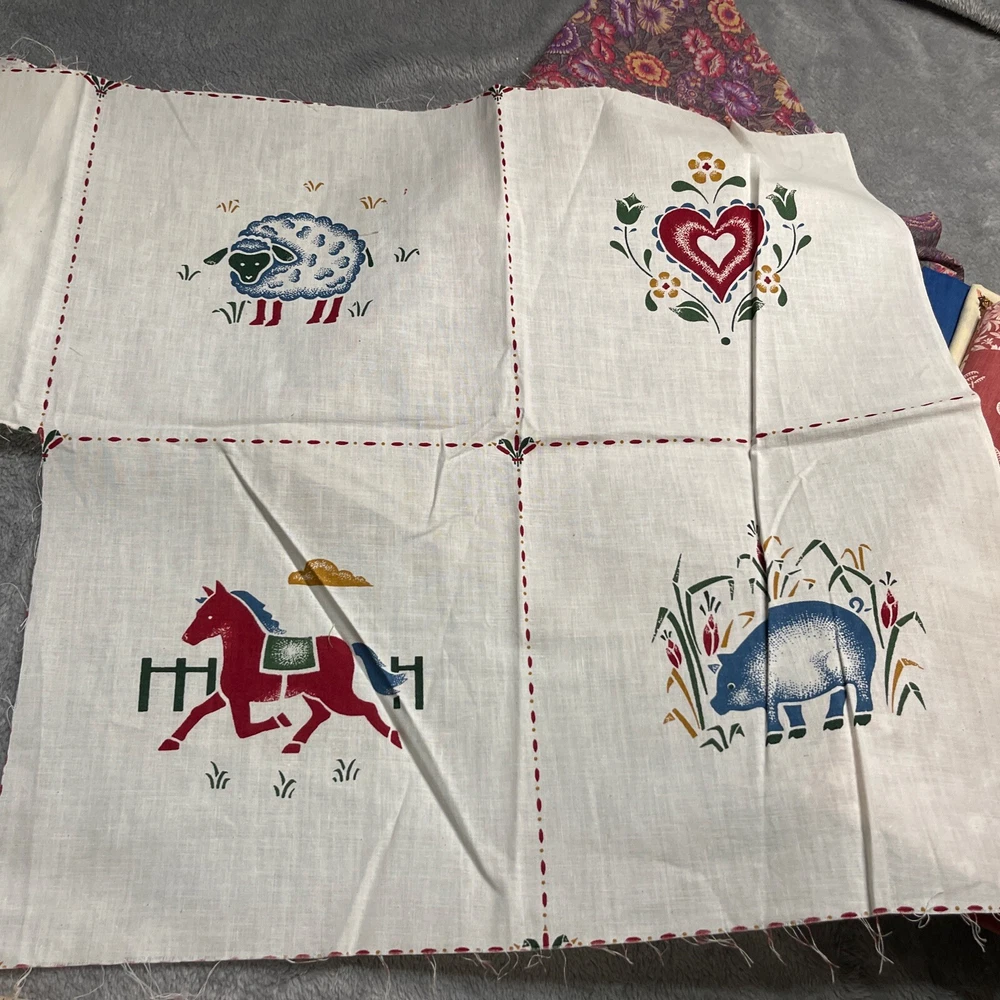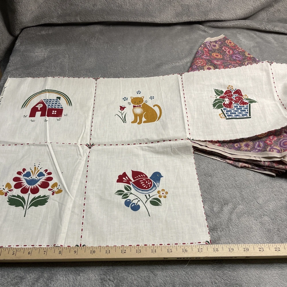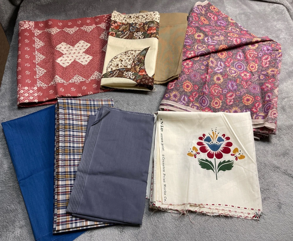 This vintage fabric is a charming addition to any collection. It features a delightful floral and striped pattern in multicolor shades, perfect for all occasions. Made of light cotton material, it's suitable for quilting projects with a country style theme. The fabric is from the 1980s and comes in various sizes. It's an original piece and perfect for those who appreciate the beauty of vintage textiles. Add this to your linens and textiles collection today! Gray/Blue fabric is 39 inches x 44 inches with a section of 15 inches x 24 inches cut out. Stripe with silver stripe fabric is 33 inches x 44 inches. Bright Blue fabric is 22.5 inches x 44 inches. Square patterned fabric is 22 inches x 22 inches. Tan fabric is in two strips measuring 31 inches x 10 inches each. Pink star fabric is 36 inches x 44 inches. The country squares are 9 inches x 9 inches for a total of 9 squares. The floral fabric is 86 inches x 20 inches with a 11 inch x 9.5 inch piece cut out and a 32 inch x 23 inch section making it an L shape piece of fabric.