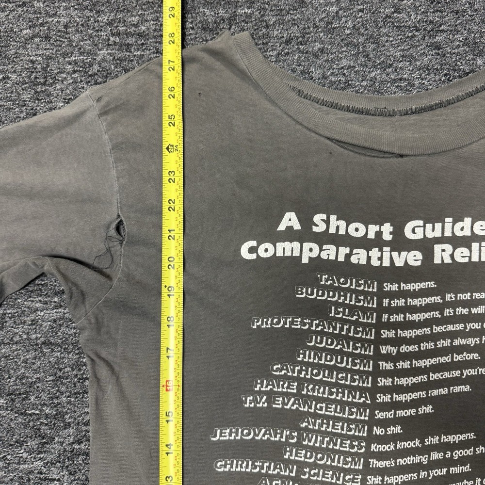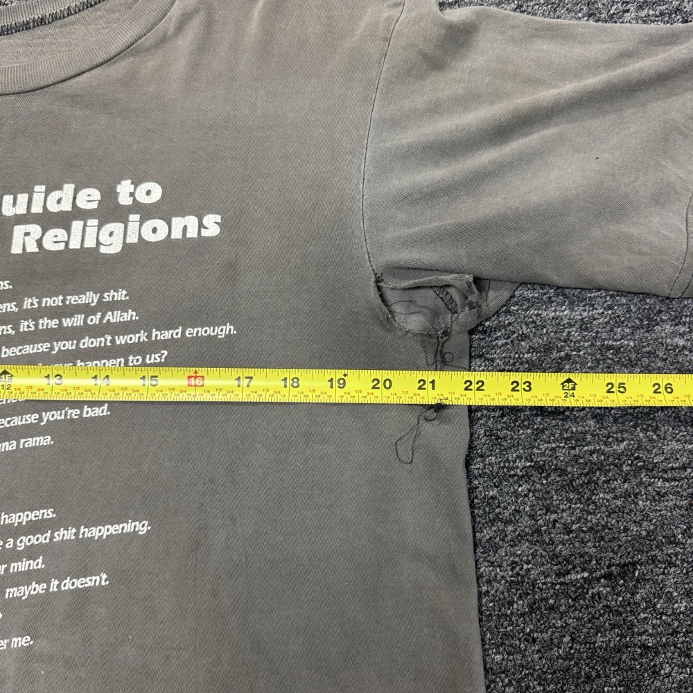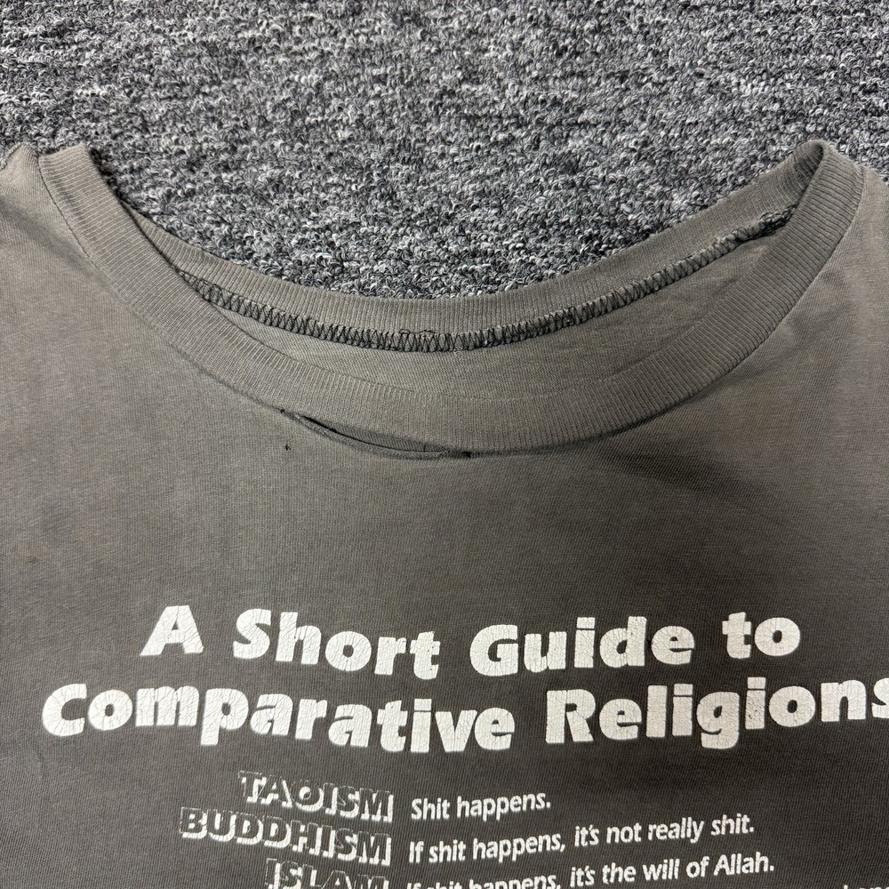 The Vintage Faded Thrashed Gray Religion Funny Joke T-shirt for men in size L is a regular fit T-shirt with a graphic print featuring a humorous religious joke. Made from lightweight cotton material, this short sleeve tee has a round neckline and is designed for comfort and style. Perfect for those looking for a unique and playful addition to their wardrobe, this shirt is ideal for casual wear and adding a touch of humor to any outfit.