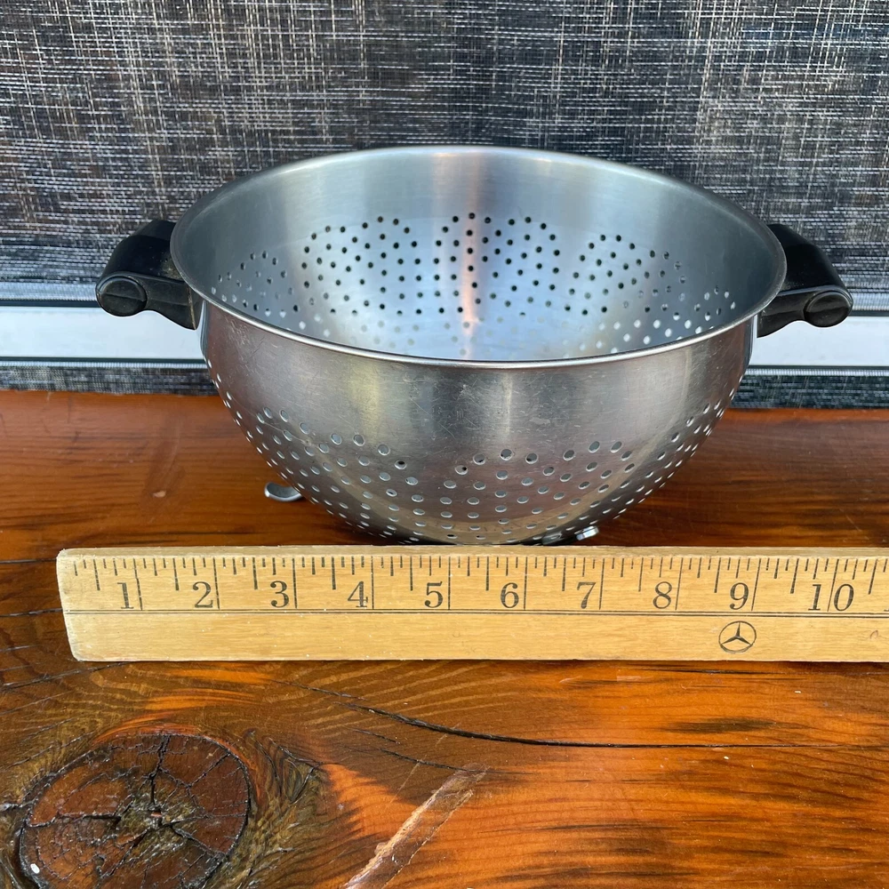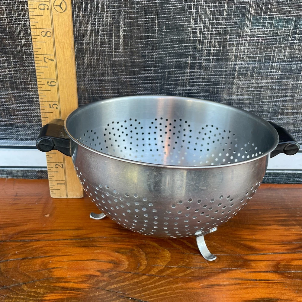 Vintage: Farberware Stainless Steel Colander Strainer Black Handles Footed 8"W x 5”D Heart shaped holes in the sides. Made in USA Closet shelf #2 for inventory