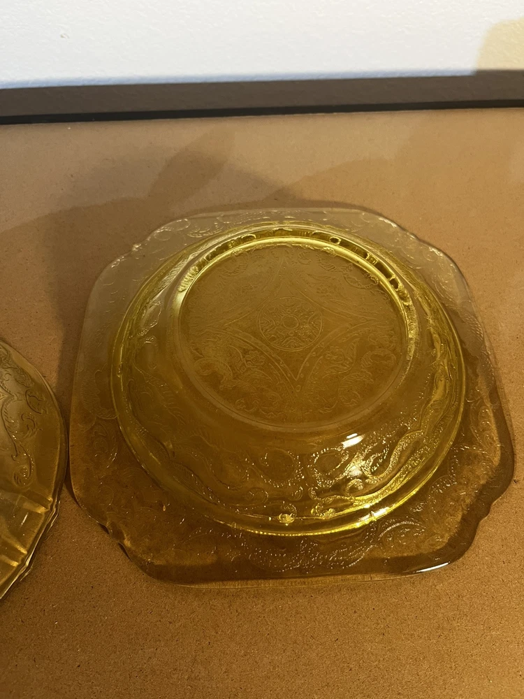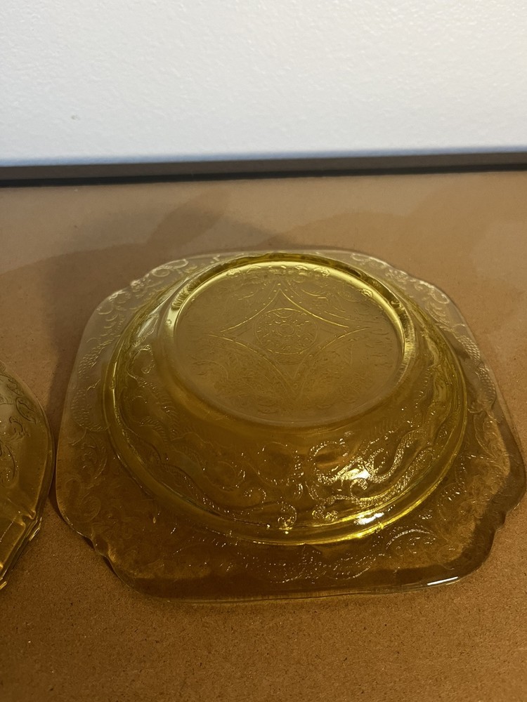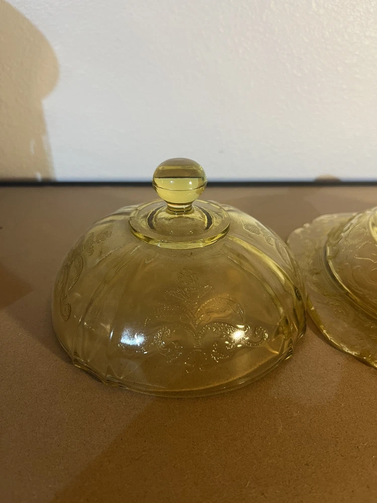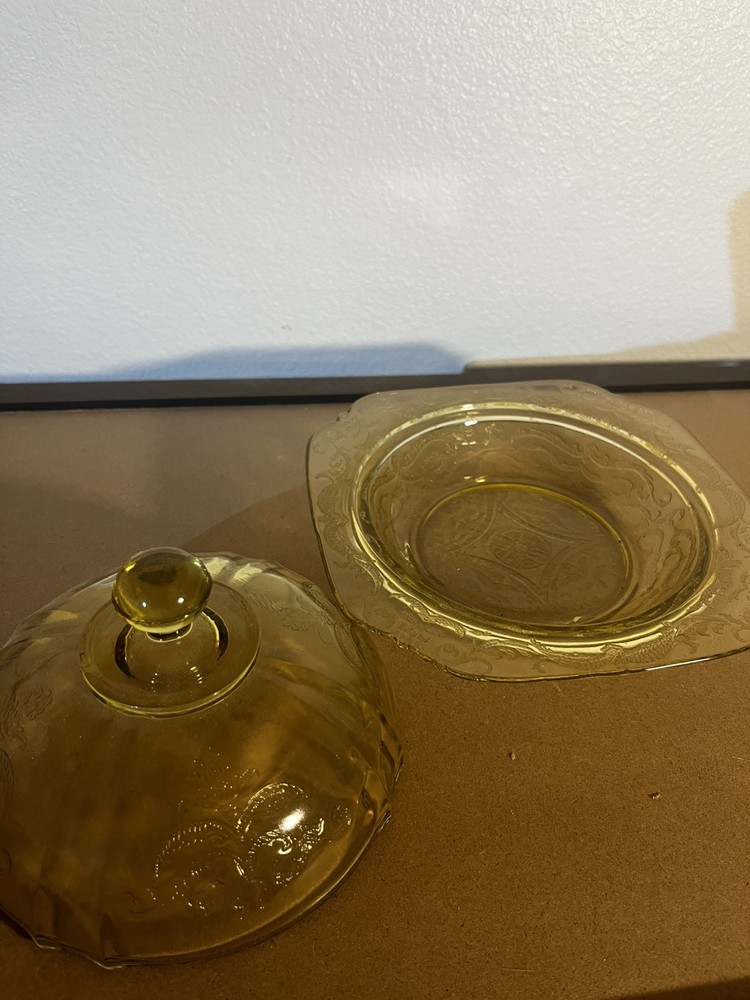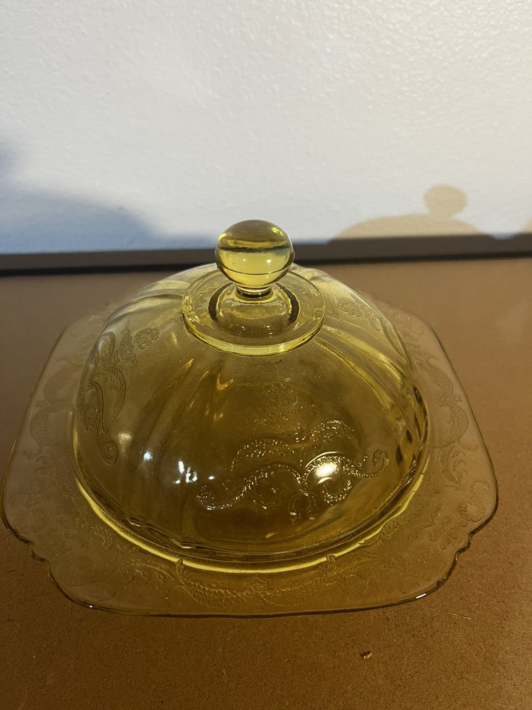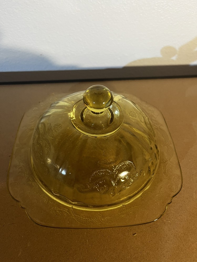 This is a vintage Federal Glass butter dish in the Madrid pattern from the American Home Collection. Made of depression glass in an amber color, this Federal piece showcases a classic American design. Perfect for collectors of glassware, this butter dish exudes a Federal style and is a charming addition to any kitchen or dining room.