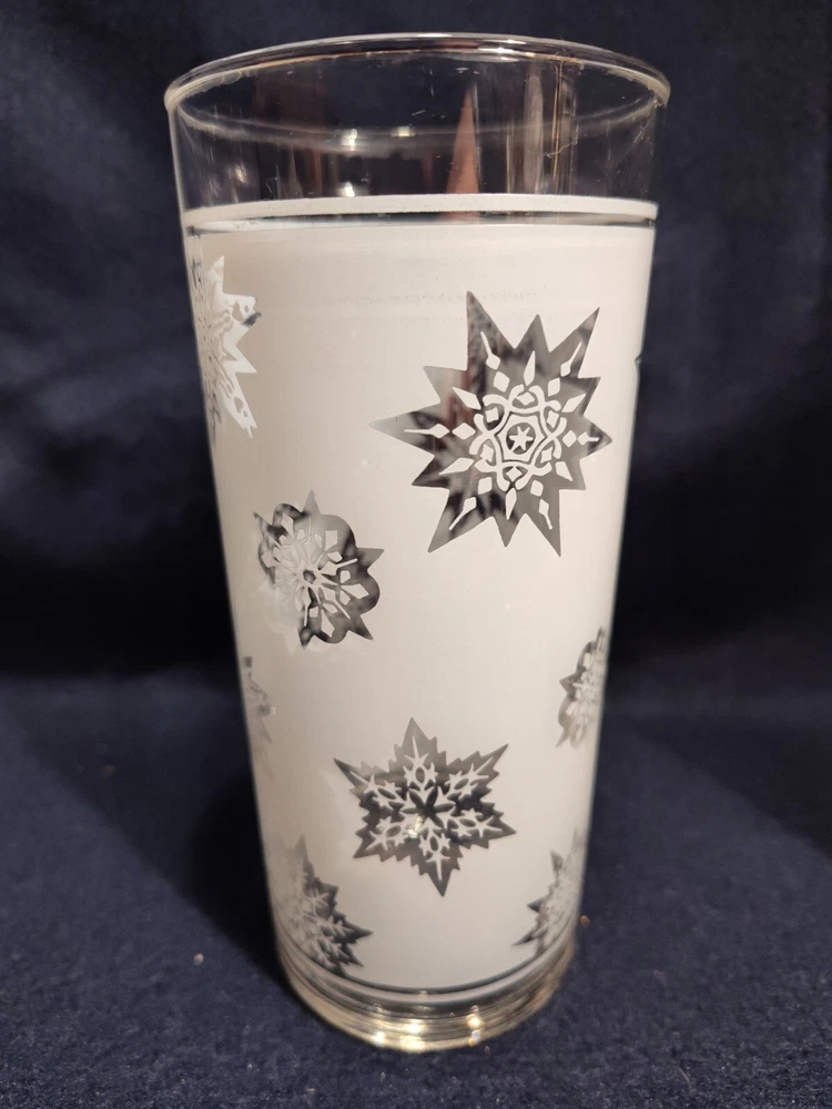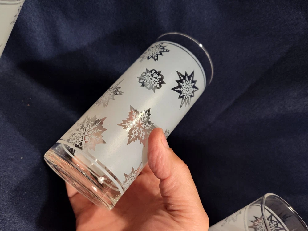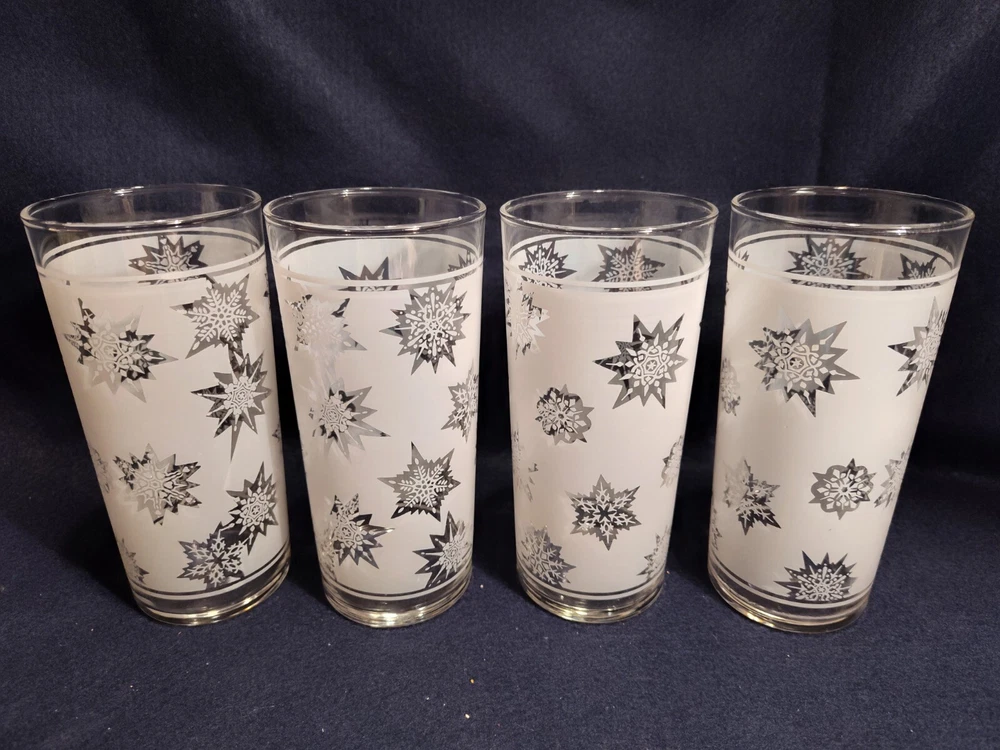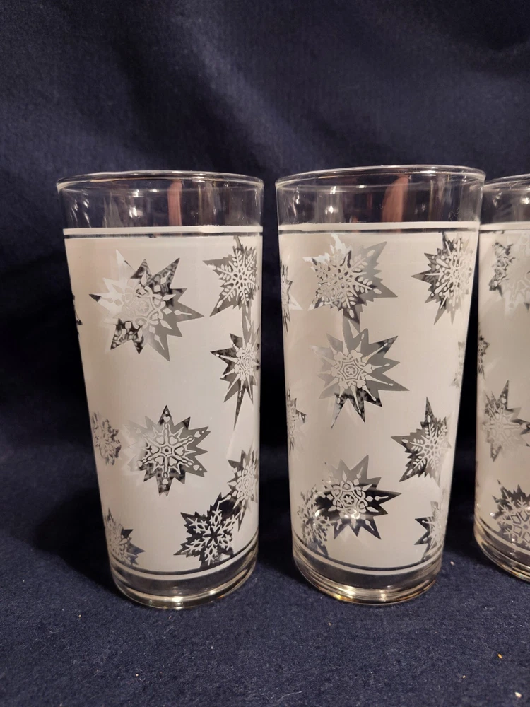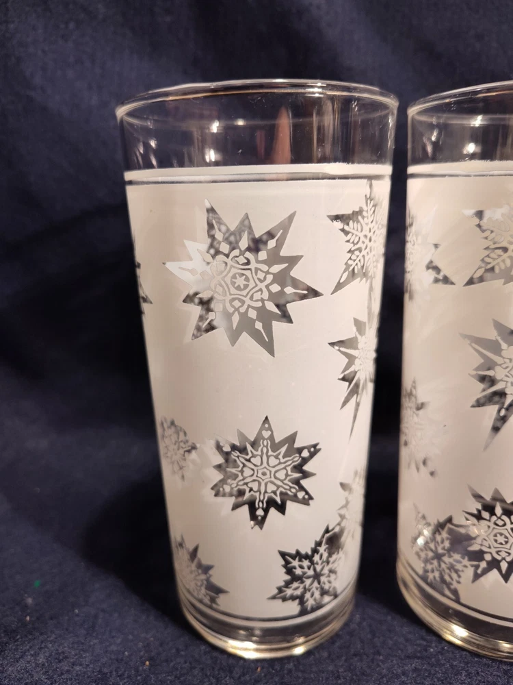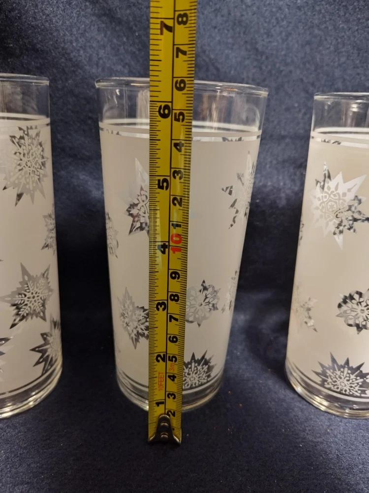 Great set of mid century drinking glasses perfect for wintertime with decorative snowflakes on a frosted background. Glasses have a capacity of 12 ounces. Glasses measure 6.25 inches tall and 3 inches wide. Glasses are a nice mid to lighter weight. Glasses are in very good condition.