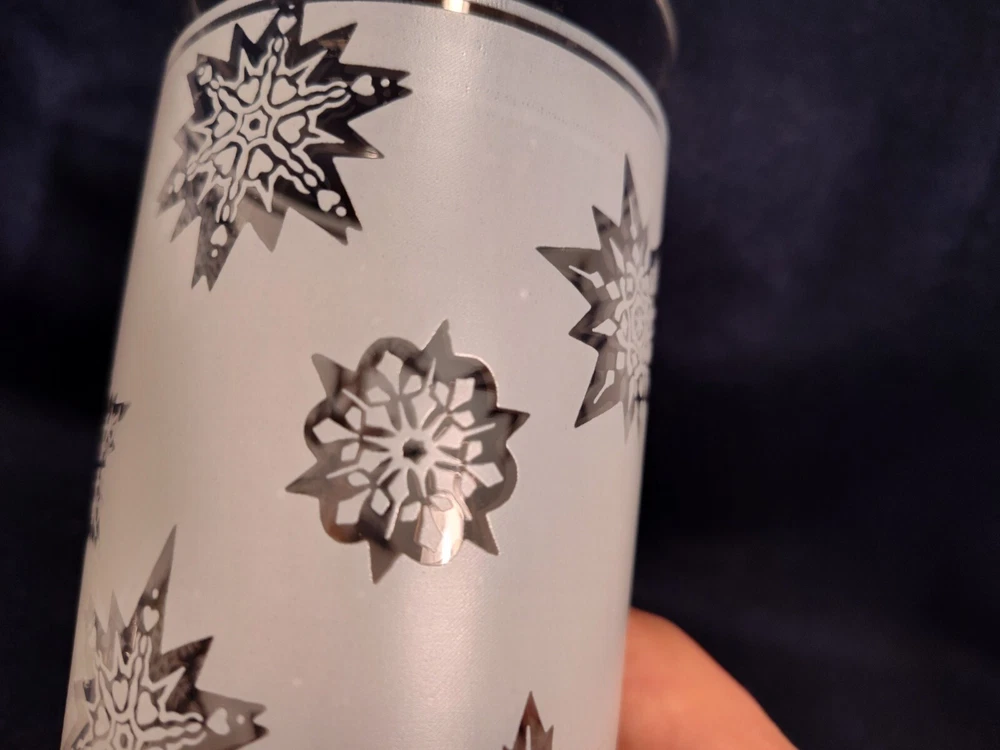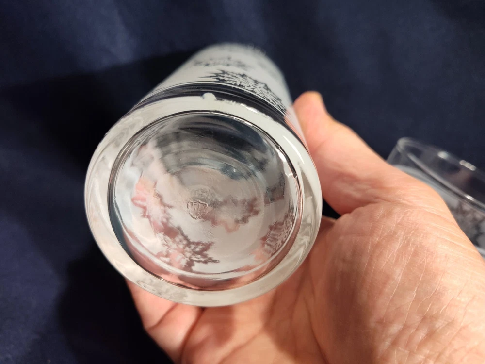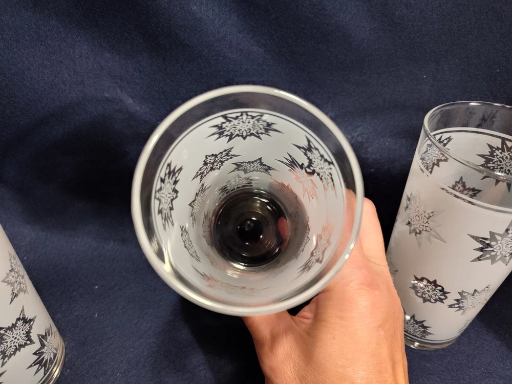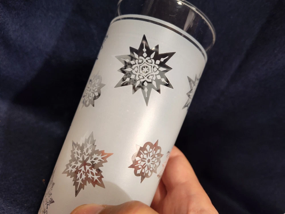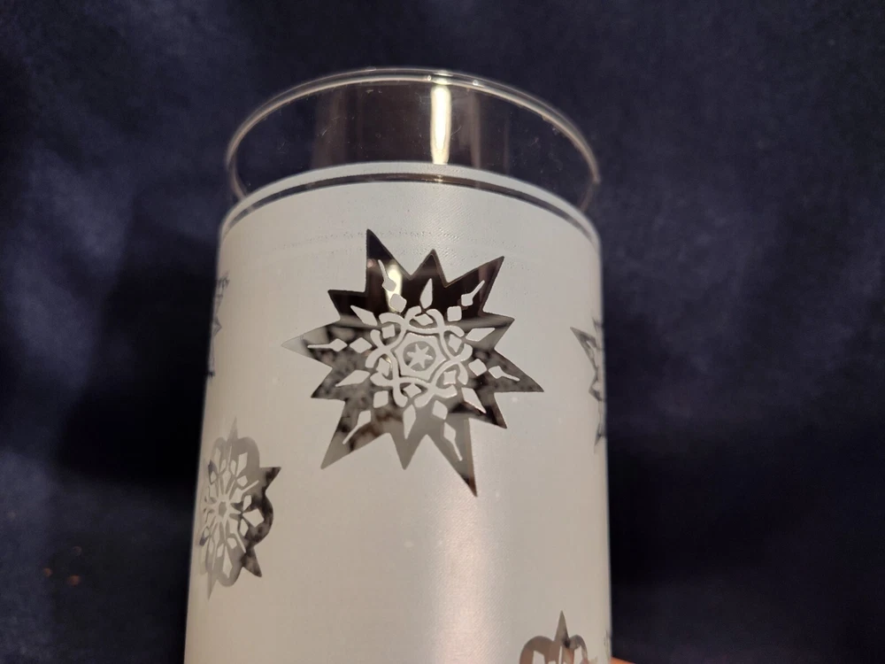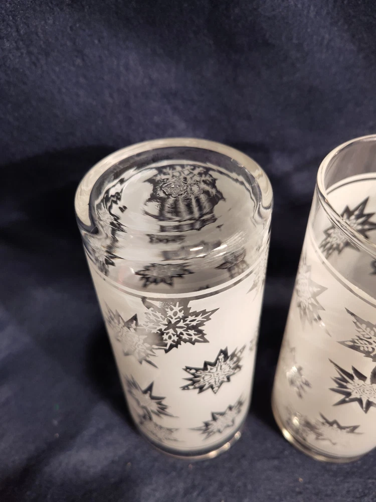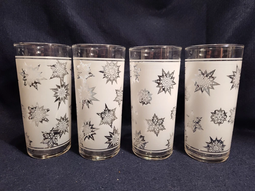 Great set of mid century drinking glasses perfect for wintertime with decorative snowflakes on a frosted background. Glasses have a capacity of 12 ounces. Glasses measure 6.25 inches tall and 3 inches wide. Glasses are a nice mid to lighter weight. Glasses are in very good condition.
