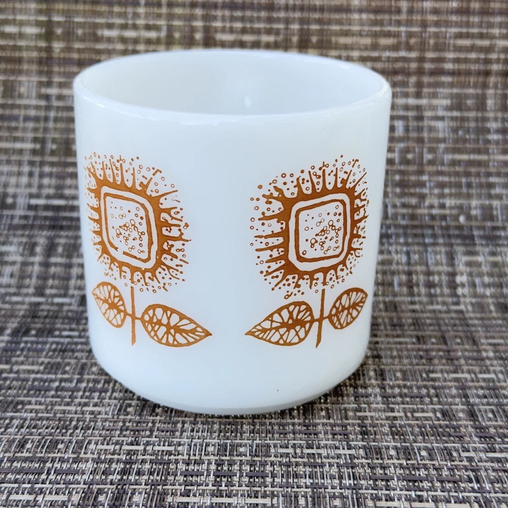 This vintage milk glass coffee mug from the Federal Glass Company features a beautiful sunflower design in golden brown. The mug stands at 3 1/8" tall and is perfect for enjoying both hot and cold beverages. **One small flaw shown in picture.