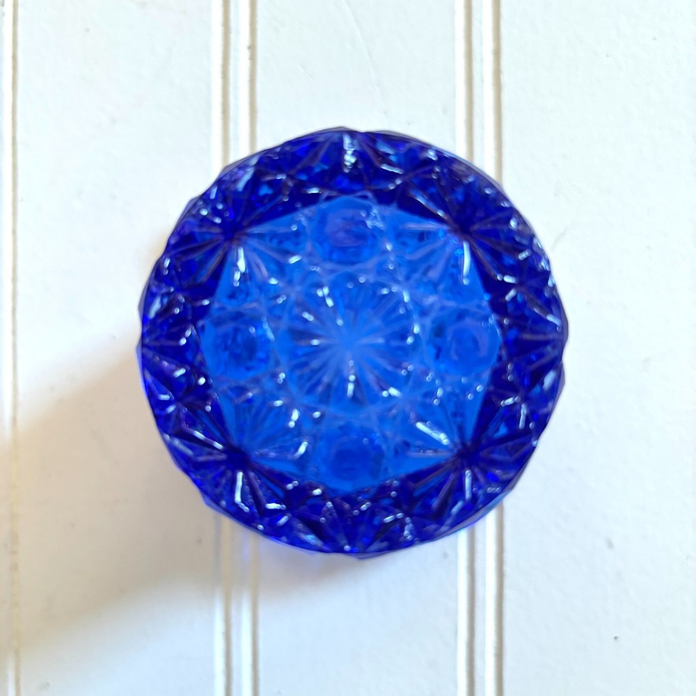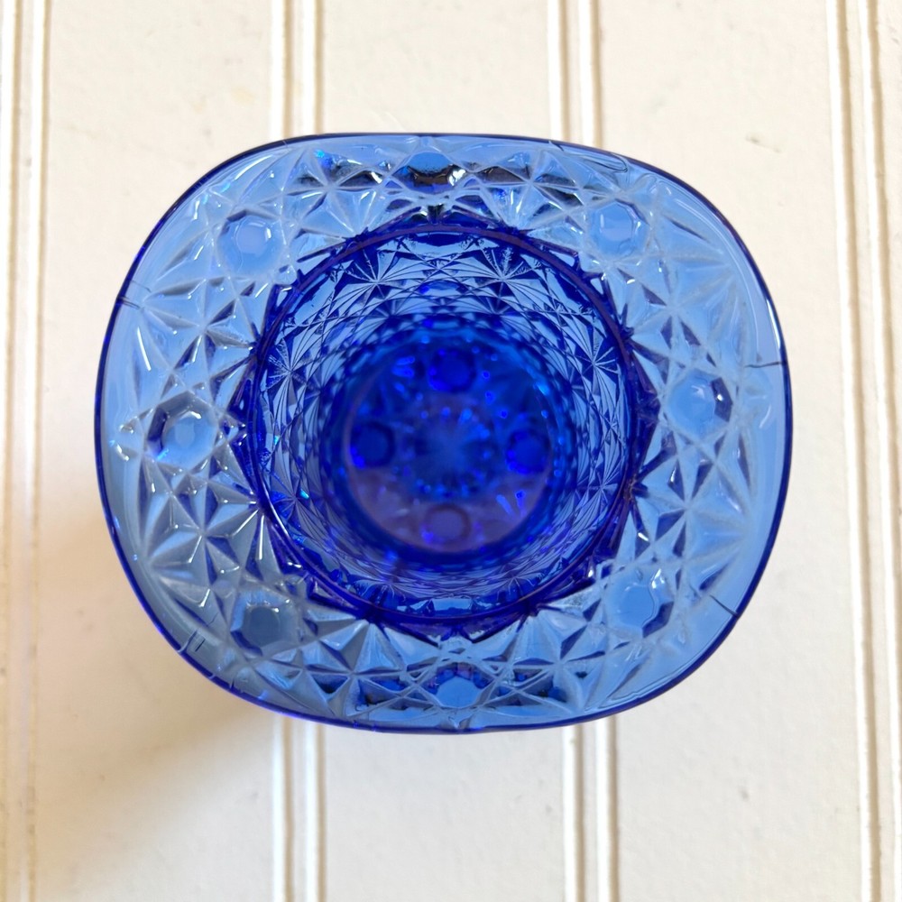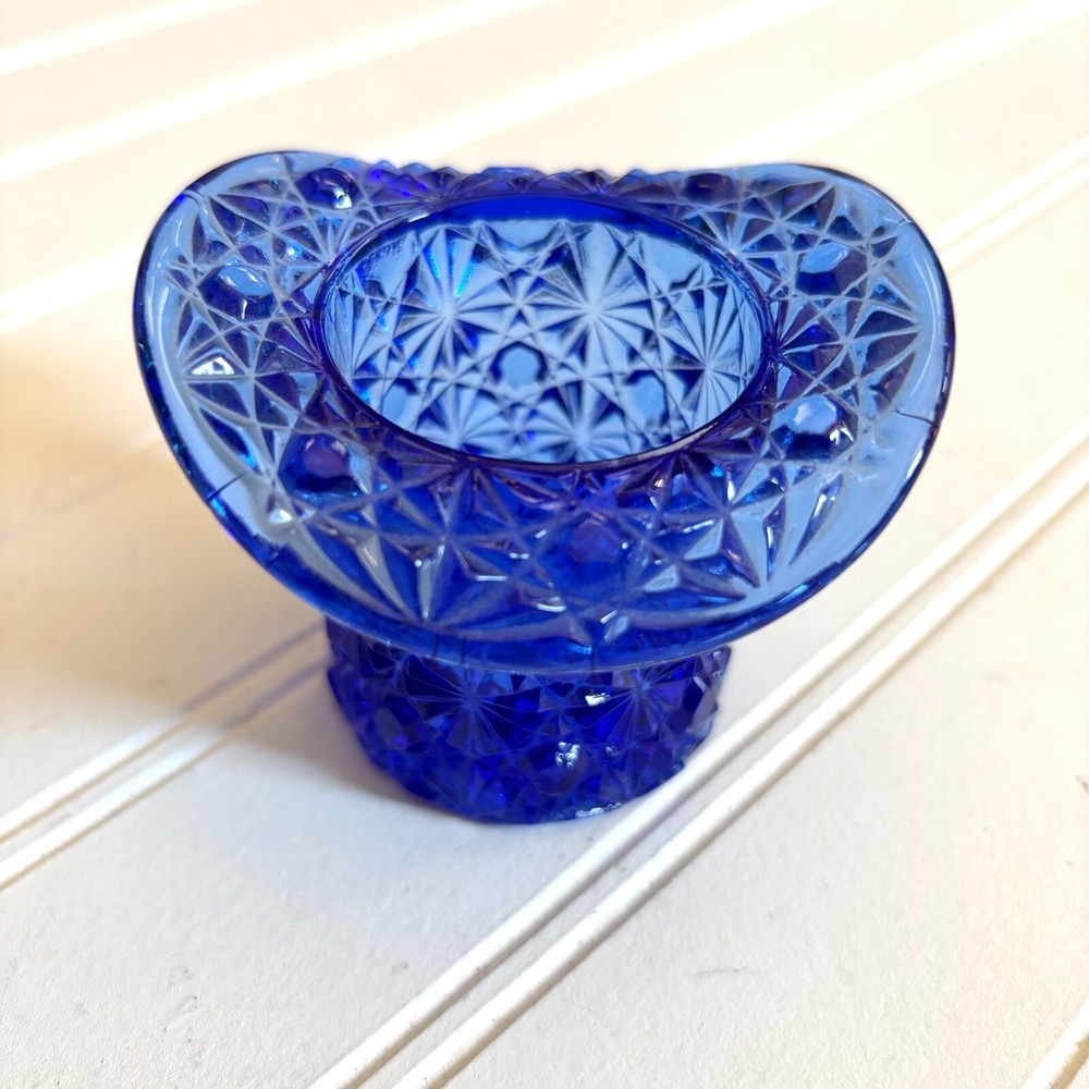 Fenton Cobalt Blue Top Hat Toothpick Holder, Glass Daisy and Button Pattern for holding Cigarettes, Matches, Votive Candles or whatever you can dream up! This fancy blue glass gem stands 2 1/2 inches high and 3 inches across. Just a stunner!