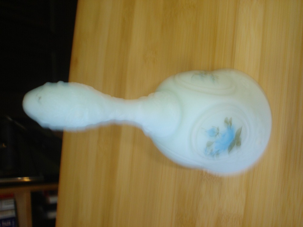 Add a touch of elegance to your collection with the Vth Fenton Hand Painted Blue Roses on Blue Satin Blue Bells, signed by the artist. Crafted meticulously with a medallion pattern featuring exquisite blue roses, this vintage piece embodies the timeless beauty of Fenton's art glass. The delicate hand-painted details on the blue satin glass create a captivating floral theme that is sure to charm any admirer. Dating back to the late 20th century, specifically from 1978 to 1982, this 7-inch tall bell showcases the superb craftsmanship of the era. It's a wonderful representation of the Blue Roses subject/theme, complemented by the unique characteristics of being a signed and handmade piece. This decorative bell, with its origins in the USA, is an authentic vintage original that brings the art glass production style of the period right into your home decor.