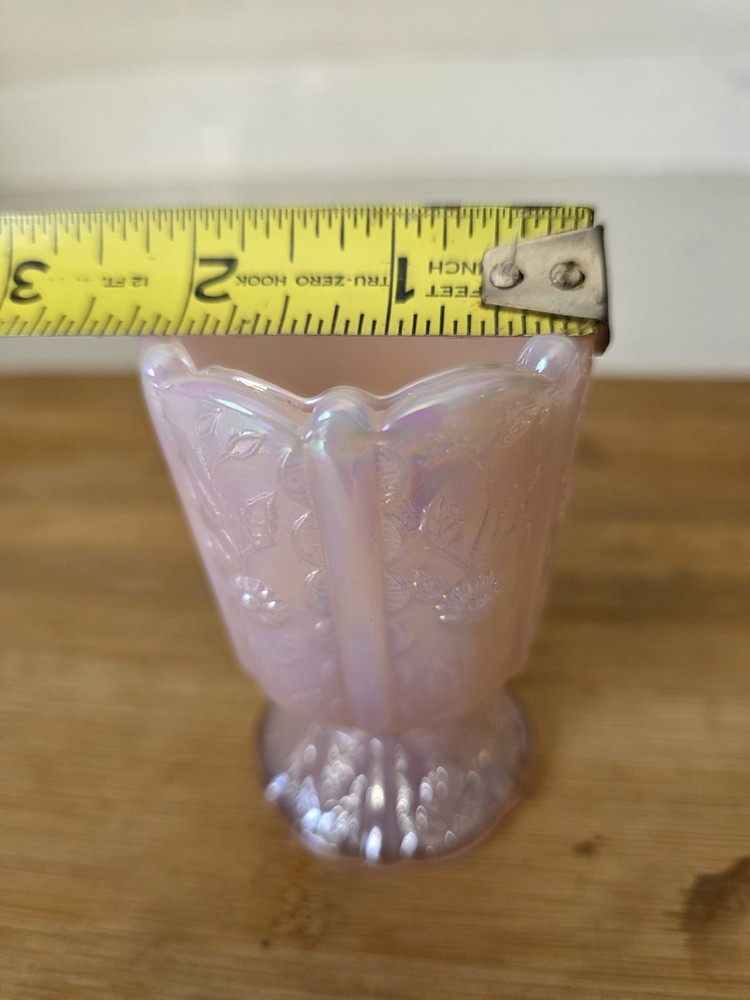 The Vintage Fenton Light Pink Paneled Daisy Toothpick Holder is a charming collectible piece made of opalescent pearl glass in the United States. Standing at 3 5/8 inches tall and 2 1/4 inches wide, this original toothpick holder features a beautiful paneled daisy pattern, adding a touch of elegance to any kitchen or dining room. This rare find from the renowned Fenton brand is a unique and delightful addition to any vintage collection. Excellent condition