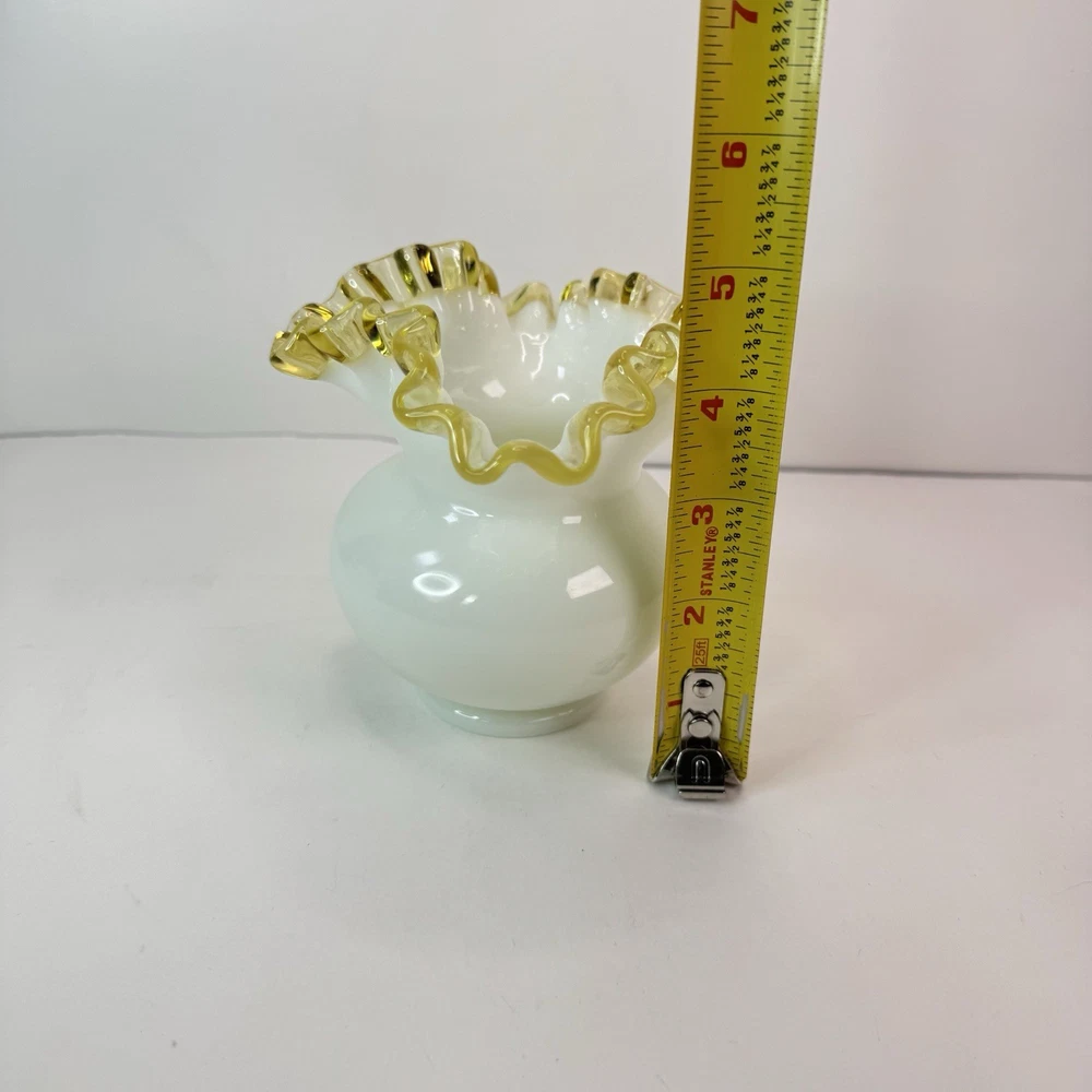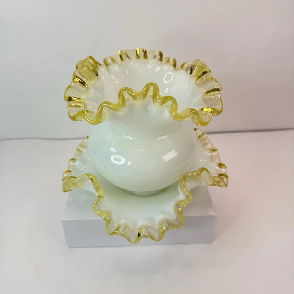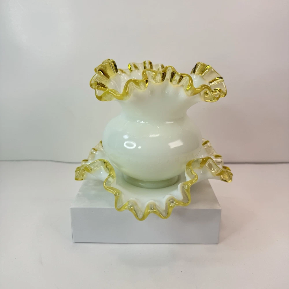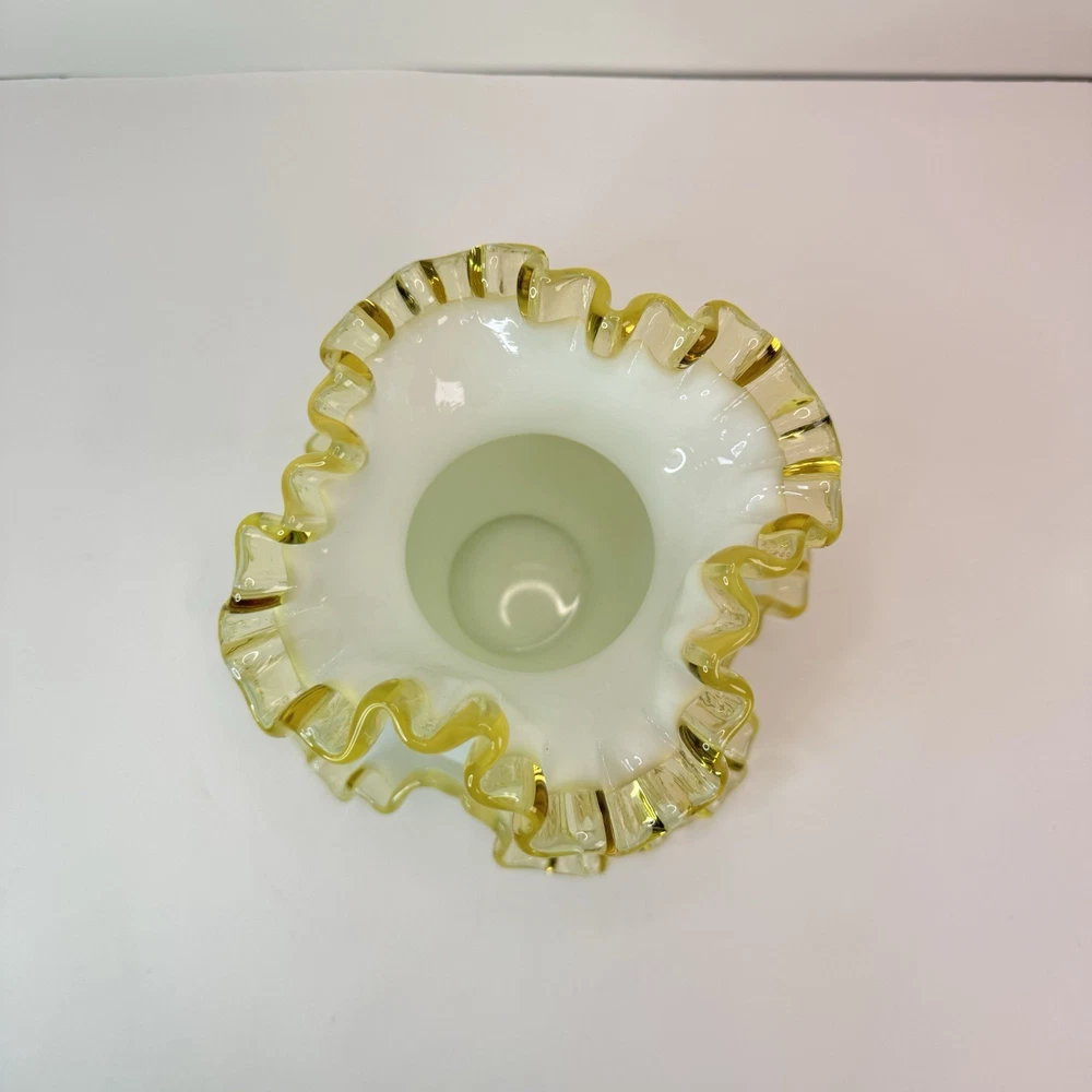 This vintage Fenton melon cased white milk glass vase tray features a ruffled top design in a small size. Handmade in the United States using a hand-blown glassmaking technique, this glossy yellow vase is a beautiful and unique decorative collectible piece. Perfect for collectors or those looking to add a touch of vintage charm to their home, this Fenton vase is a true artisanal treasure. Excellent used condition. No chips or cracks.