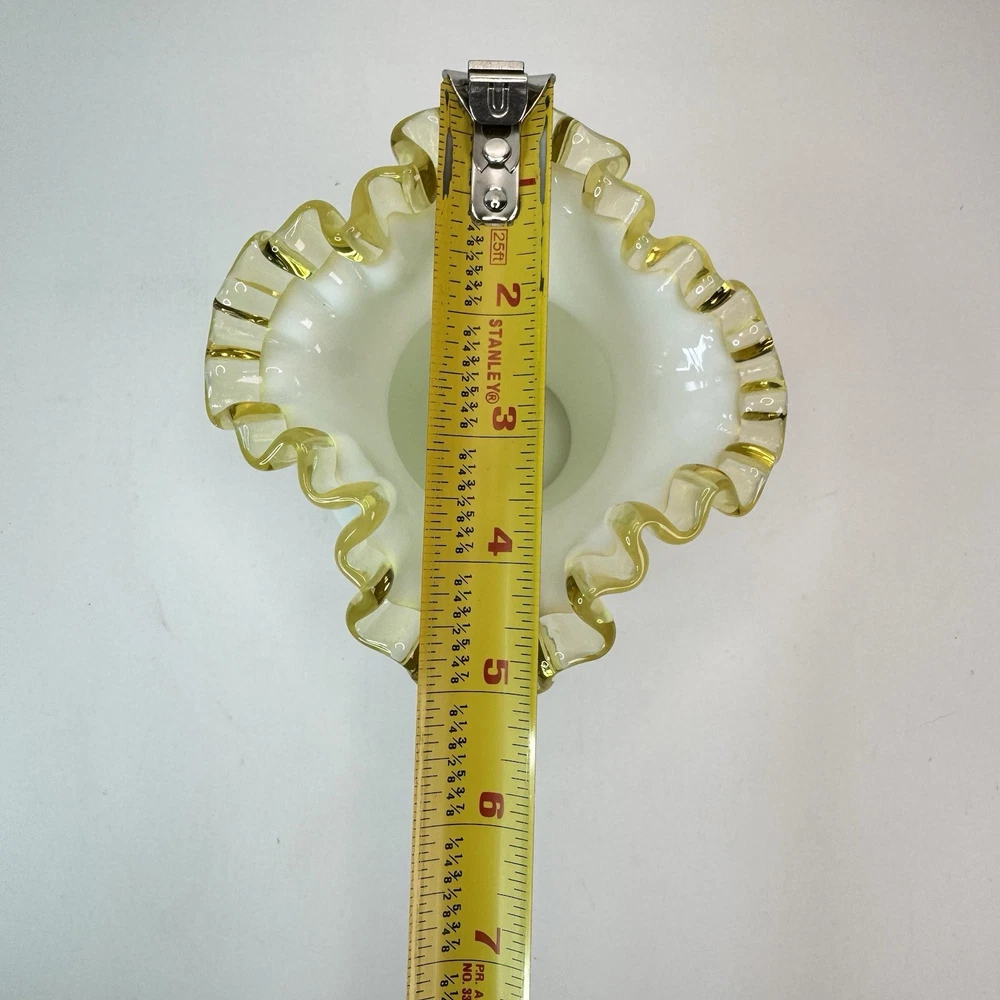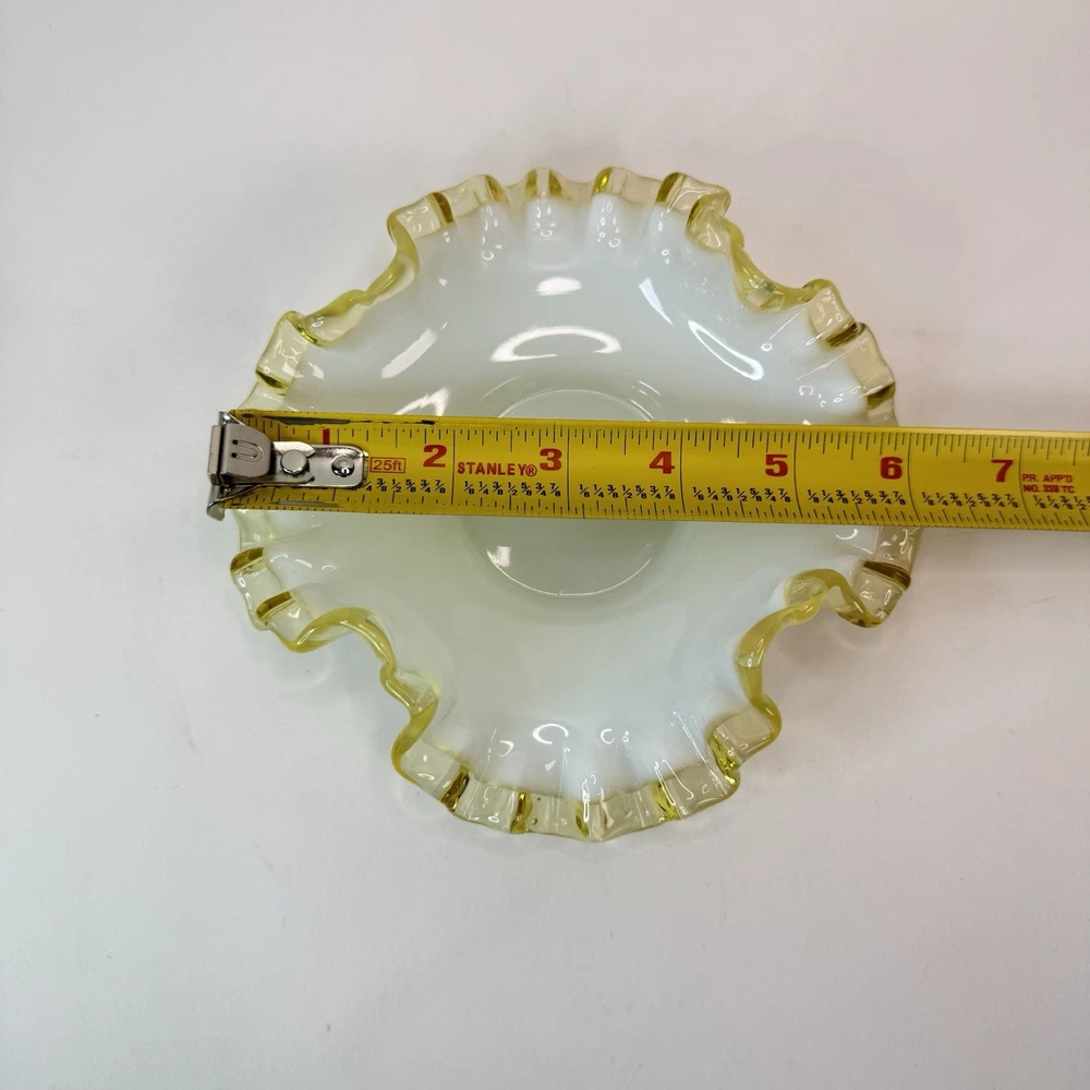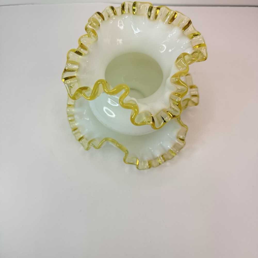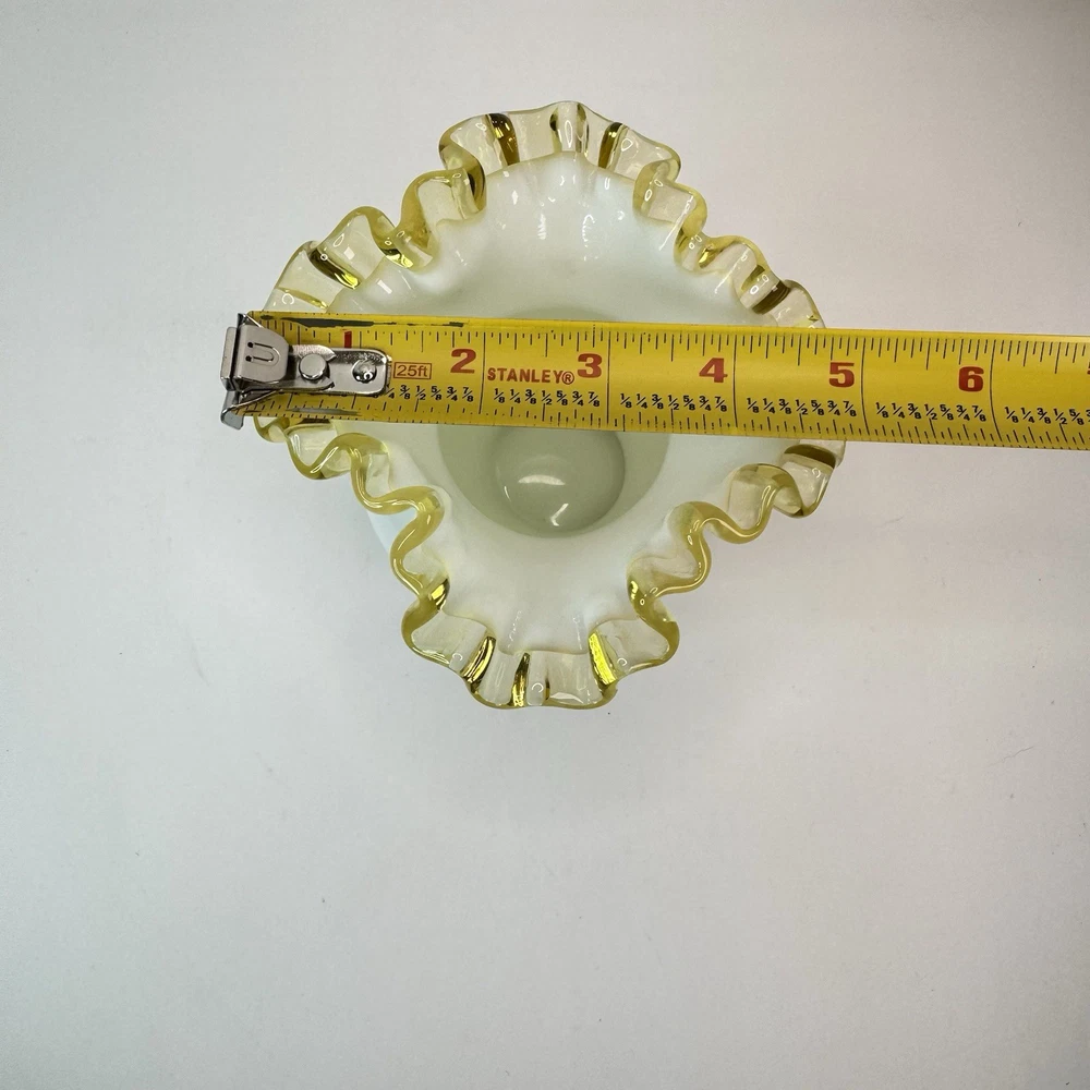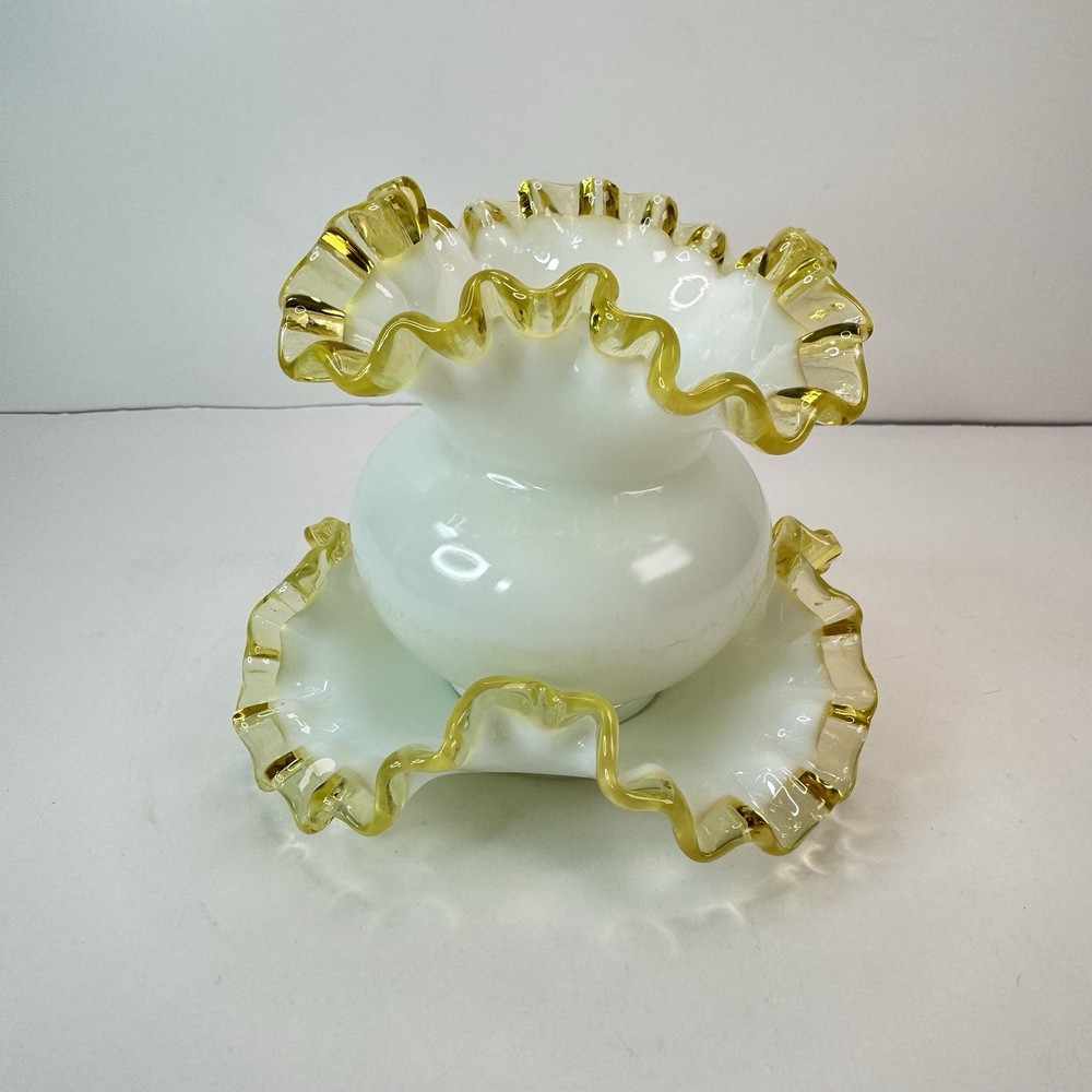 This vintage Fenton melon cased white milk glass vase tray features a ruffled top design in a small size. Handmade in the United States using a hand-blown glassmaking technique, this glossy yellow vase is a beautiful and unique decorative collectible piece. Perfect for collectors or those looking to add a touch of vintage charm to their home, this Fenton vase is a true artisanal treasure. Excellent used condition. No chips or cracks.