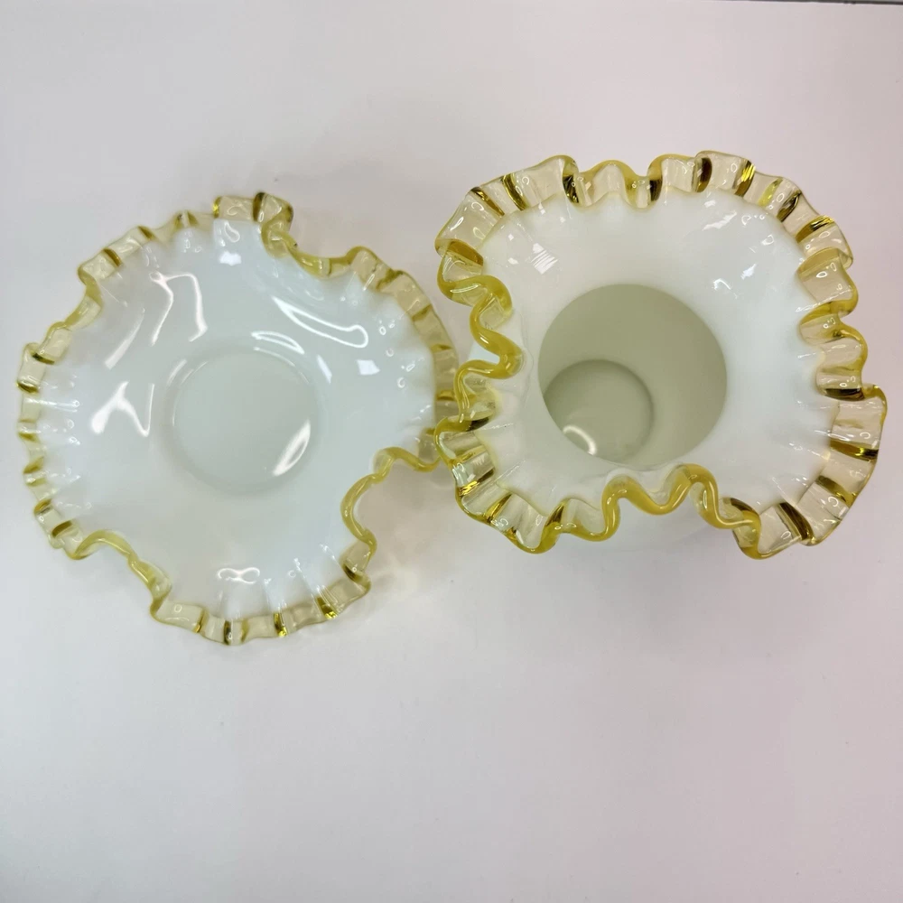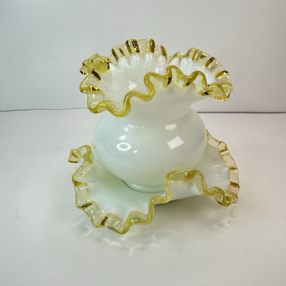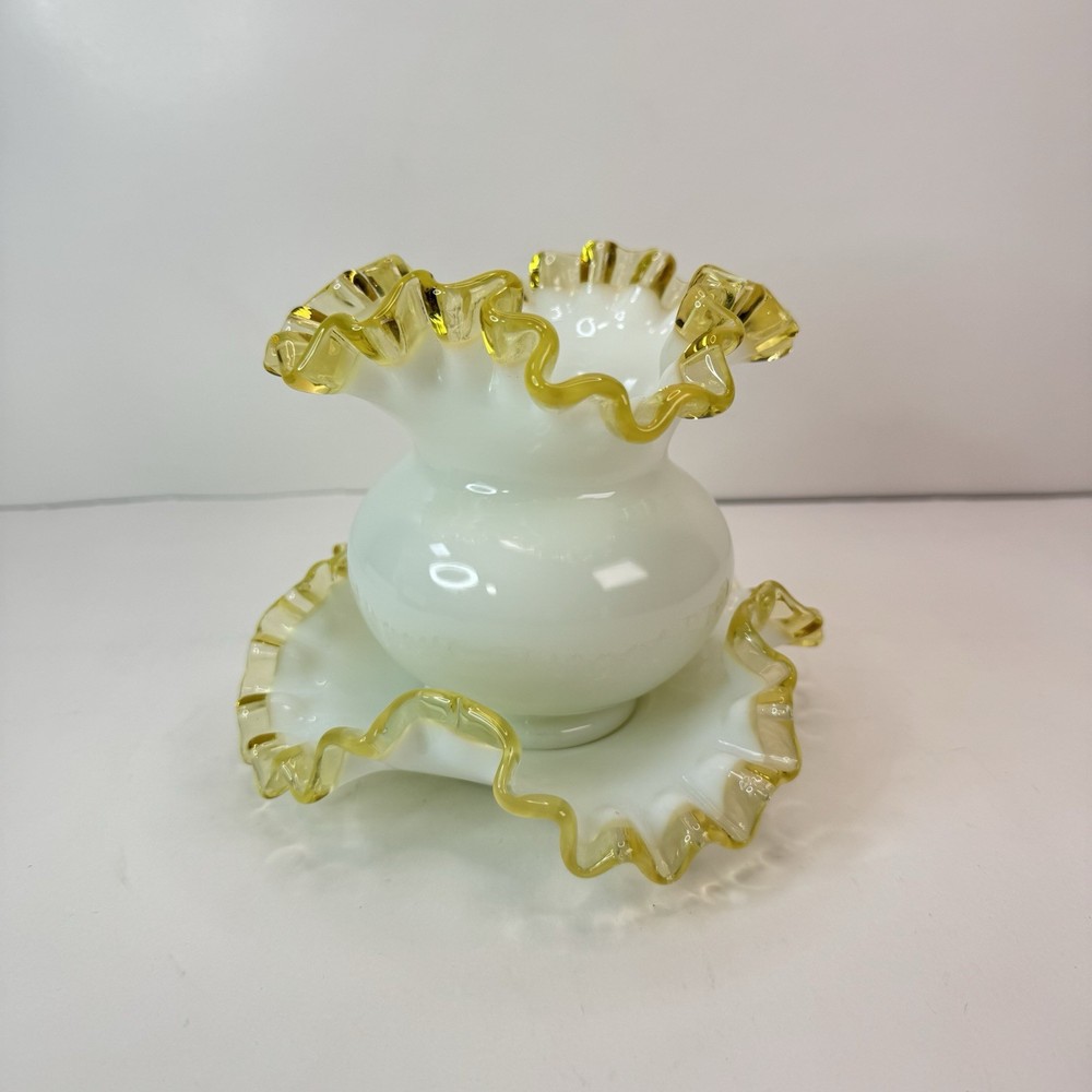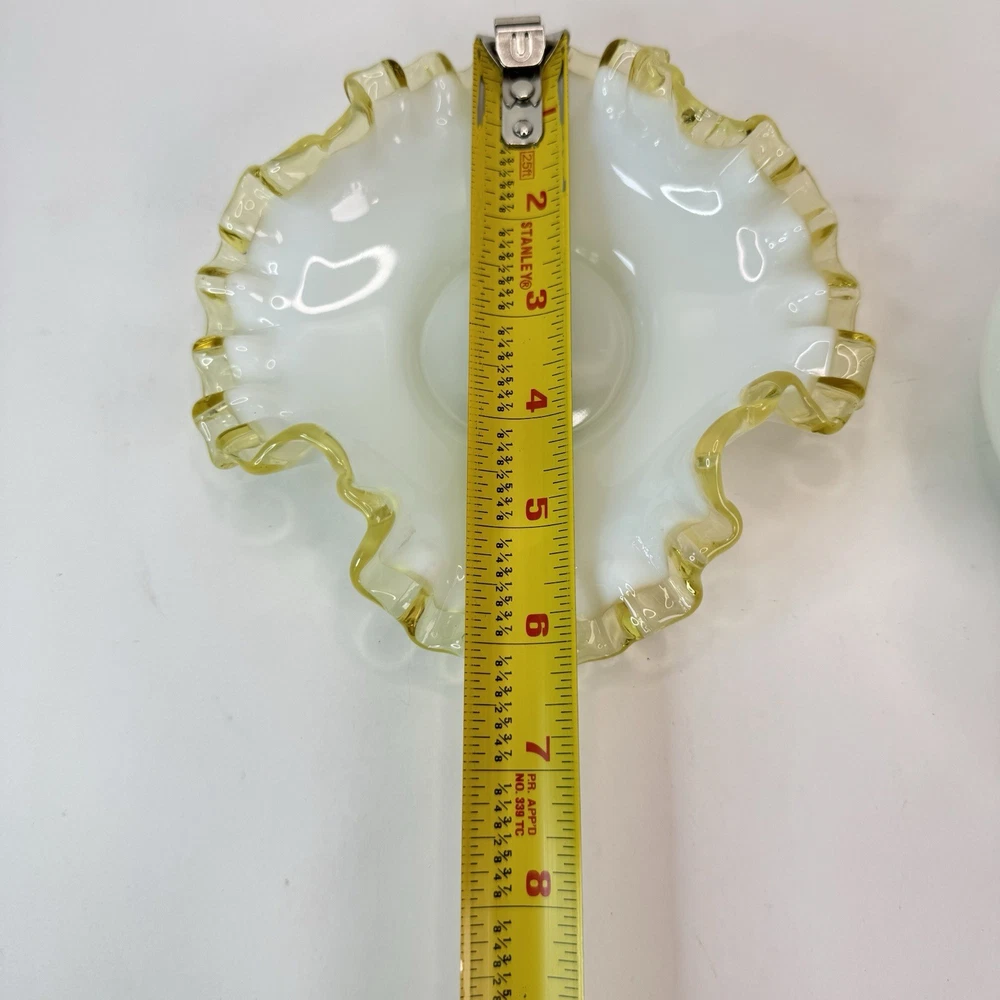 This vintage Fenton melon cased white milk glass vase tray features a ruffled top design in a small size. Handmade in the United States using a hand-blown glassmaking technique, this glossy yellow vase is a beautiful and unique decorative collectible piece. Perfect for collectors or those looking to add a touch of vintage charm to their home, this Fenton vase is a true artisanal treasure. Excellent used condition. No chips or cracks.