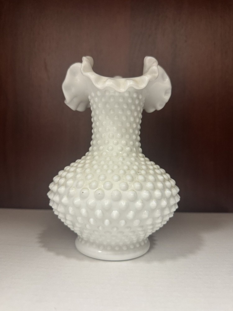 Valentines is coming up! Any lady would love flowers in this vase. Vintage Fenton Milk Glass Vase from the mid 20th Century, featuring a ruffled pattern in white glass. This original mid-century modern piece from North America is part of the hobnail product line by Fenton. The vase has a glossy finish and is made of fused glass. It is a classic example of American glassware production, showcasing a timeless ruffled design.